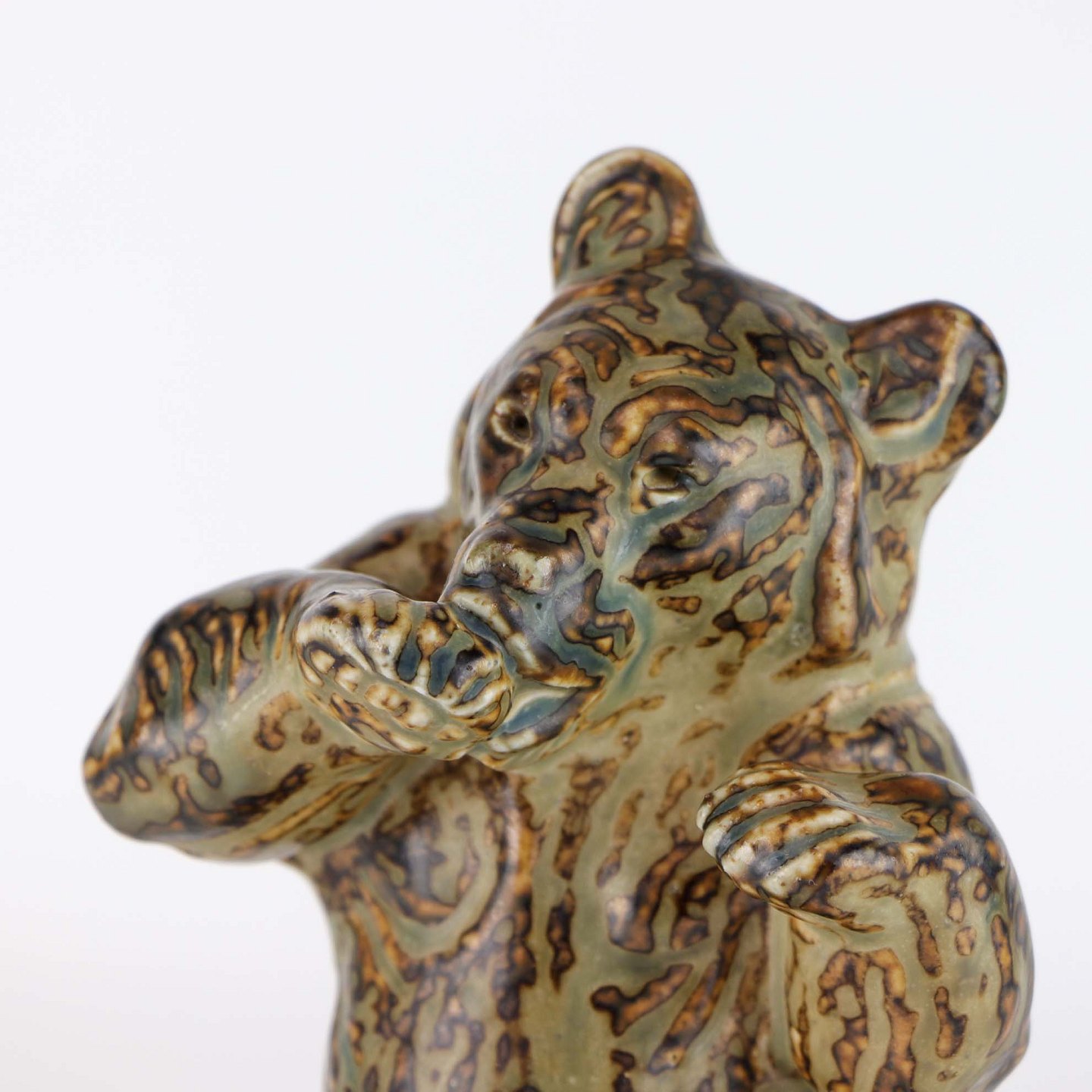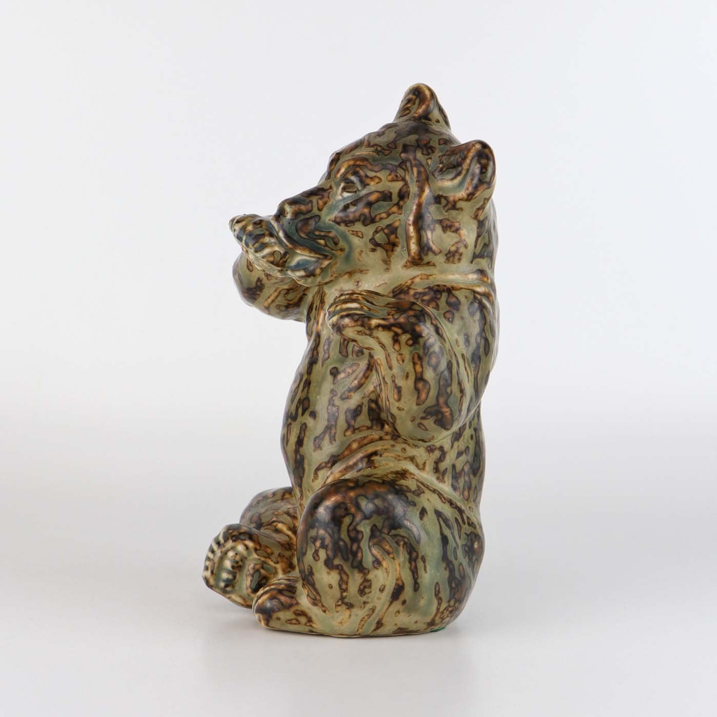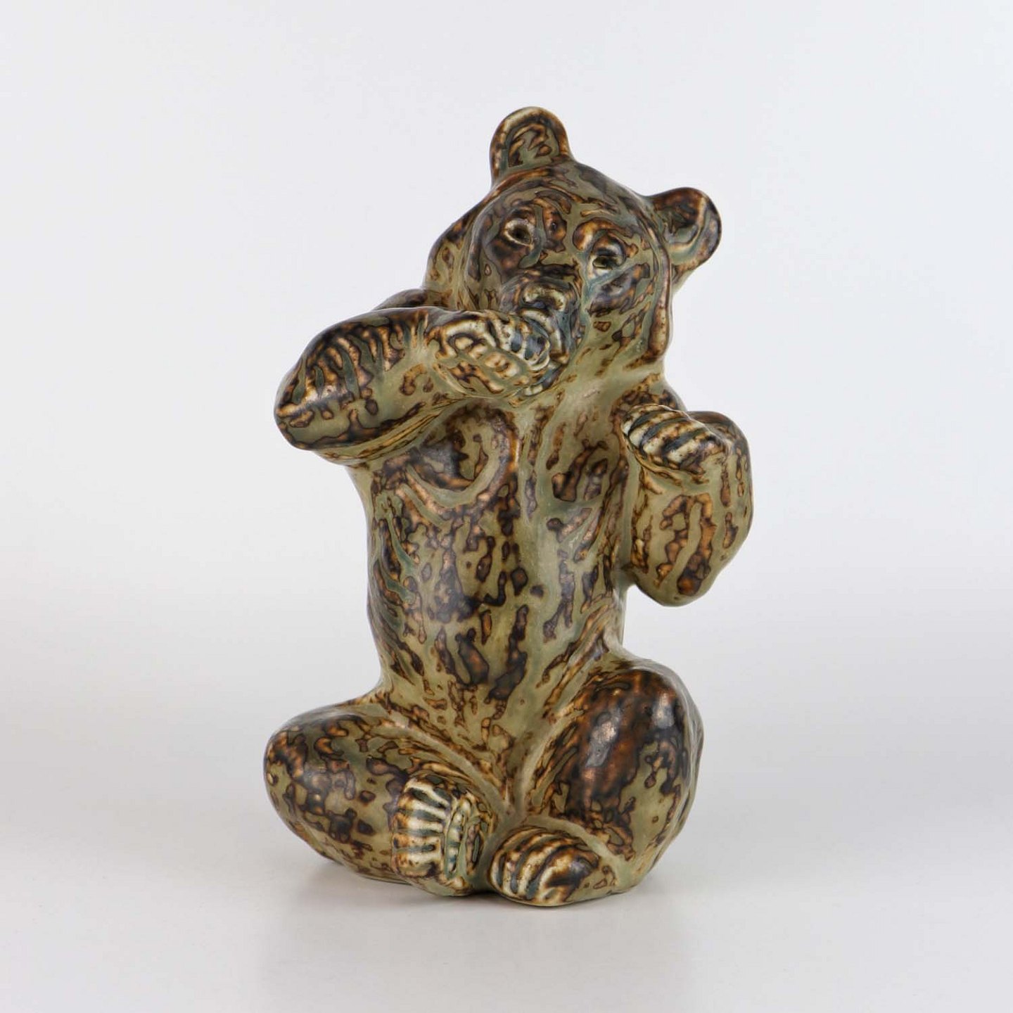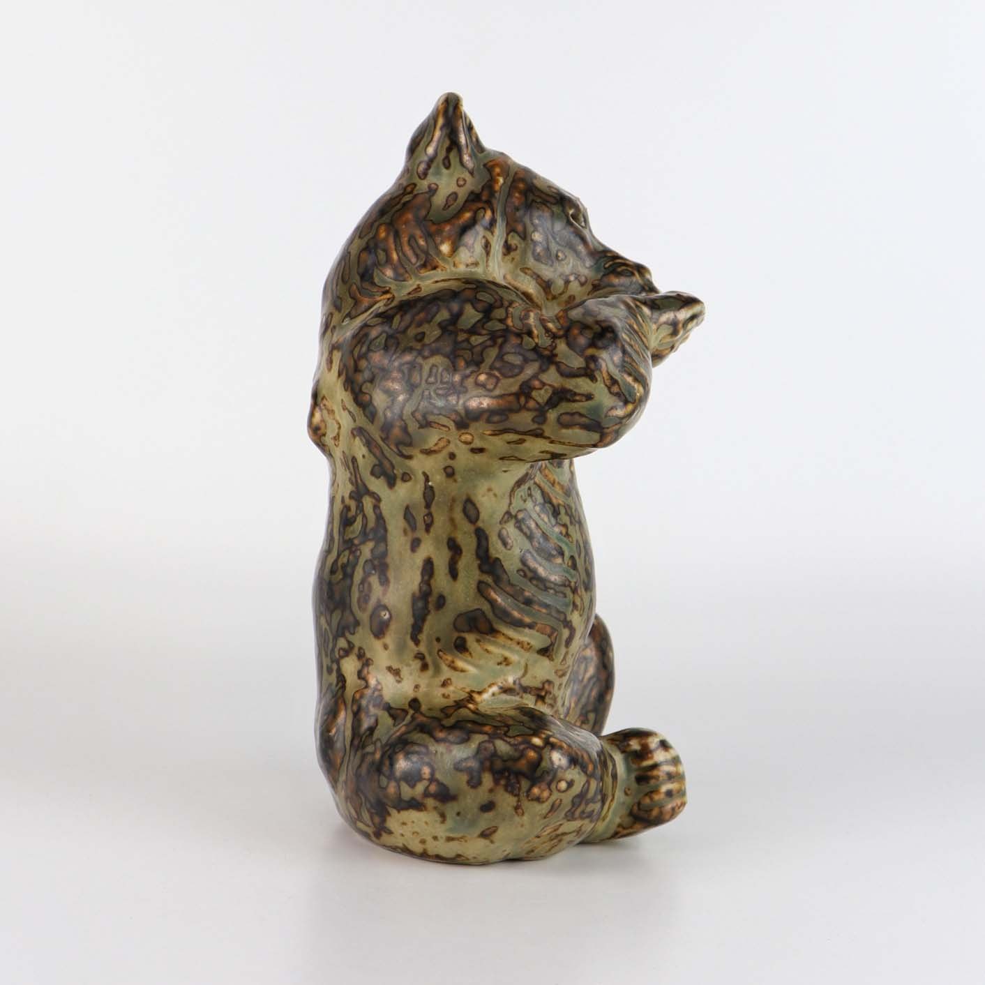 Figur i stentøj med motiv af siddende bjørn, som slikker poten. Nr. 21675
