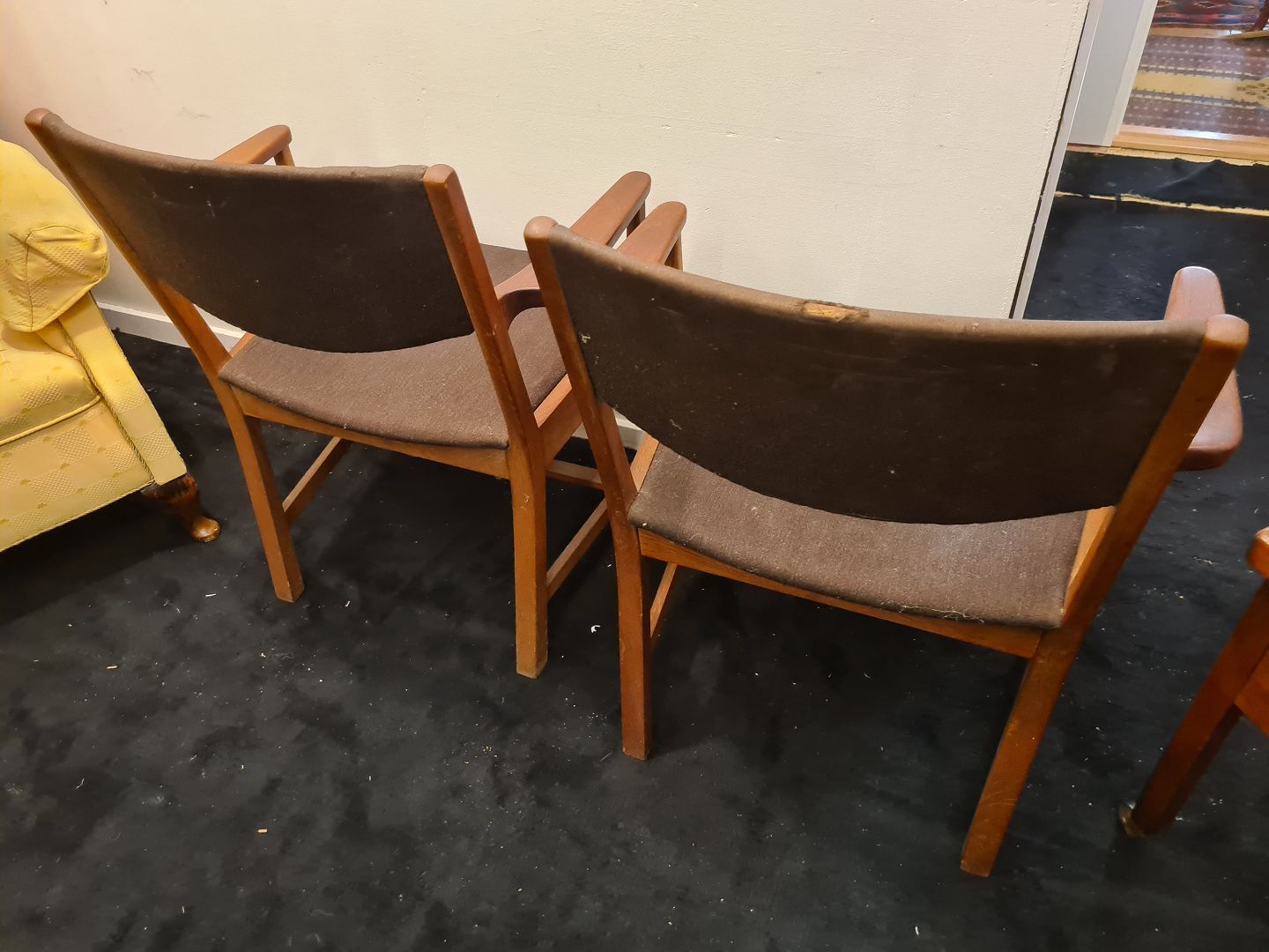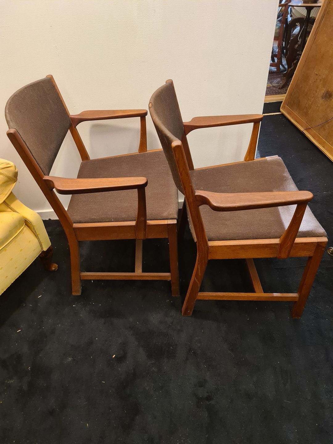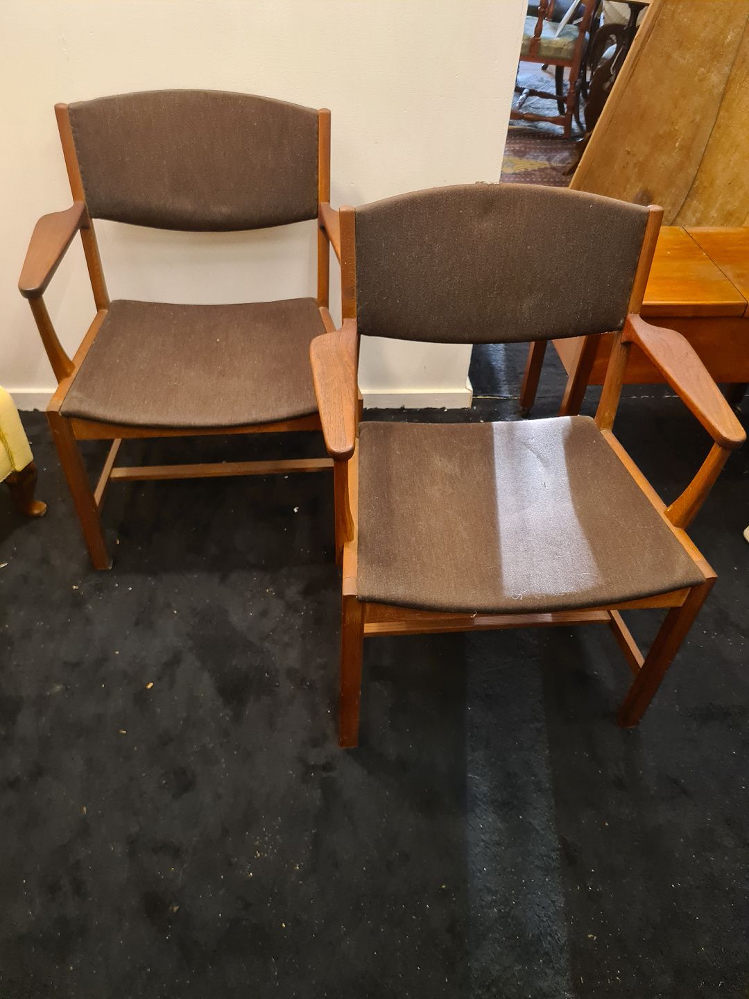 Sorø Stolefabrik par armstole i egetræ med armlæn i massiv teak samt betrukket med stof på sæde og ryg. Produceret ca. 1970'erne.