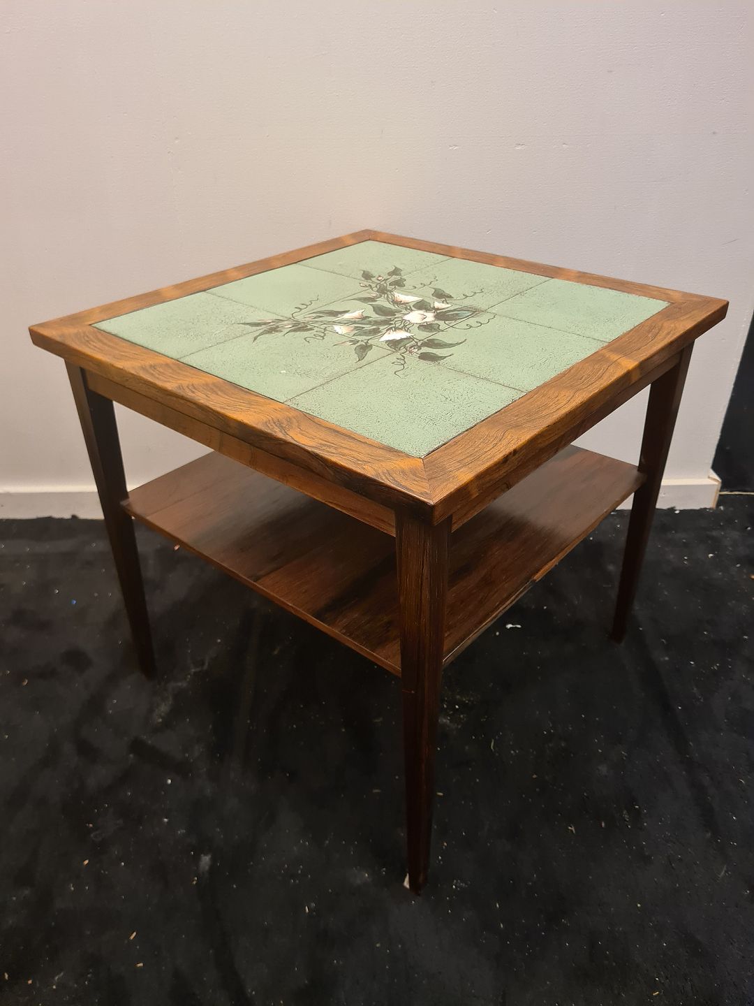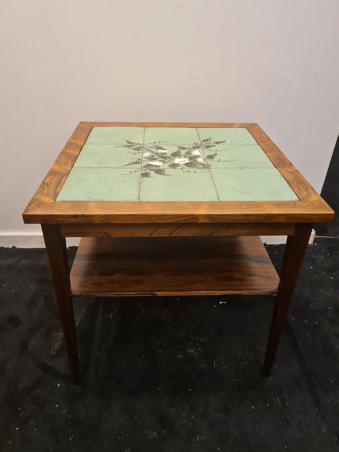 Dansk møbelproducent kvadratisk sofabord med hylde. Udført i fineret palisander samt plade ilagt grønne kakler med blomster dekoration. Fremstillet ca. 1960'erne.
