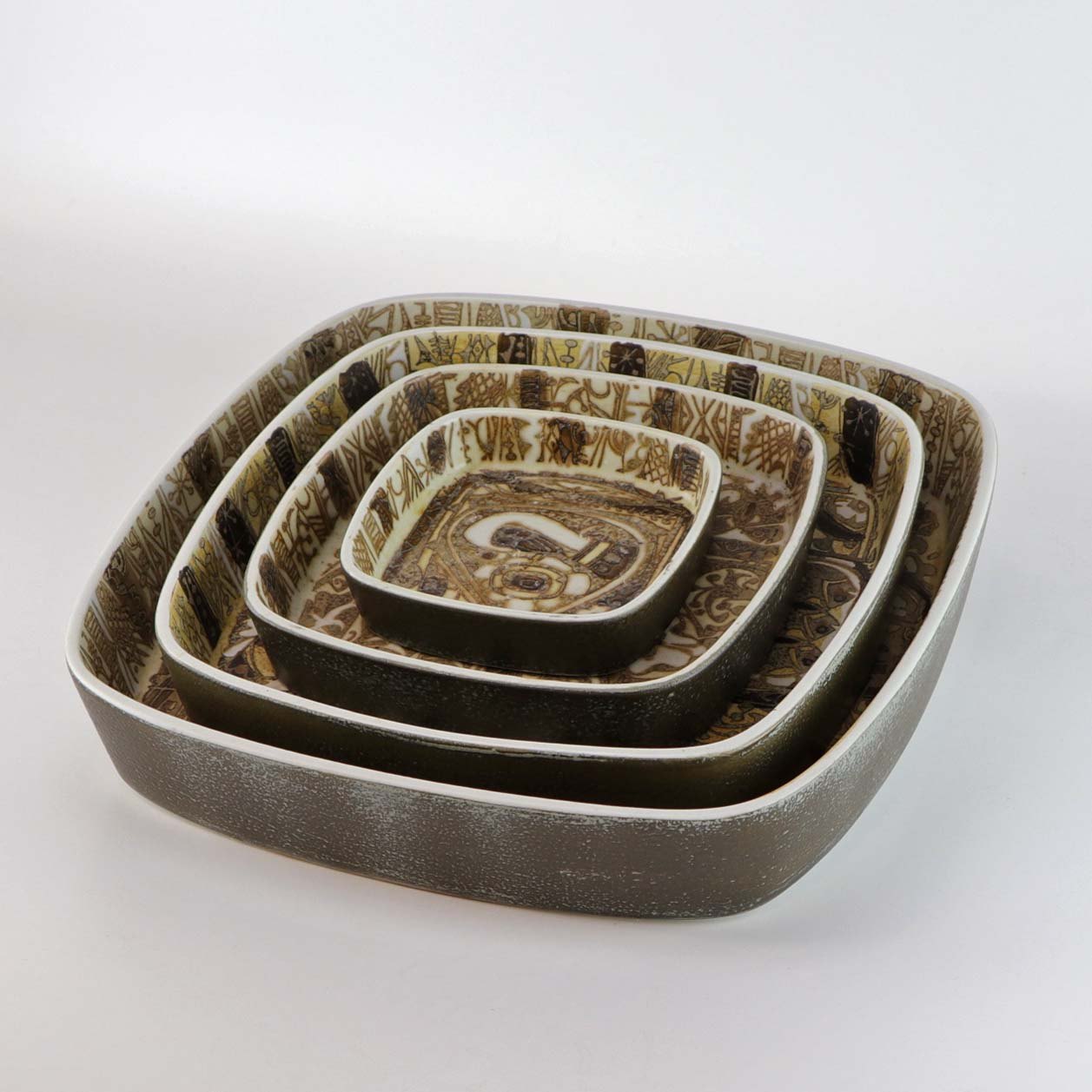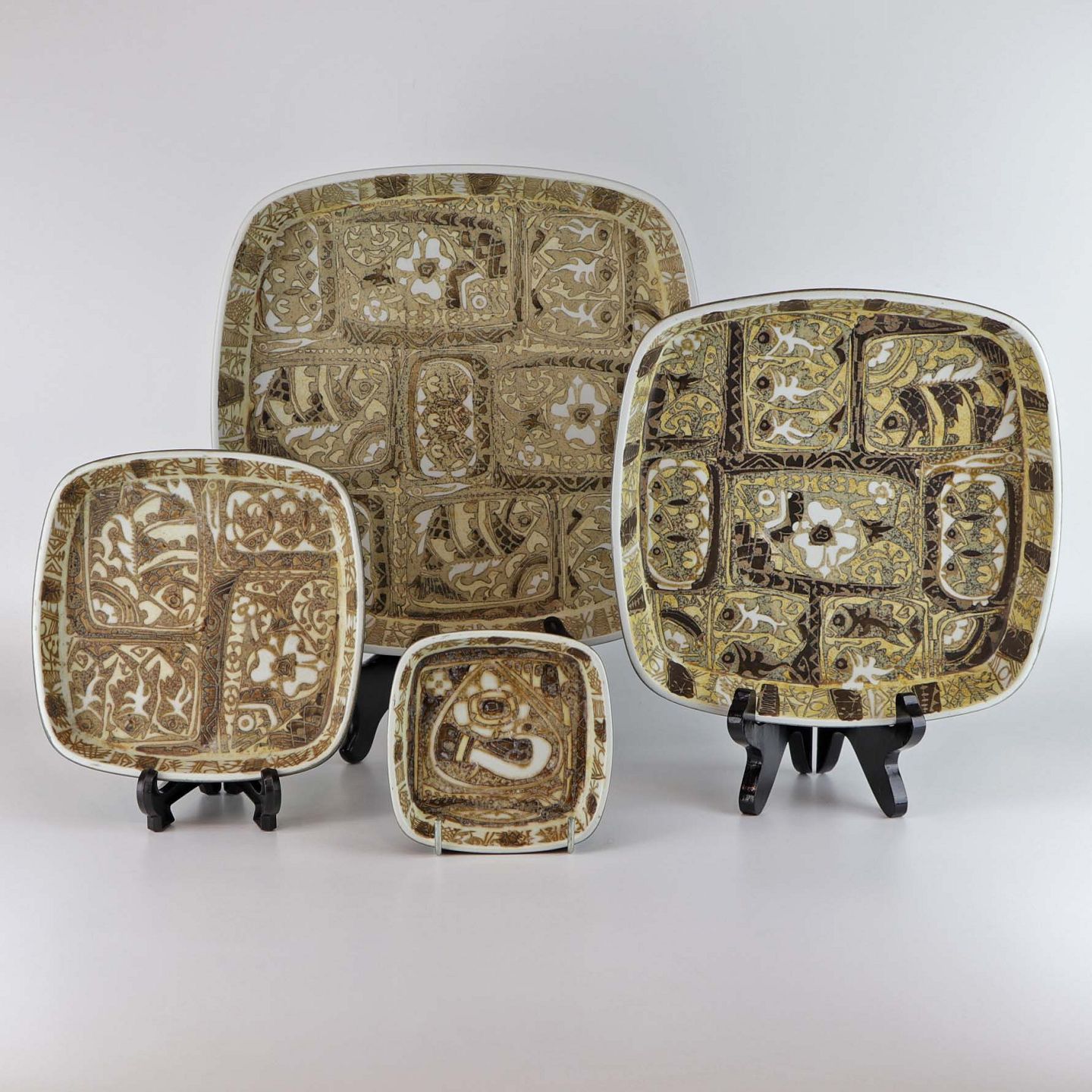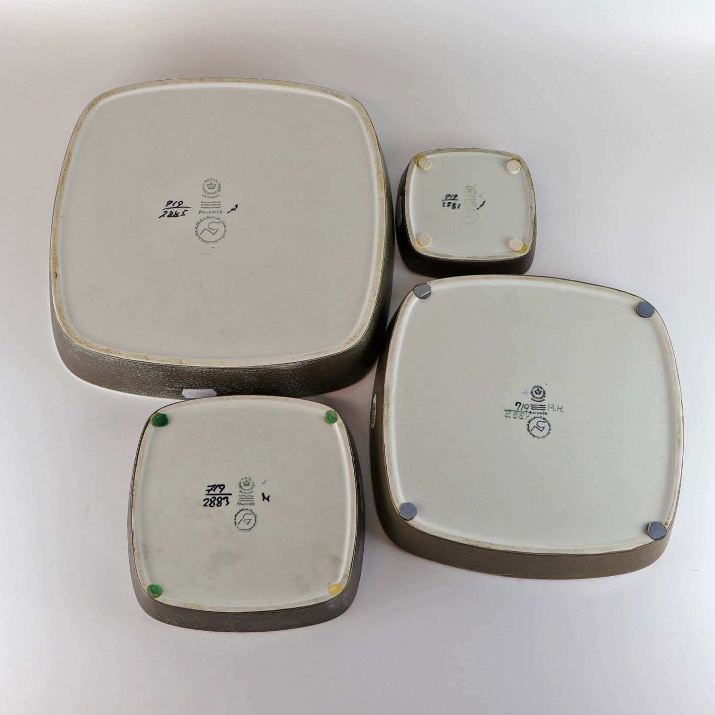 Fade i fajance i fire forskellige størrelser fra Baca serien. Fadene har en firkantet form med abstrakt mønster i hvide og brunlige nuancer. Nr. 719/2882. Nr. 719/2883. Nr. 719/2884 og nr. 719/2885