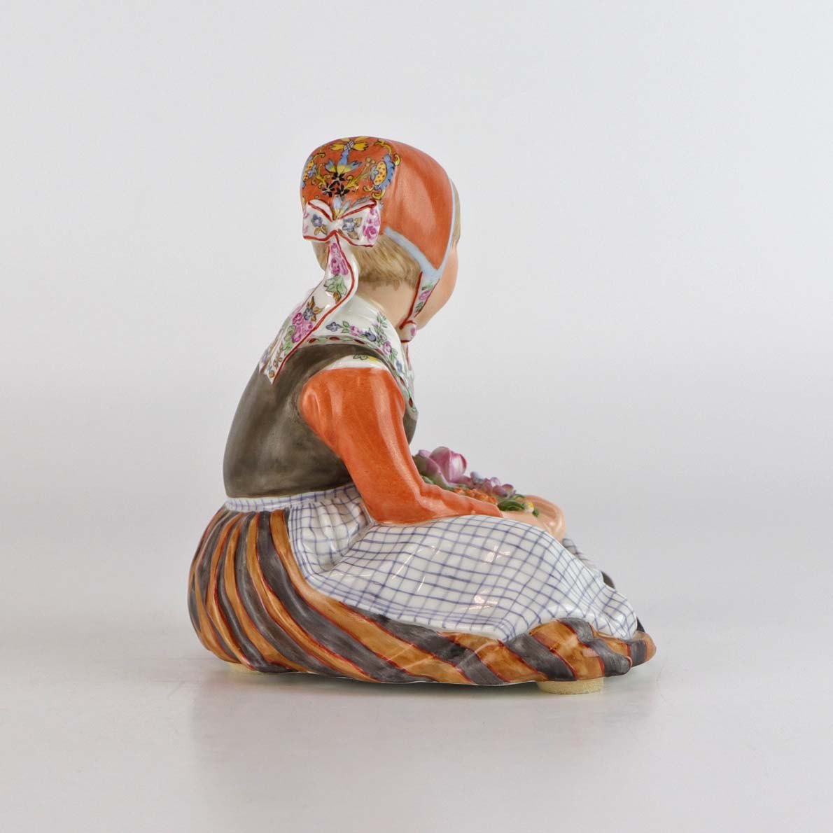 Kongelig figur i porcelæn med motiv af siddende blomsterpige i egnsdragt fra Sjælland. Nr. 12420