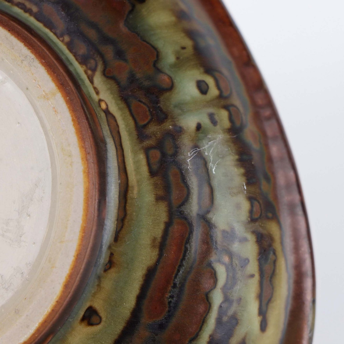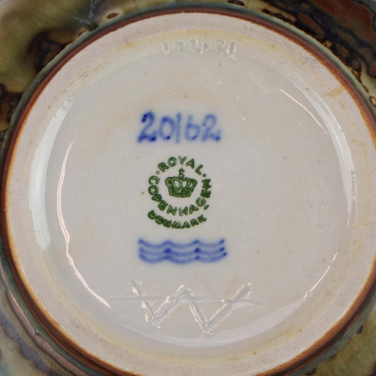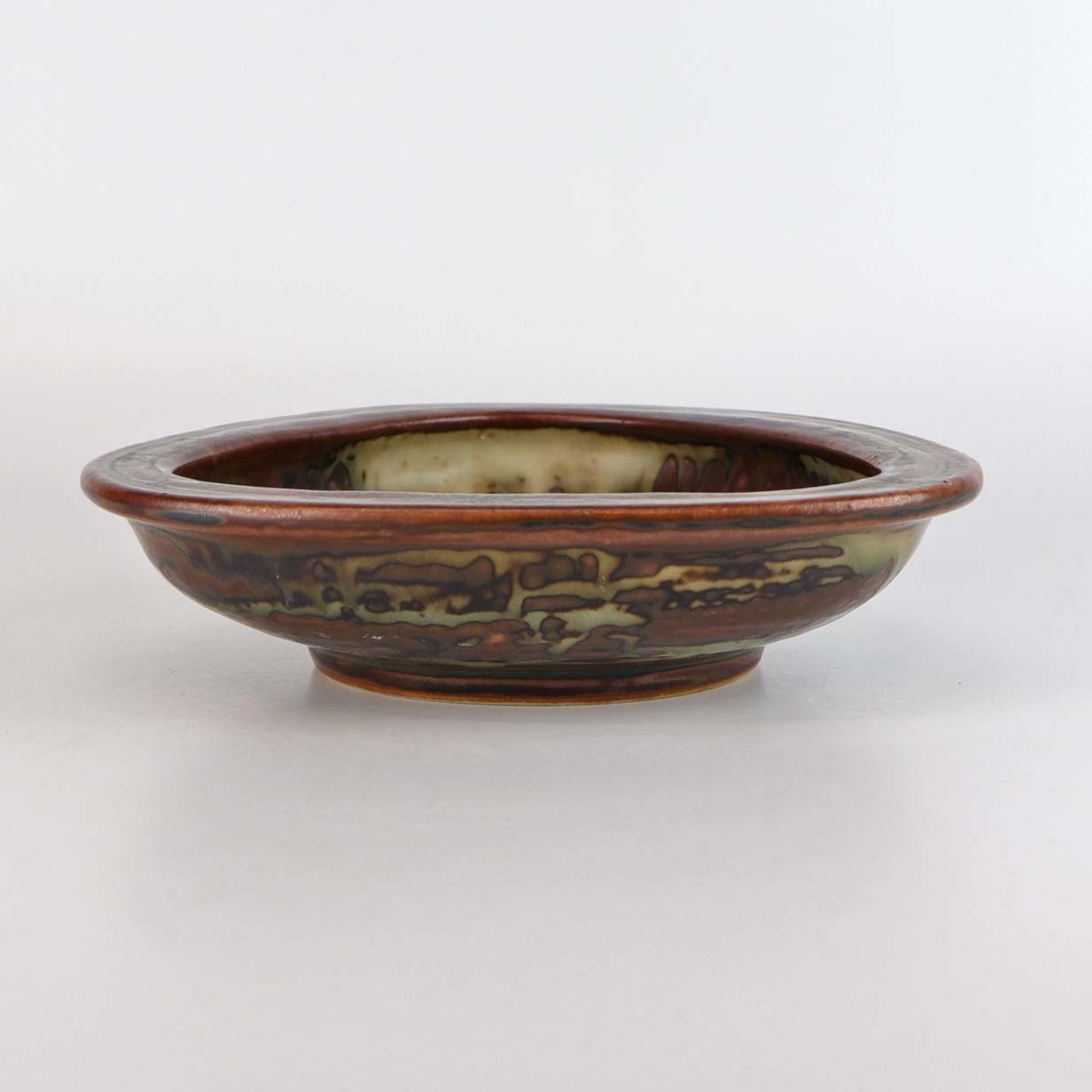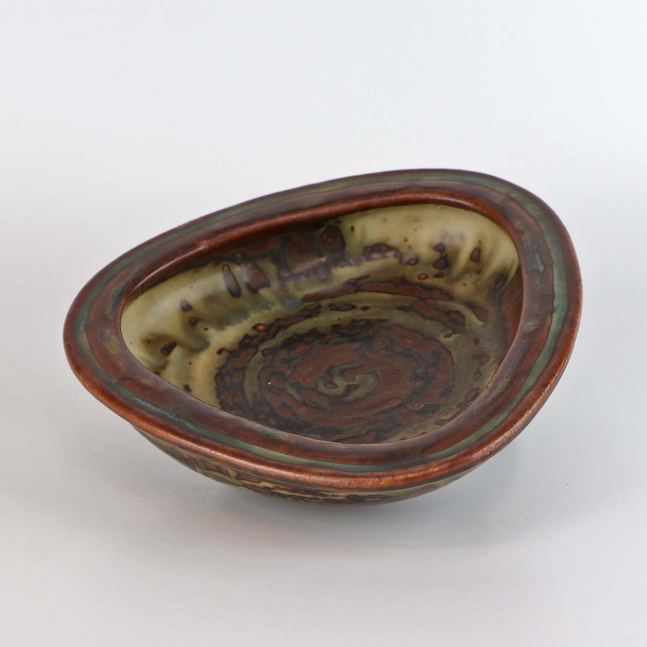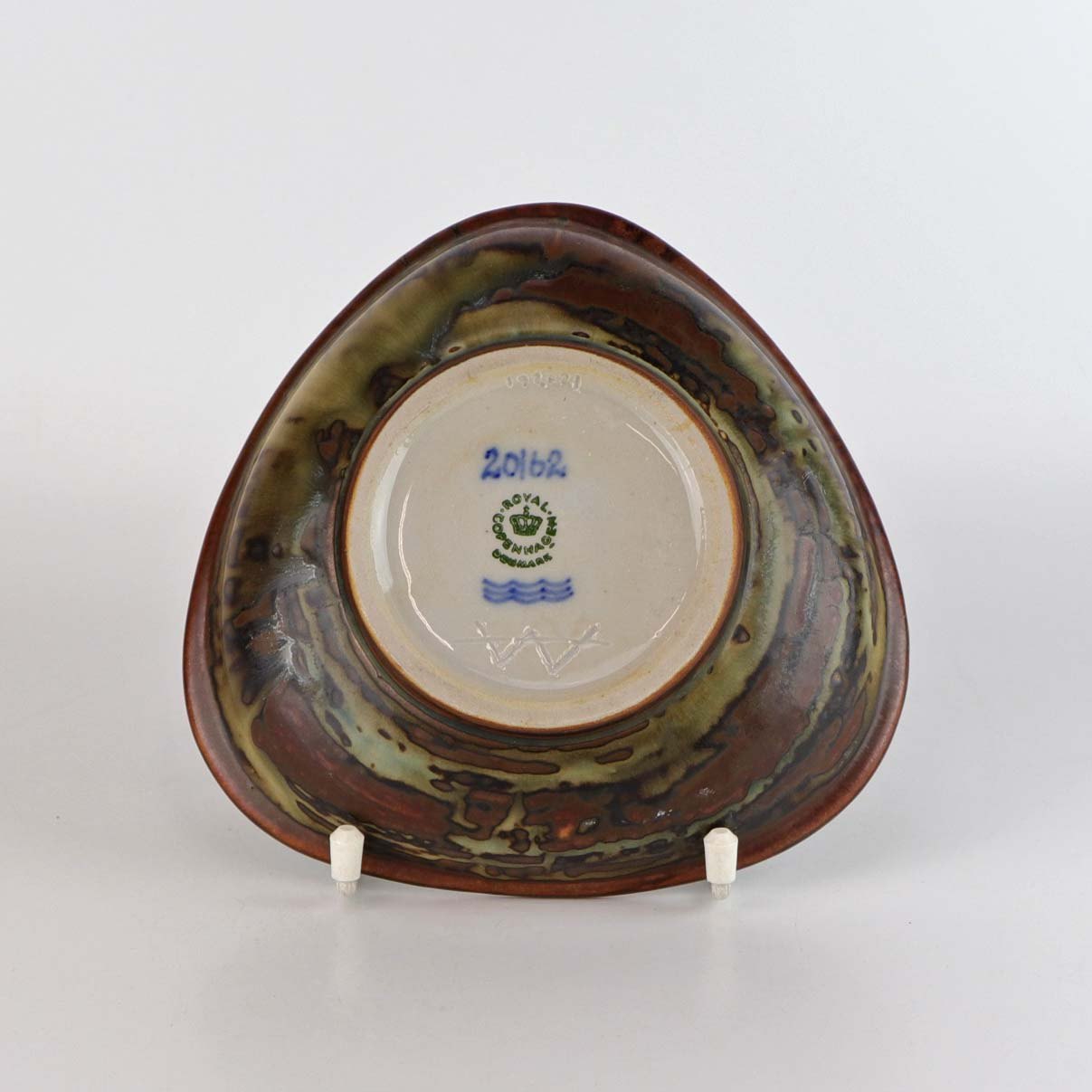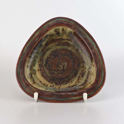 Kongelig trekantet skål i stentøj i brune, grønne og gullige nuancer. Nr. 20162.