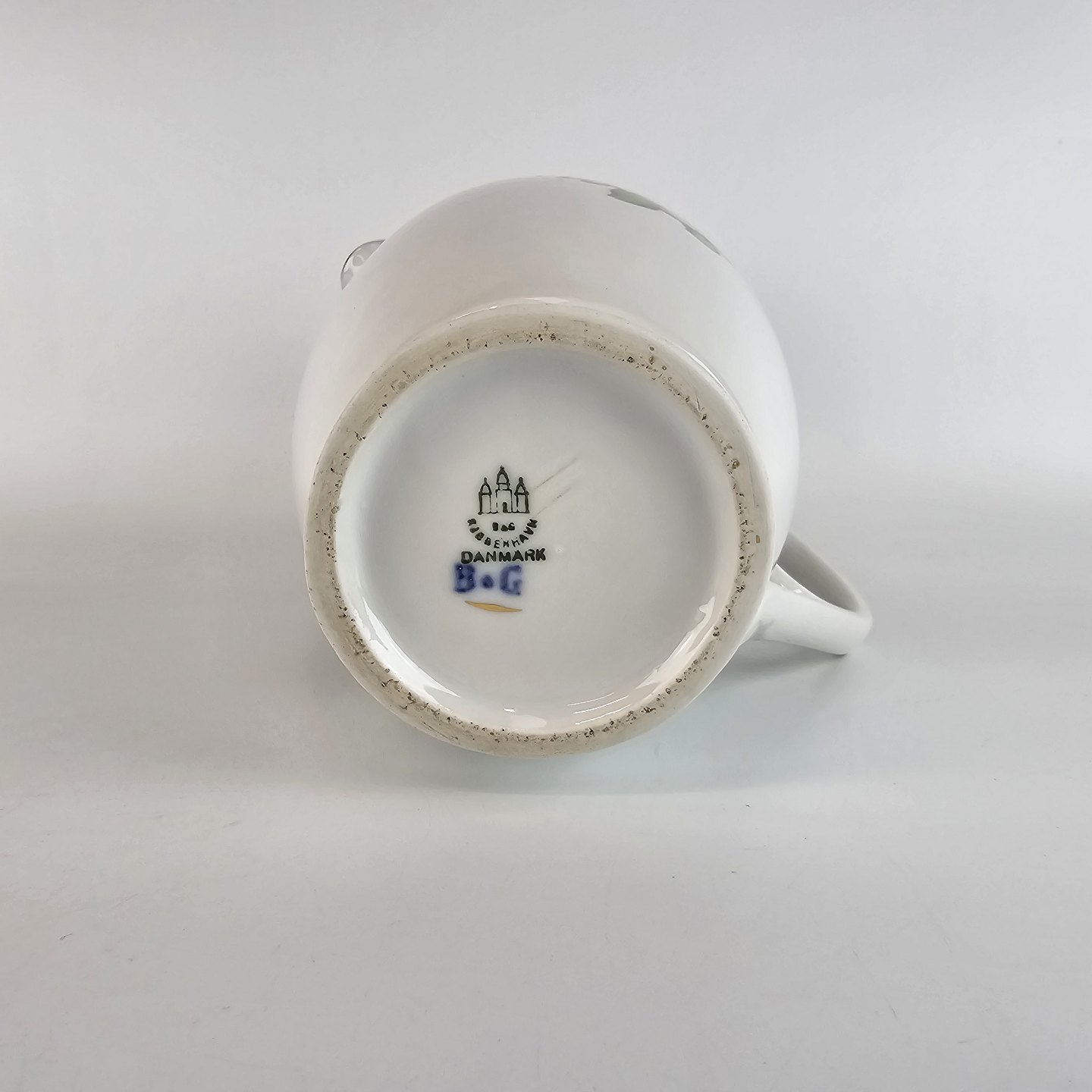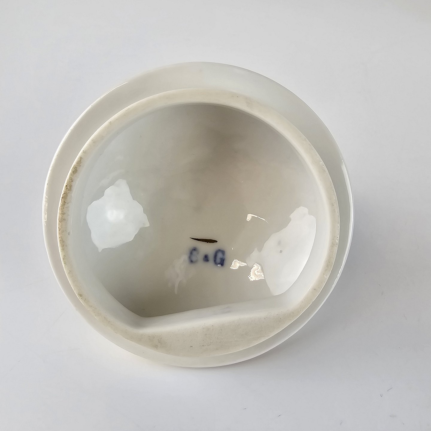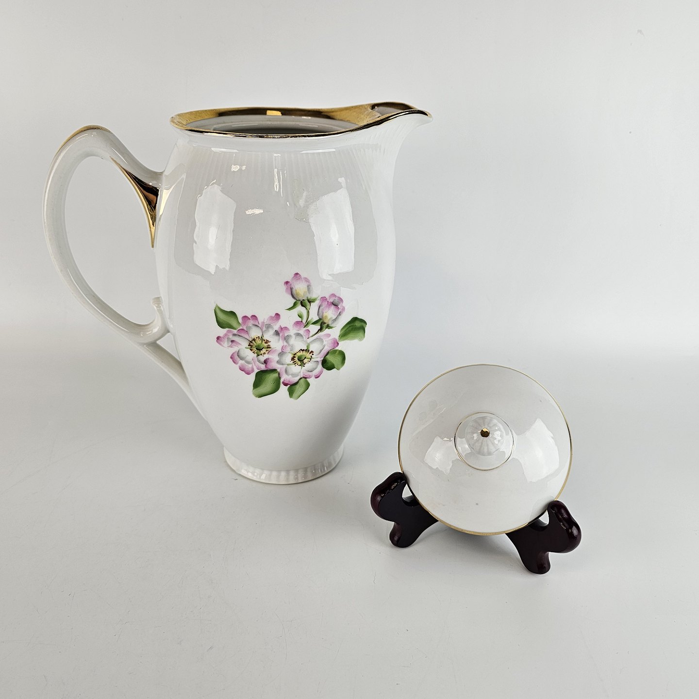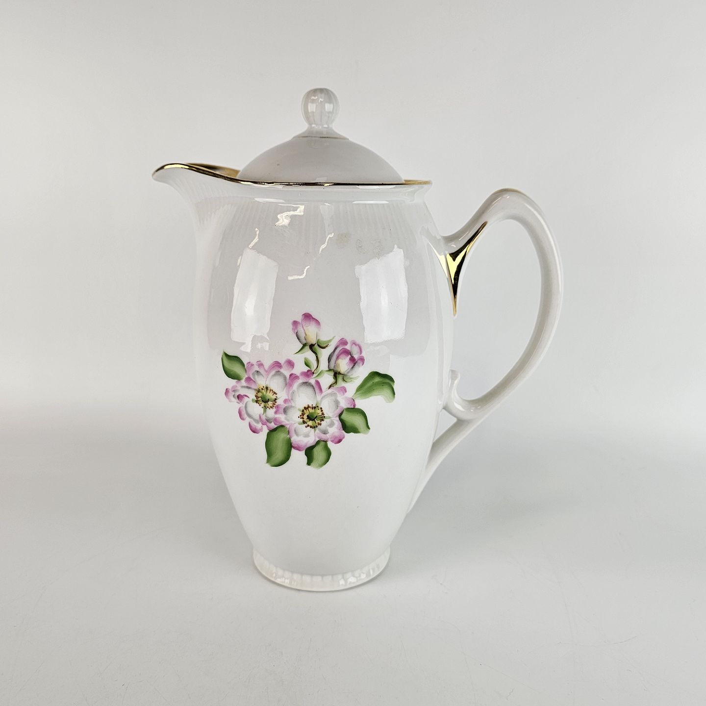 Hvidt riflet porcelæn med guldkant og motiv af æbleblomster.