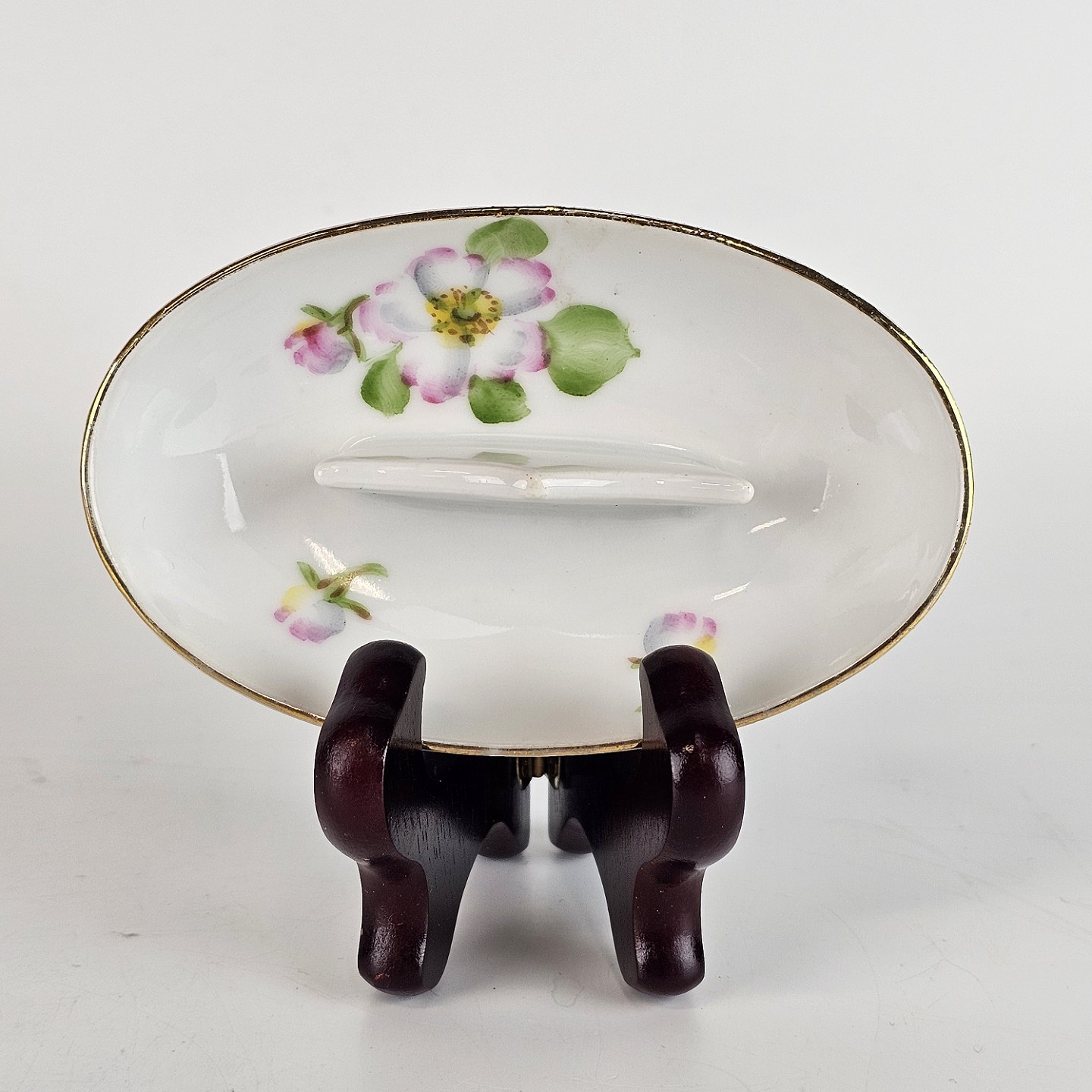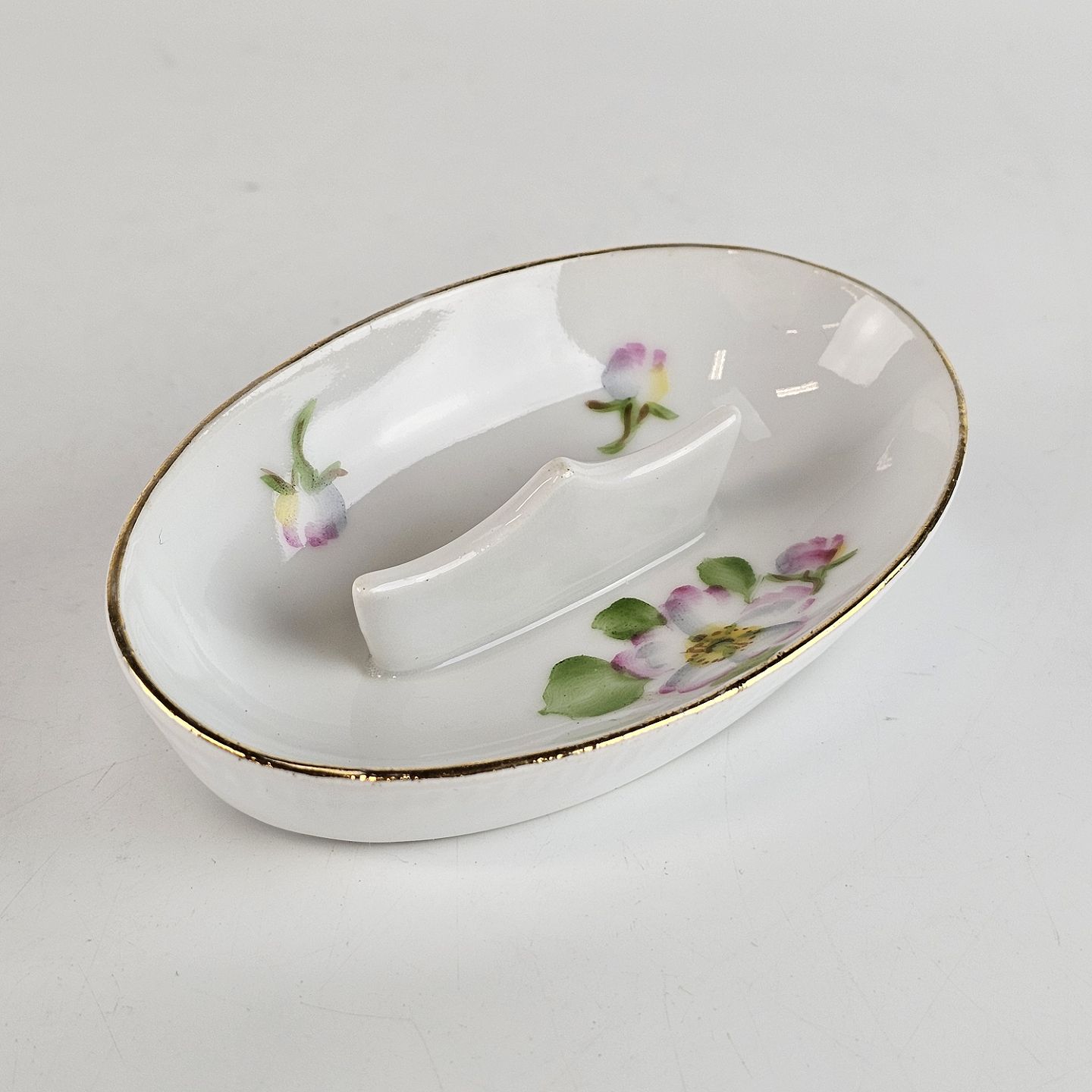 Hvidt riflet porcelæn med guldkant og motiv af æbleblomster.
