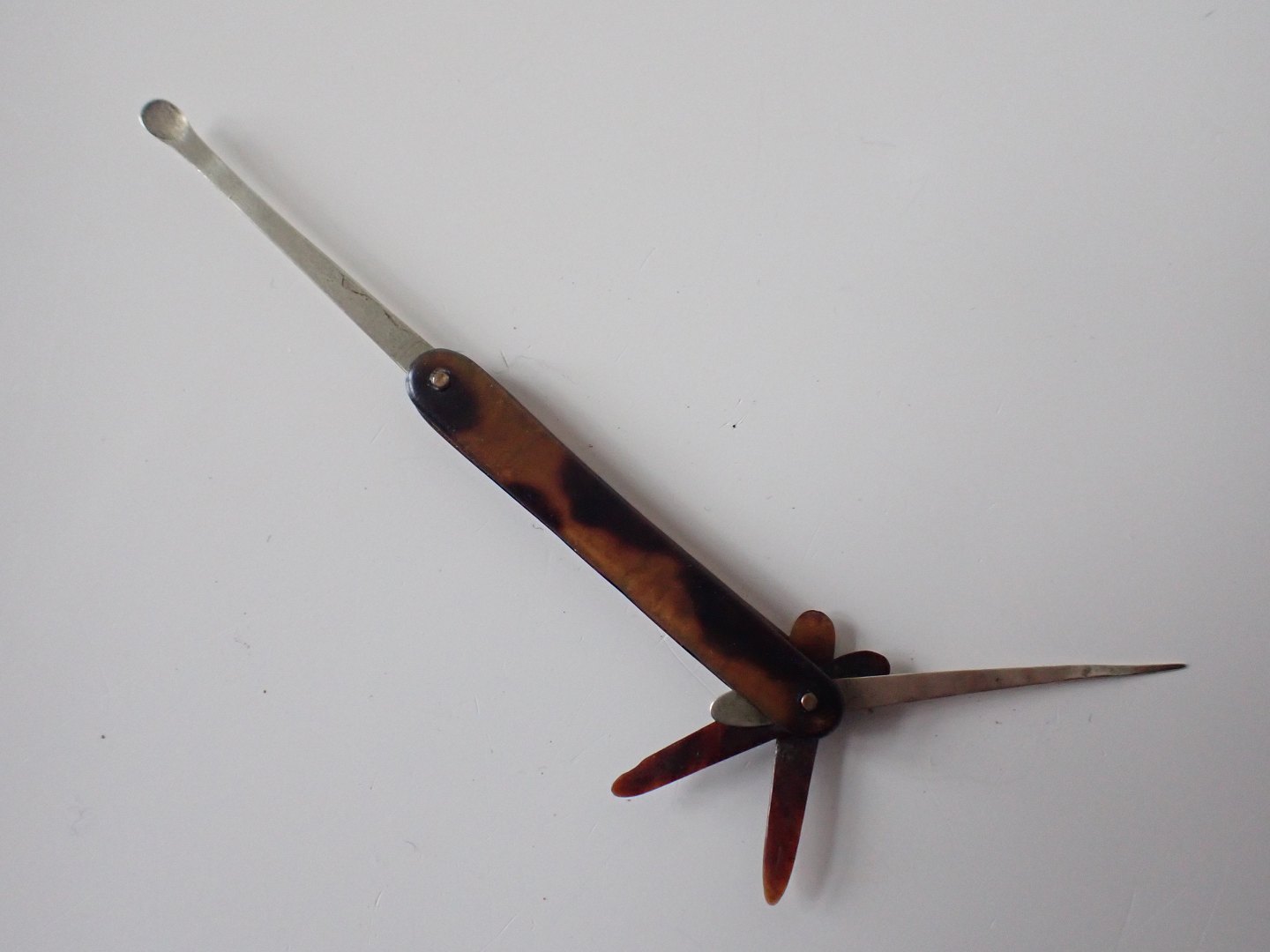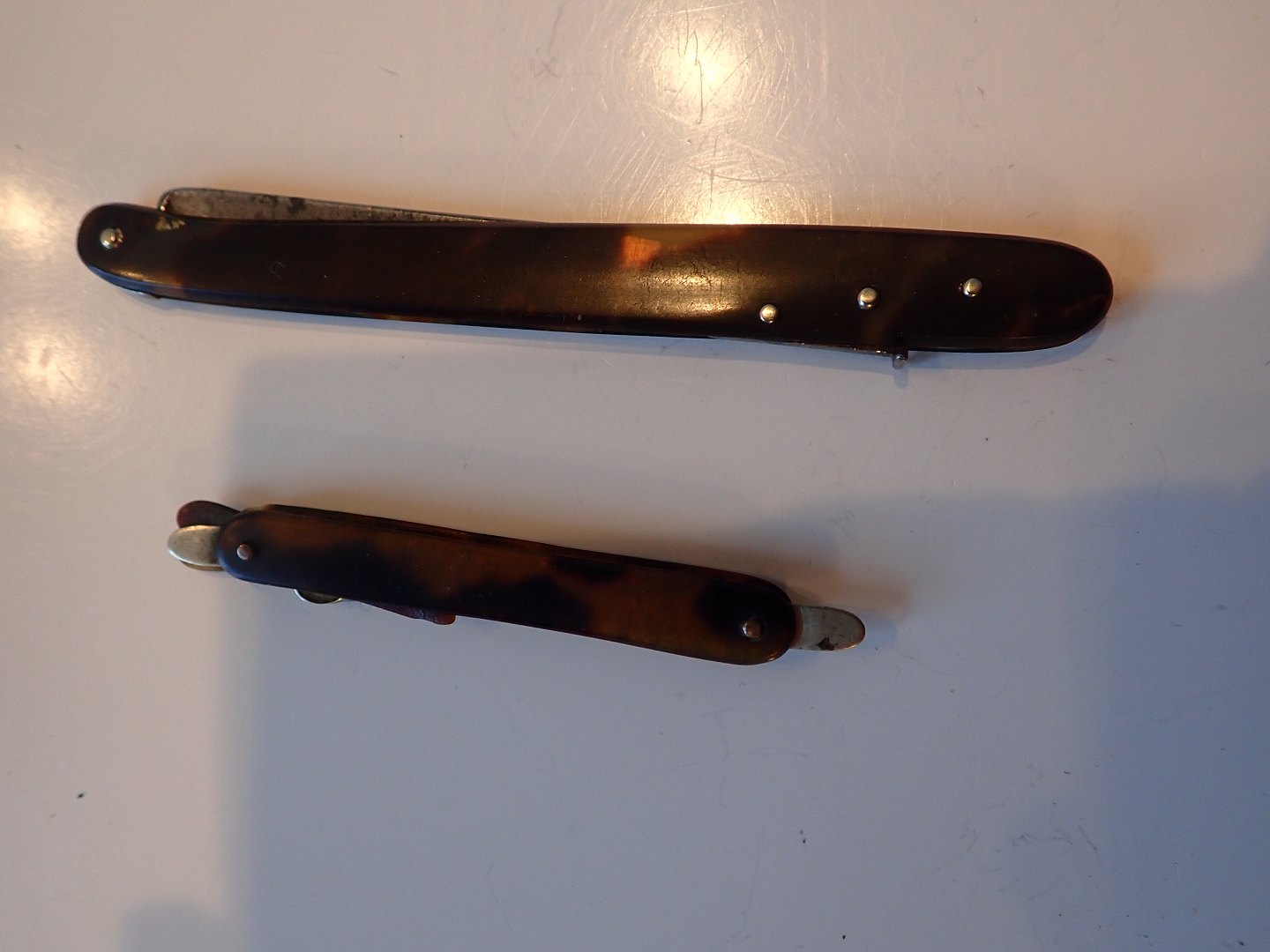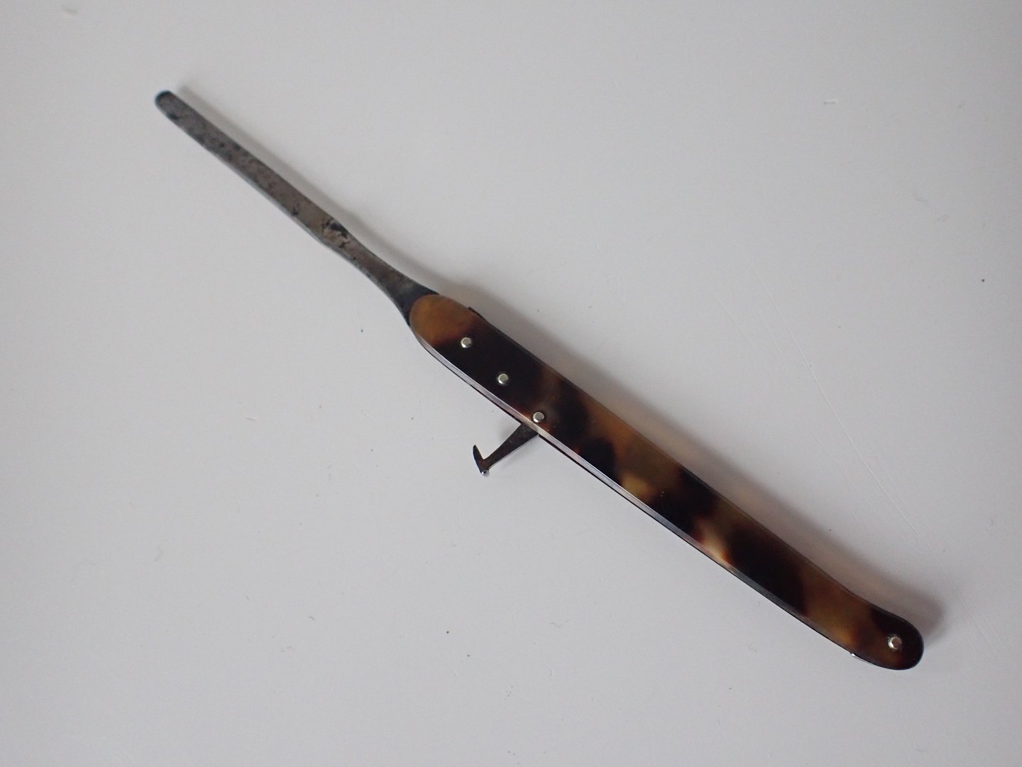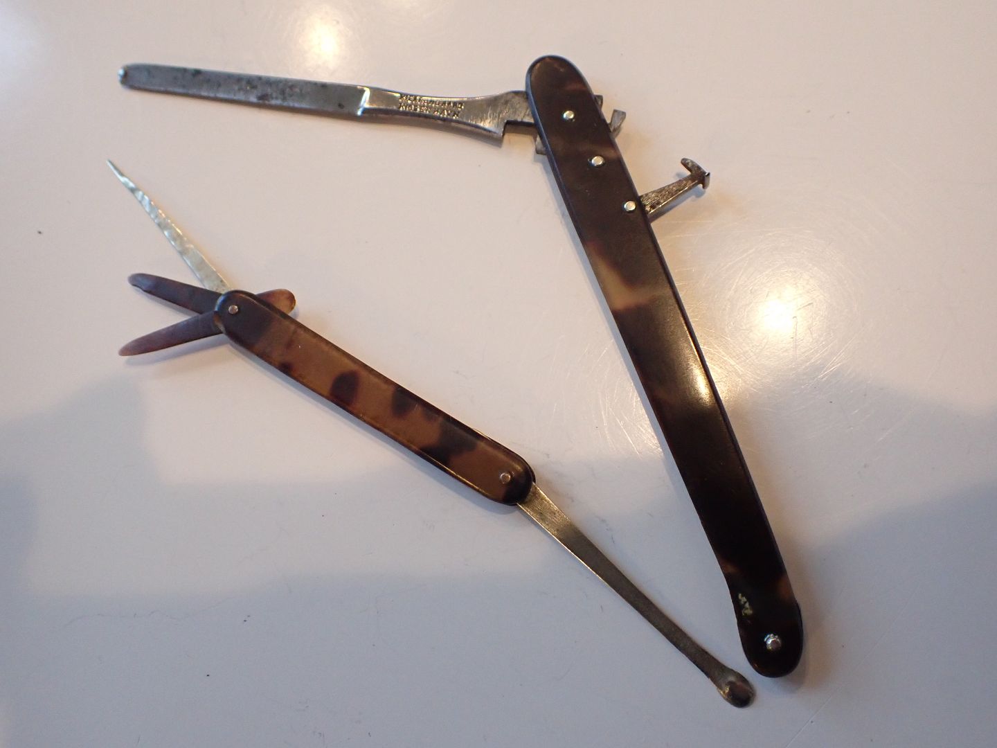 Gammel barberkniv og tandstiksæt i skilpaddemønstret plastik og stål.