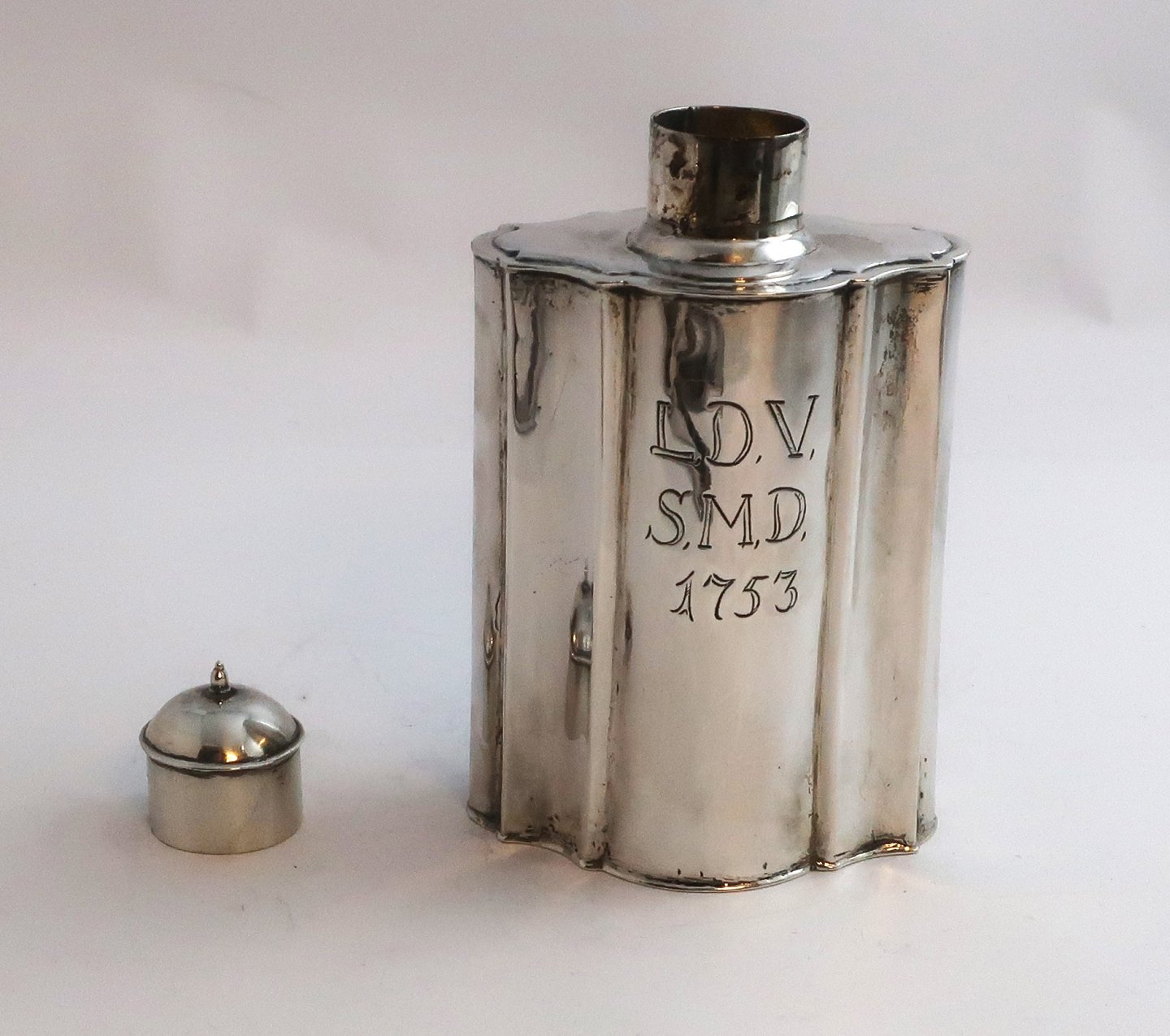 Tobias Didrichsen, Copenhagen (1749-75). Silver tea can, straight-cut (830). Height 12 cm.