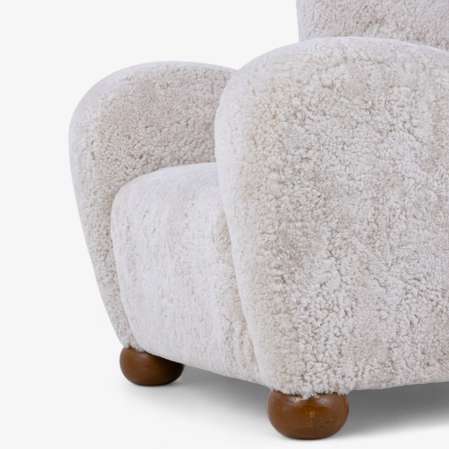 Sjælden 'Aulanko'-lænestol i nyt lammeskind (farve: Moonlight). Formgivet c. 1939 til Hotel Aulanko i Finland.