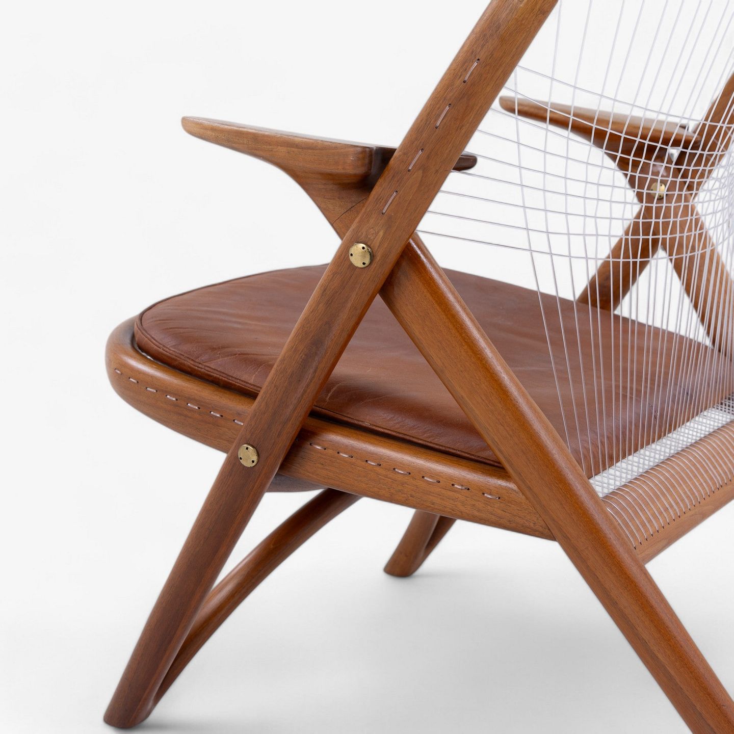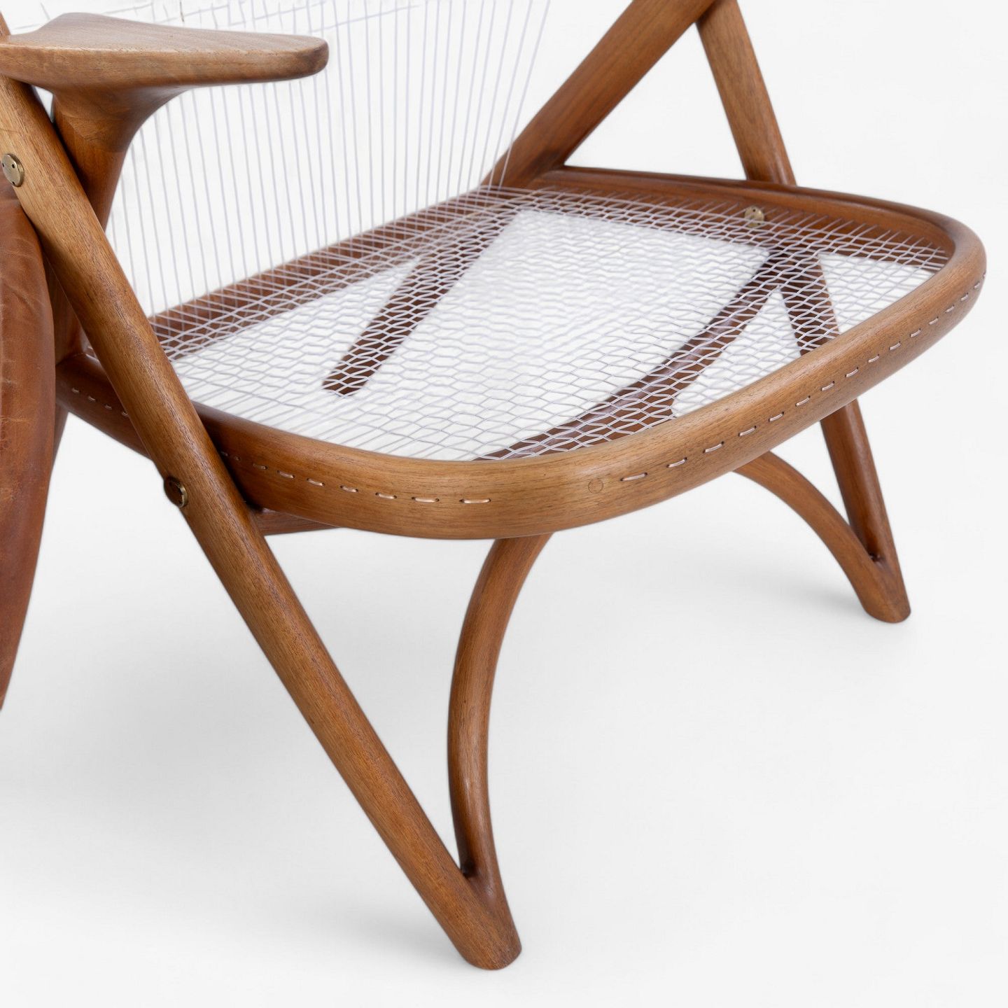 Sjælden lænestol i nøddetræ, nylon, originalt lædersæde og patineret pergament nakkehynde. Formgivet i 1955.