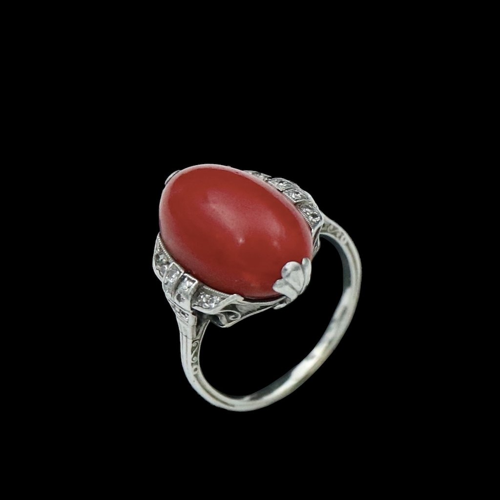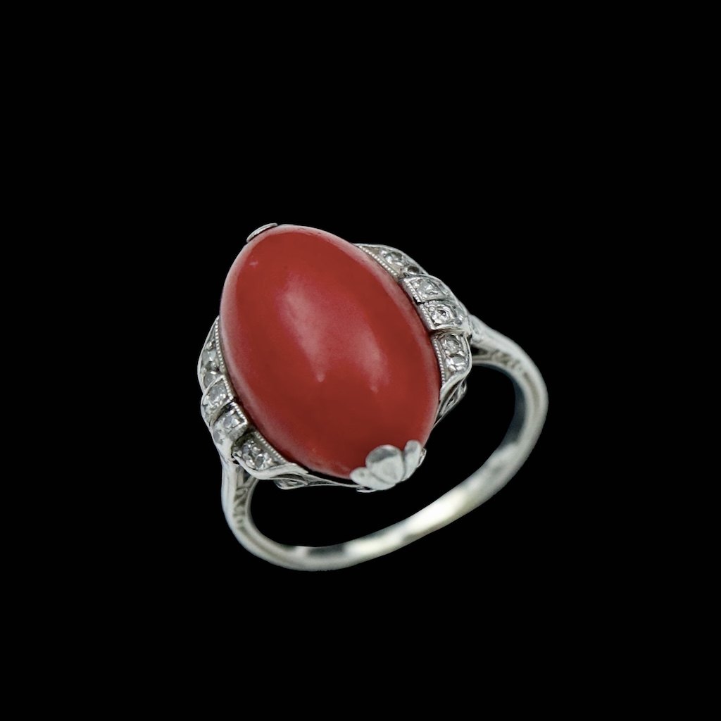 Art deco ring i sølv med koral og diamanter.