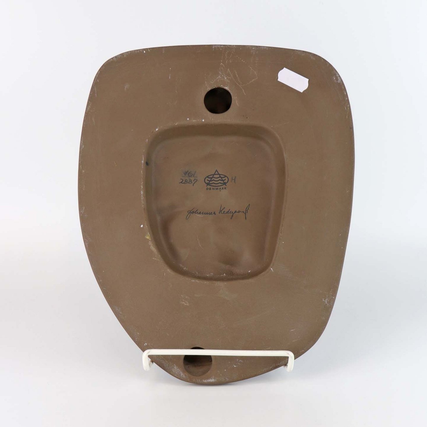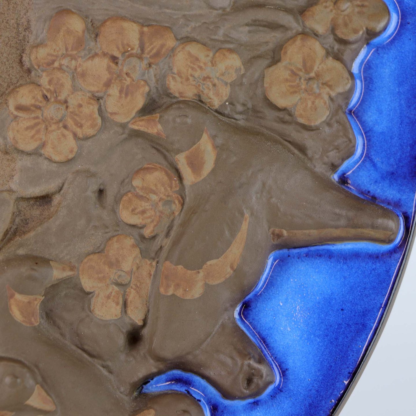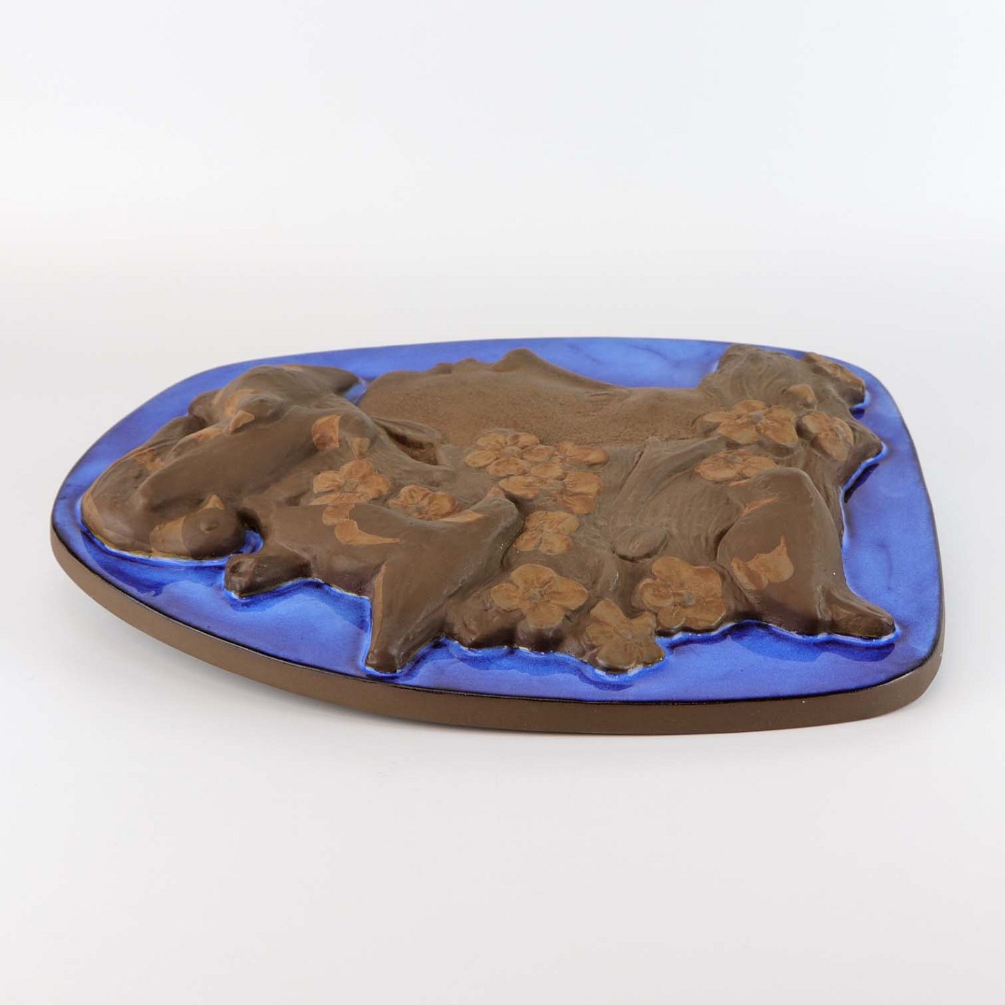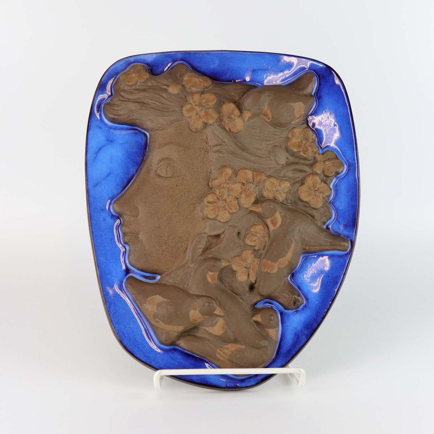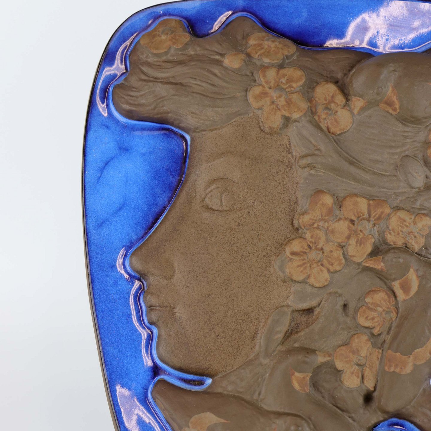 Relief i delvist glaseret stentøj med portræt af pige med spurve og blomster i håret. Nr. 161/2887
