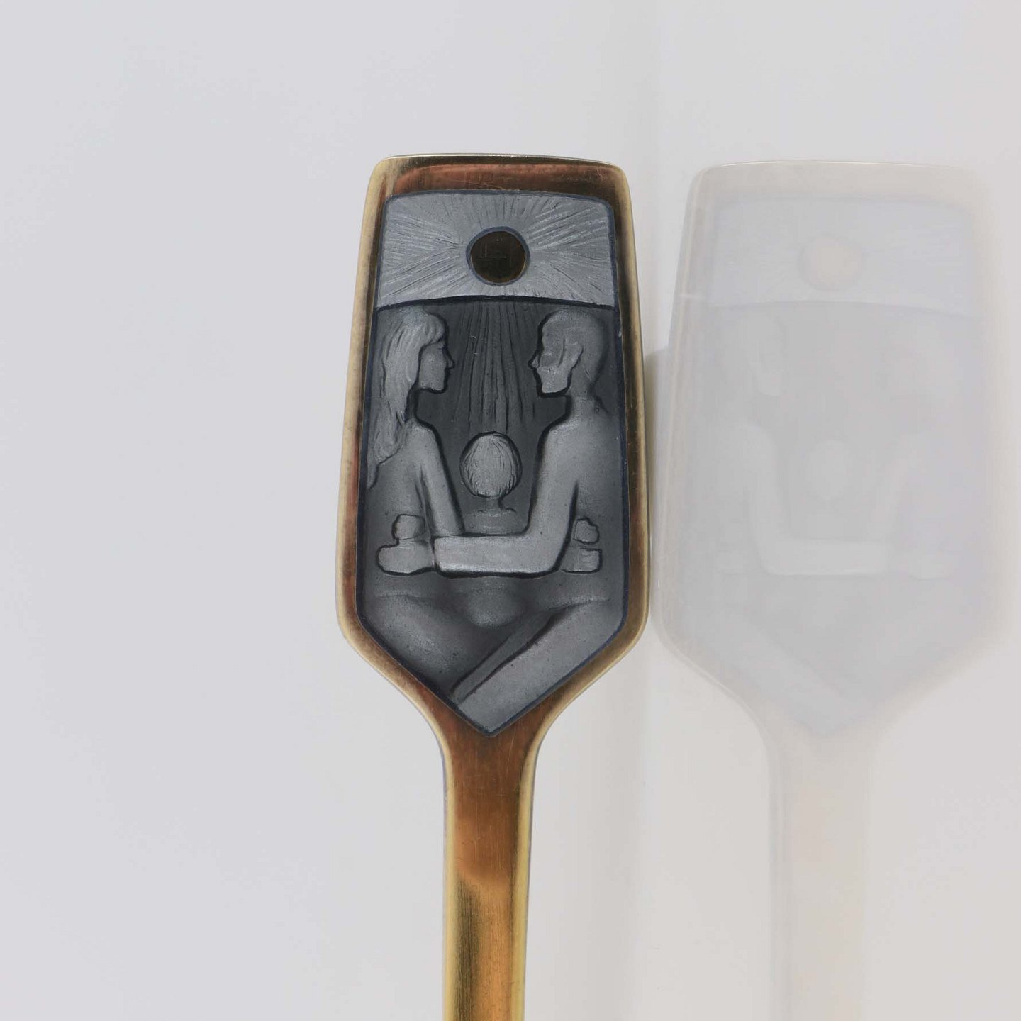 Julegaffel i forgyldt sterling sølv med indlagt emalje med teksten Jul 1973 og motiv af far, mor og barn
