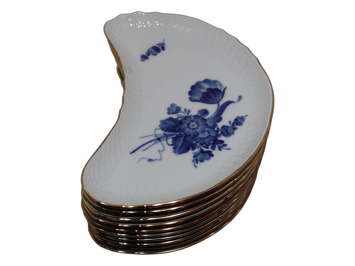 Royal Copenhagen Blå Blomst Svejfet med guldkant, måneformet sidetallerken.