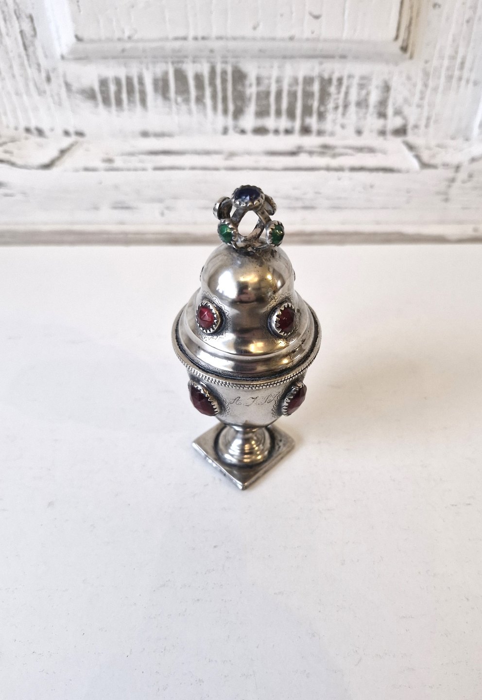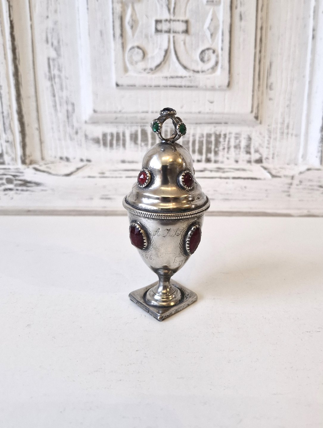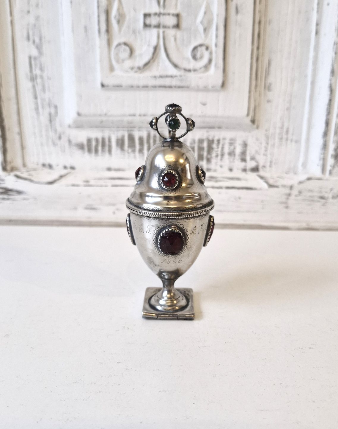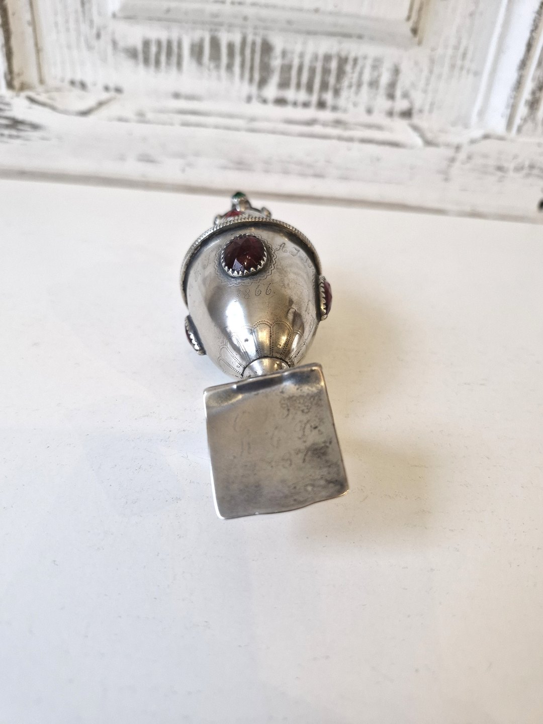 Main water egg in silver with red, blue and green glass flocs. Silversmith Jochum Carl Gorm Bisgaard 1800-1872 Horsens