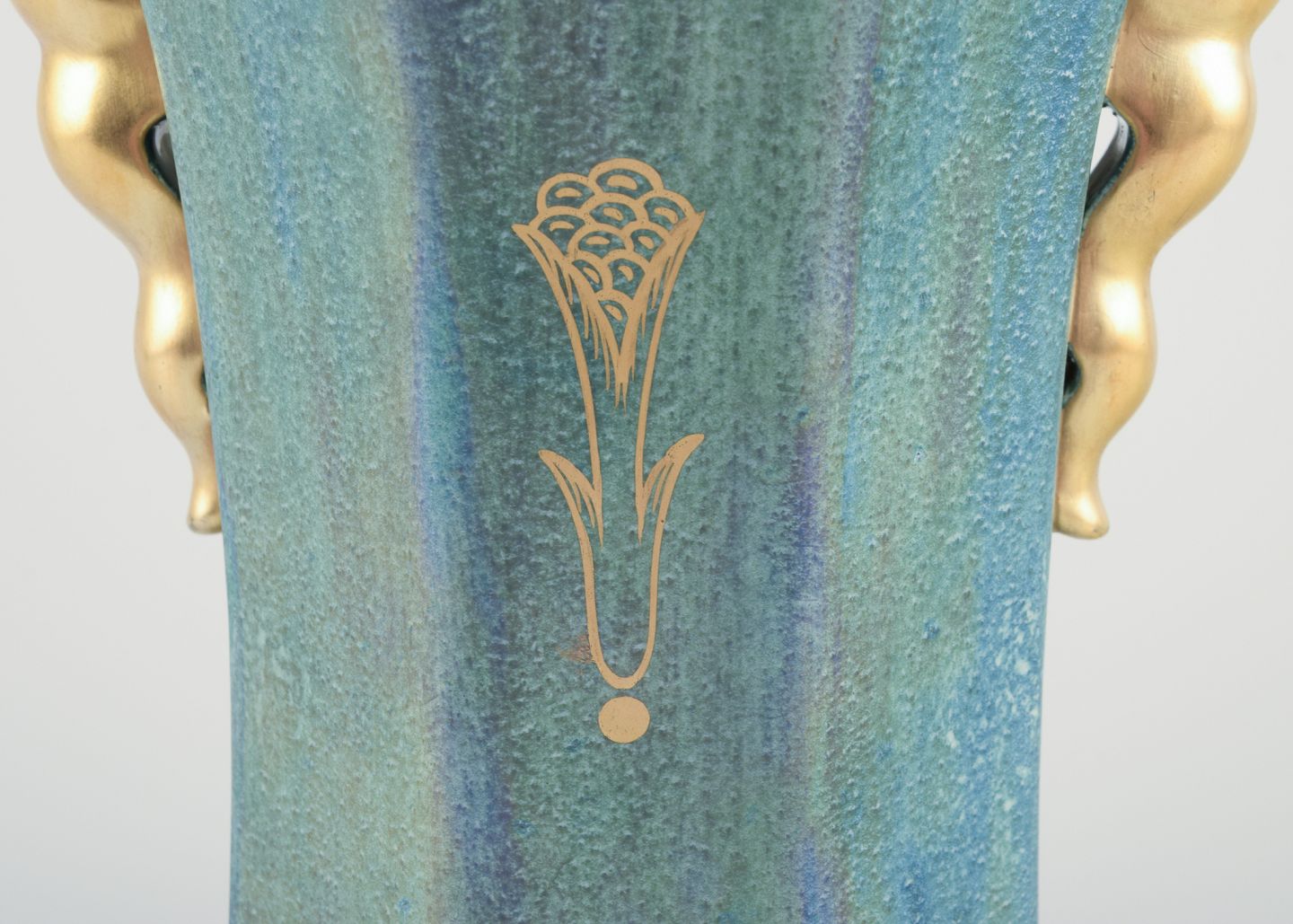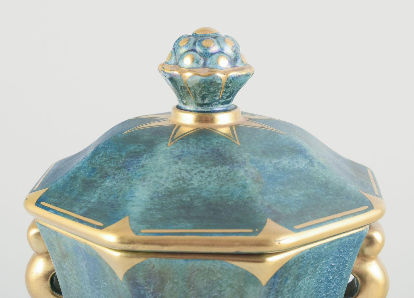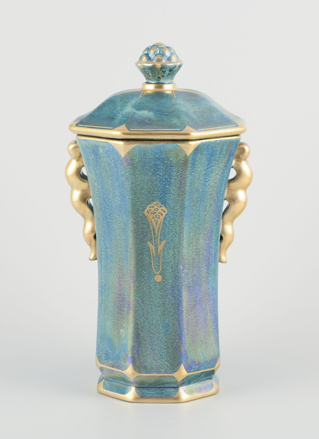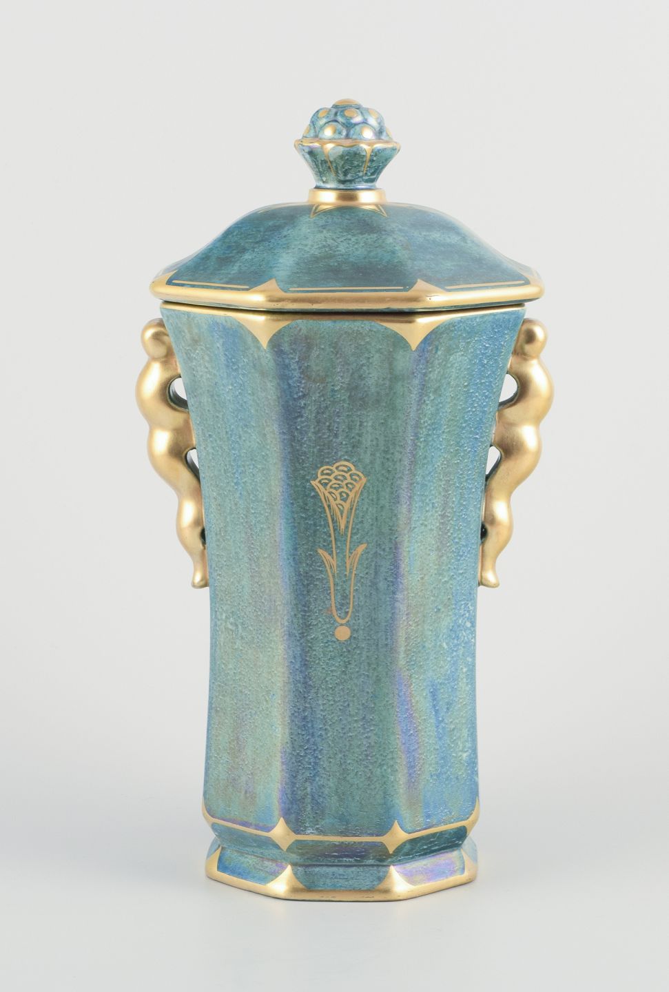Stor ottekantet lågvase i porcelæn. Håndmalet i lustreglasur, gulddekoration.