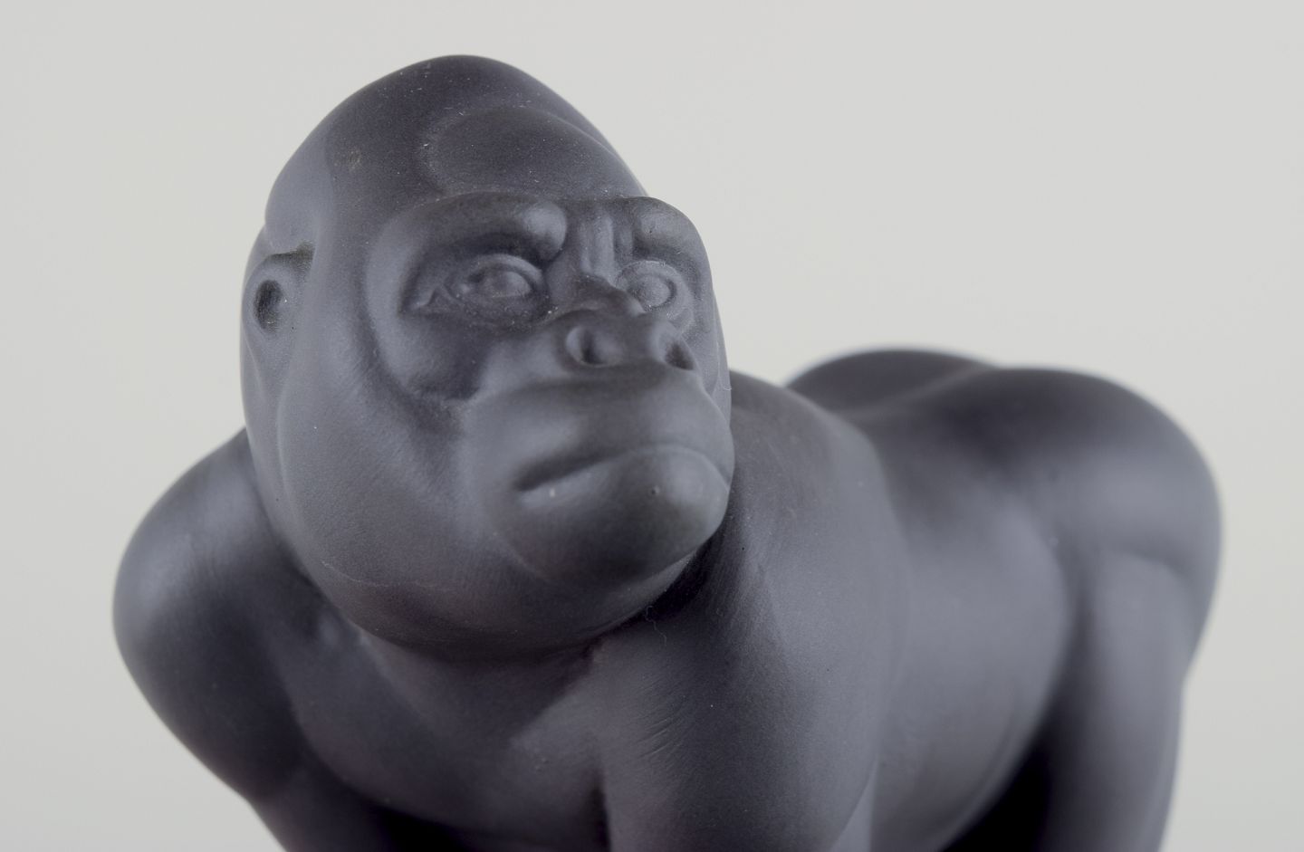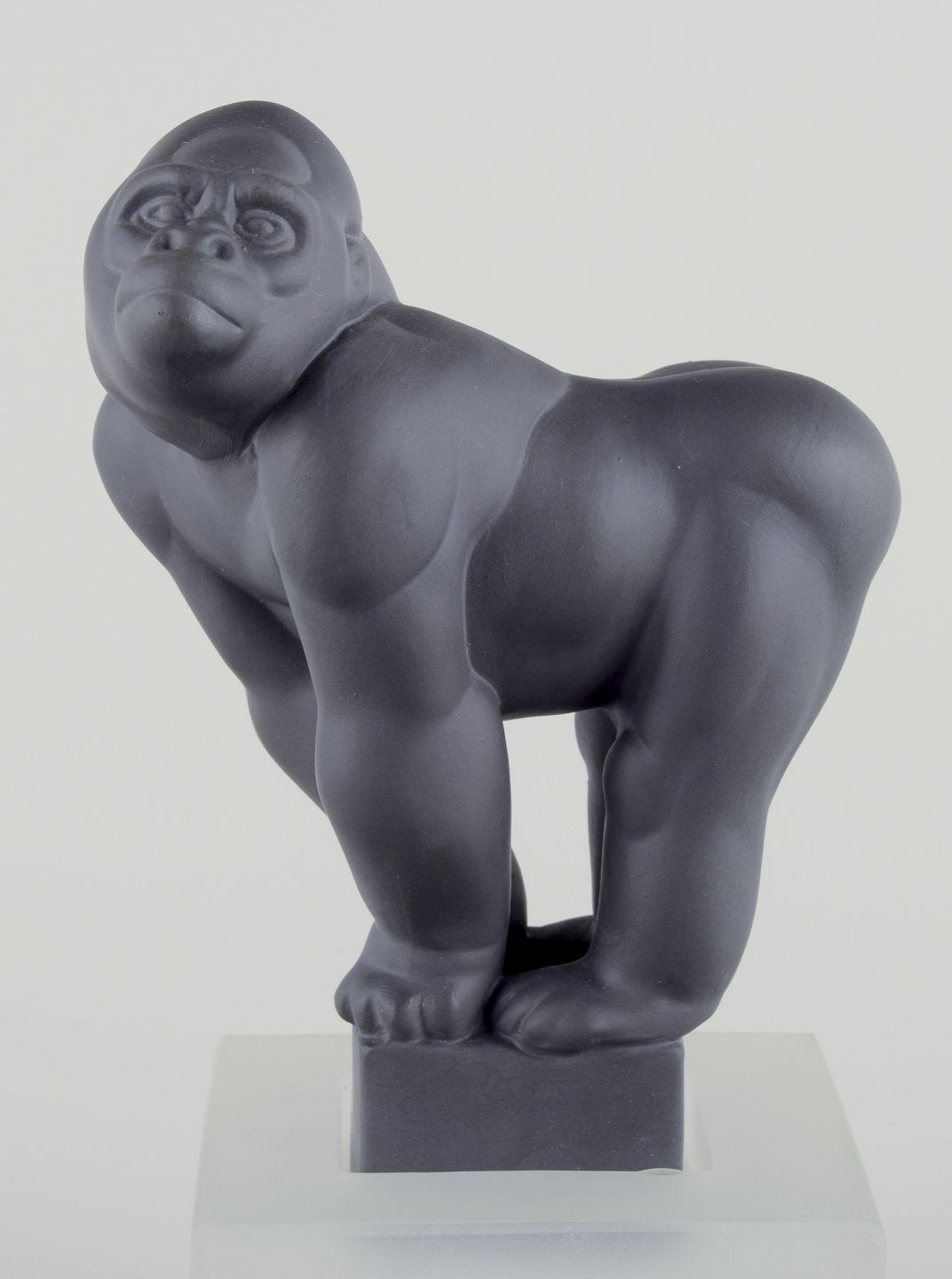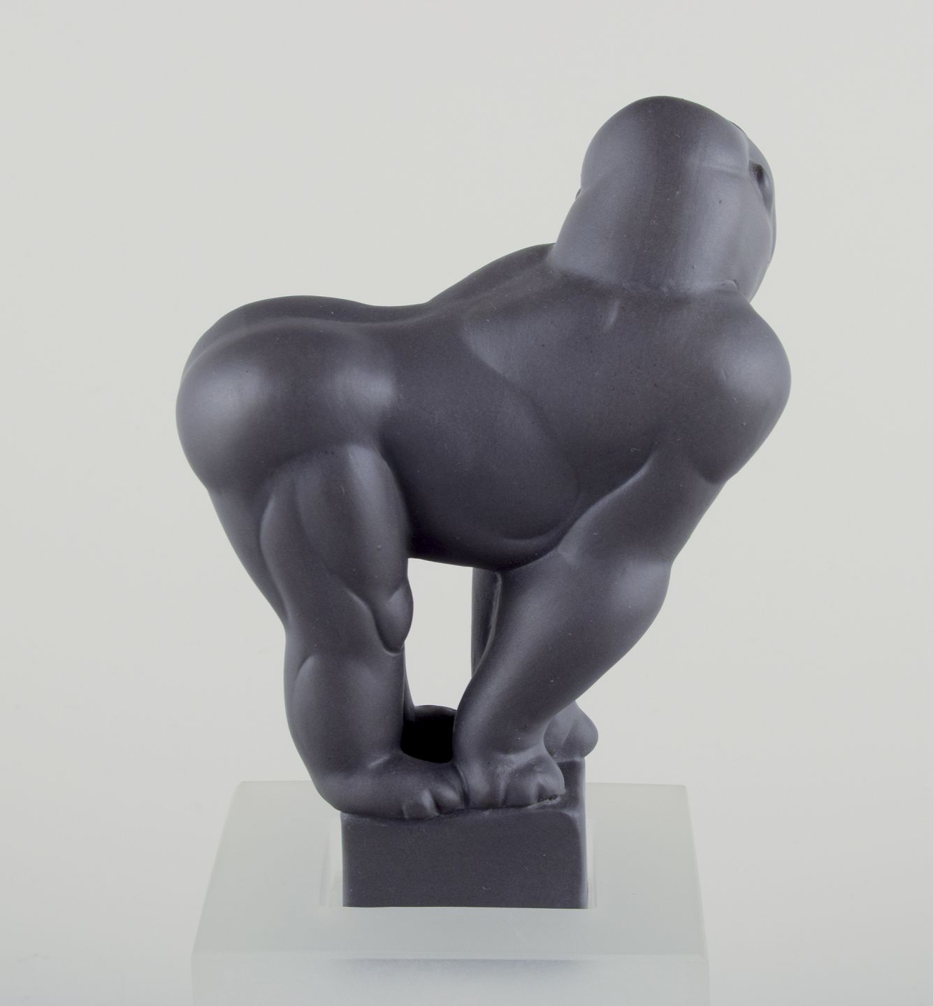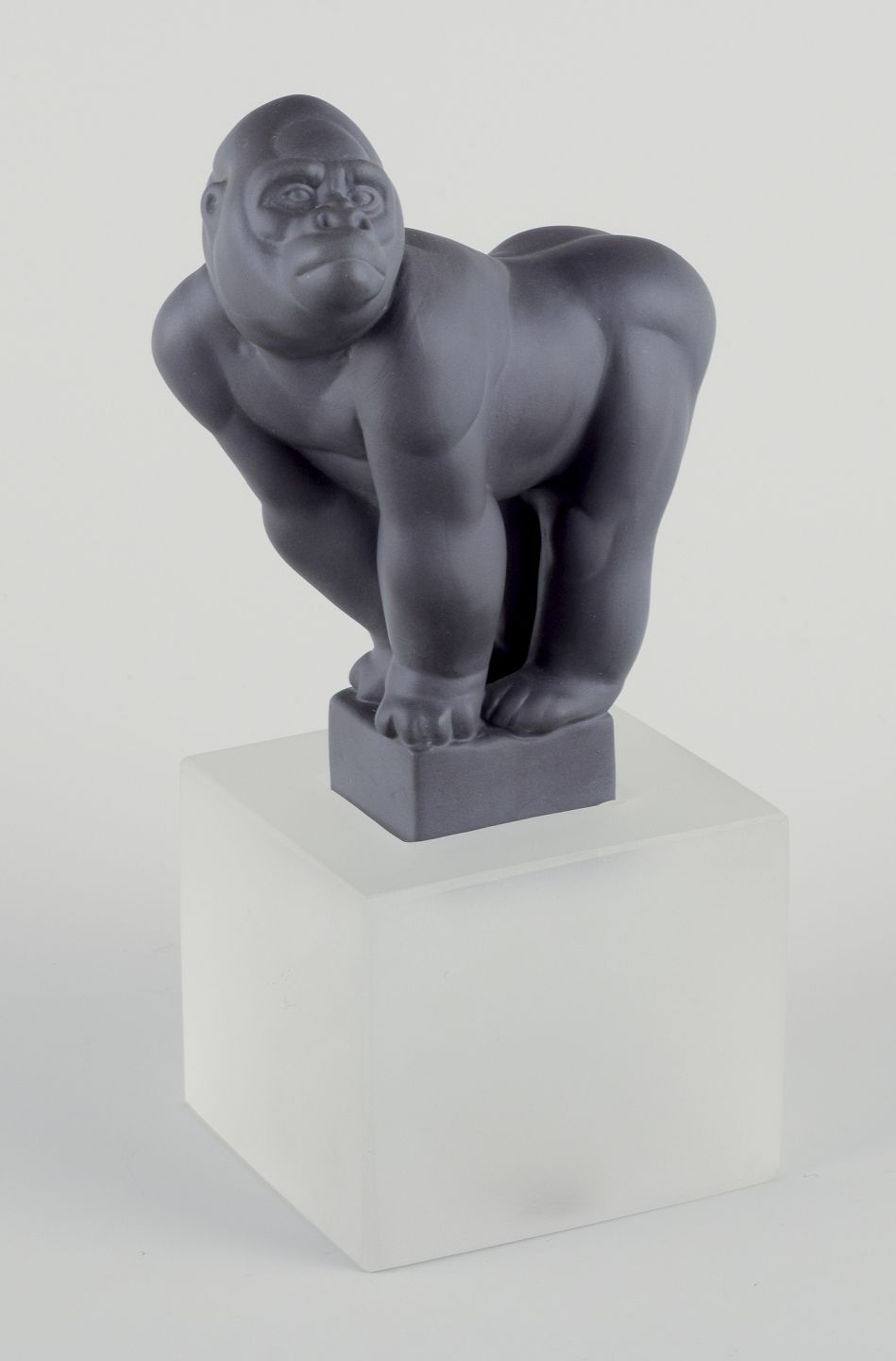 Pia Langelund for Royal Copenhagen. Figur af gorilla i bisquit monteret på sokkel af matteret glas.