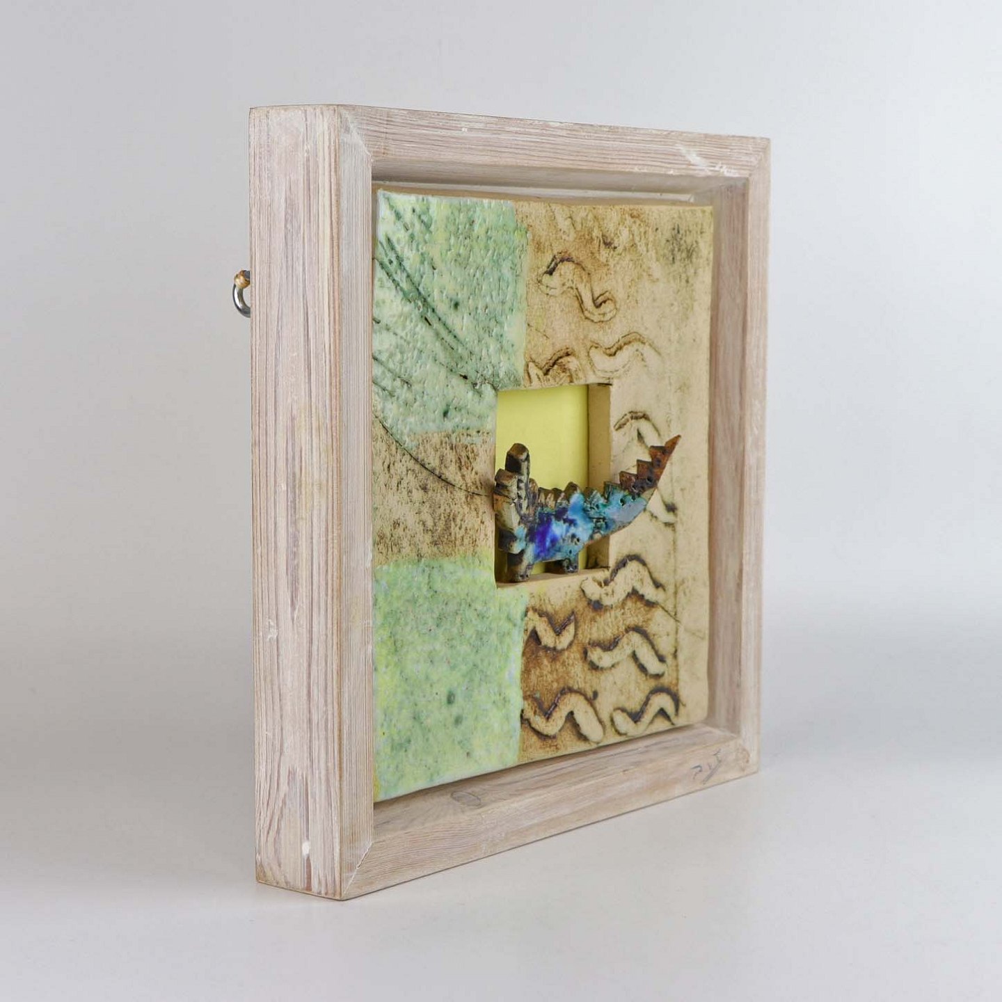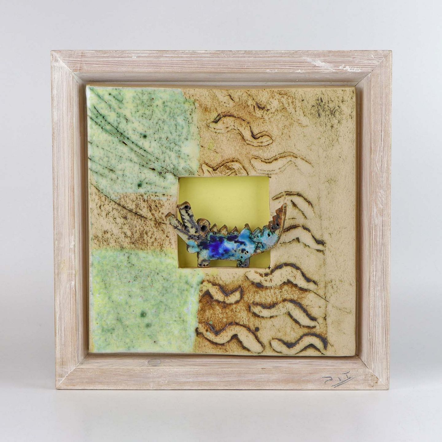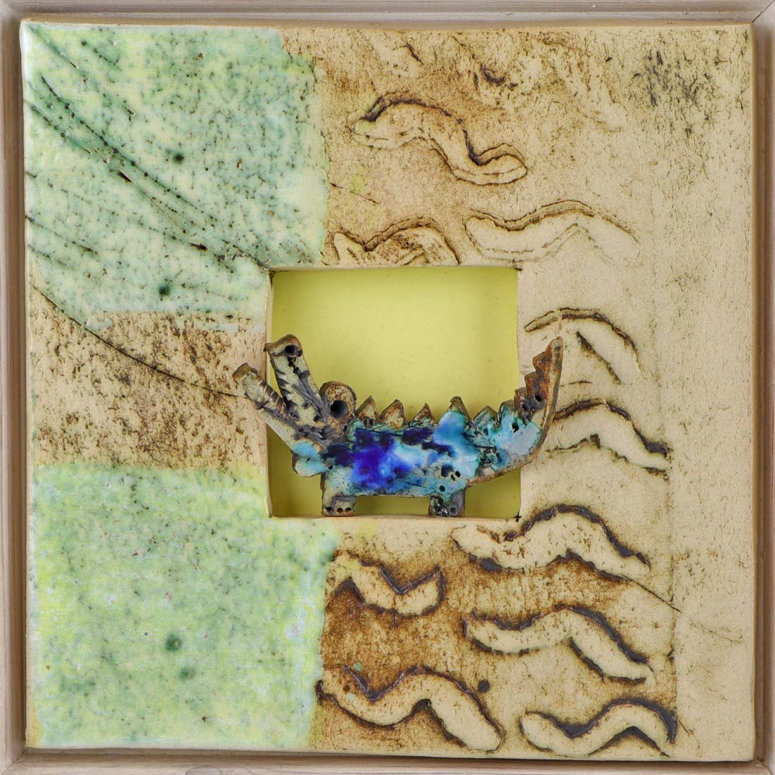 Relief i delvist glaseret stentøj fra 1994 monteret på klinke i træramme med motiv af en blå krokodille navngivet Dille