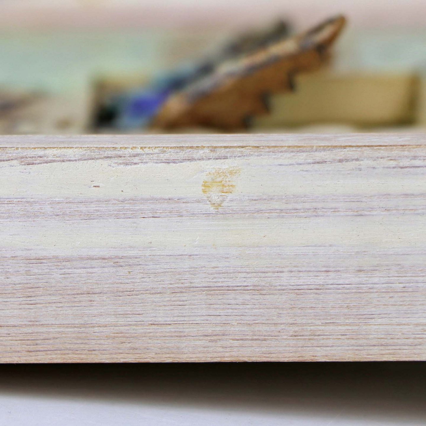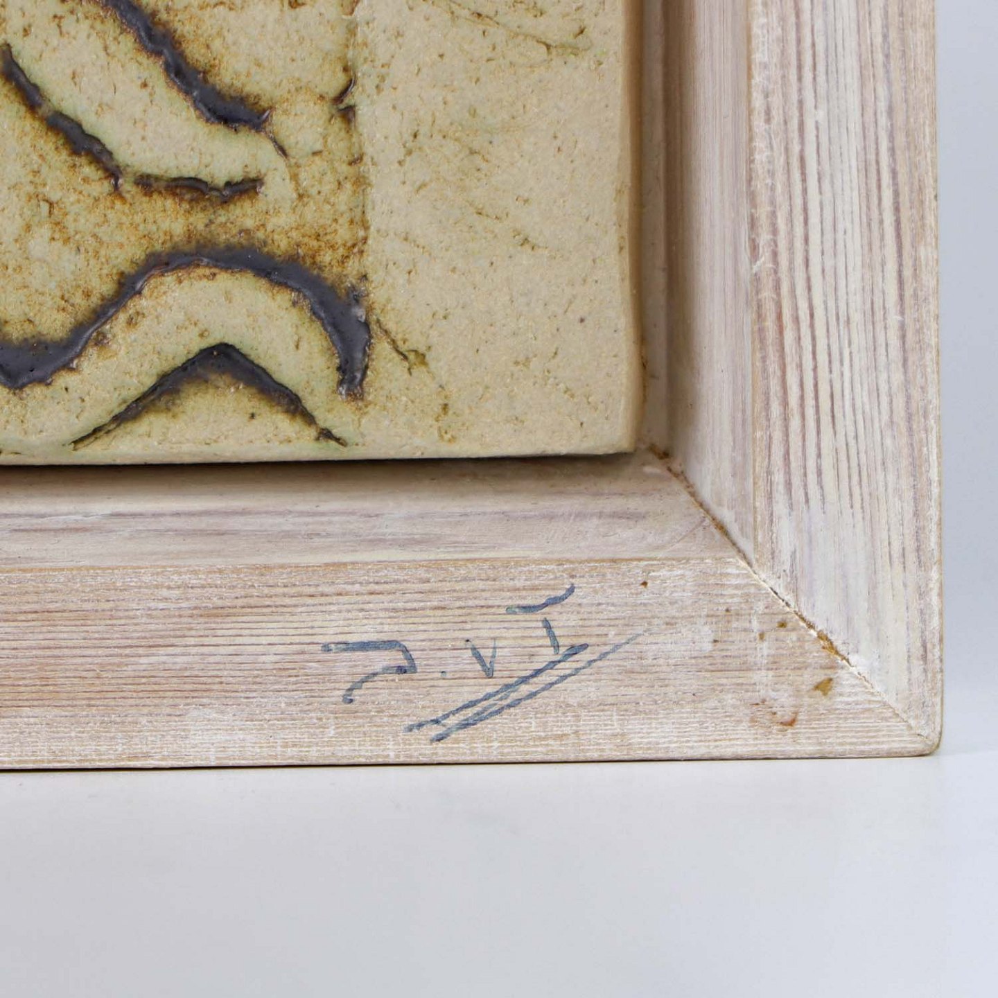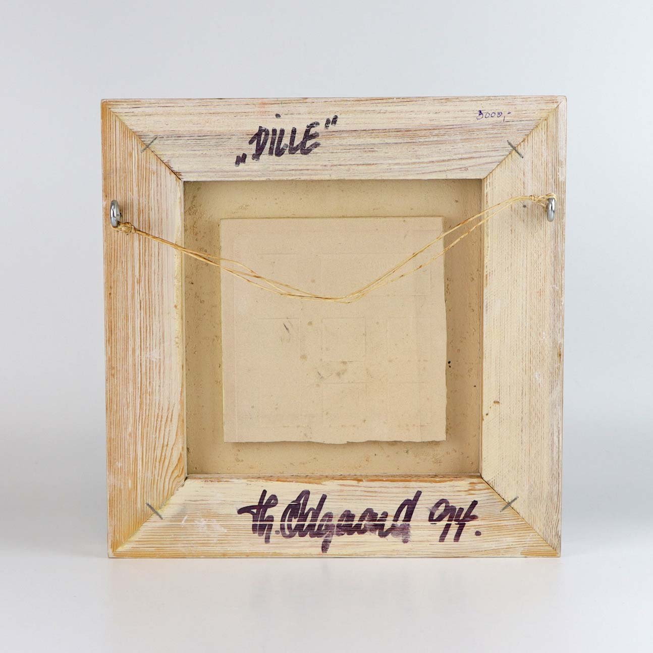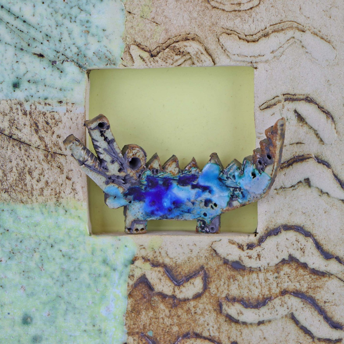 Relief i delvist glaseret stentøj fra 1994 monteret på klinke i træramme med motiv af en blå krokodille navngivet Dille