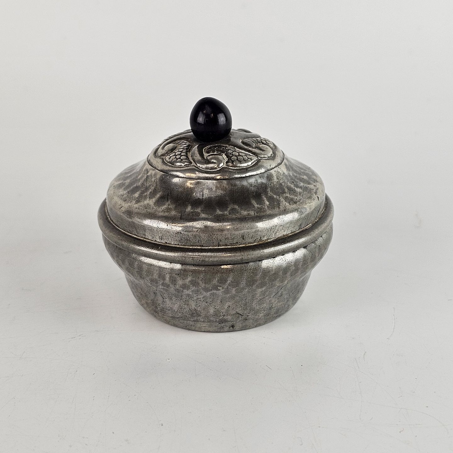 Lille krukke af tin med sort kugle på låget.