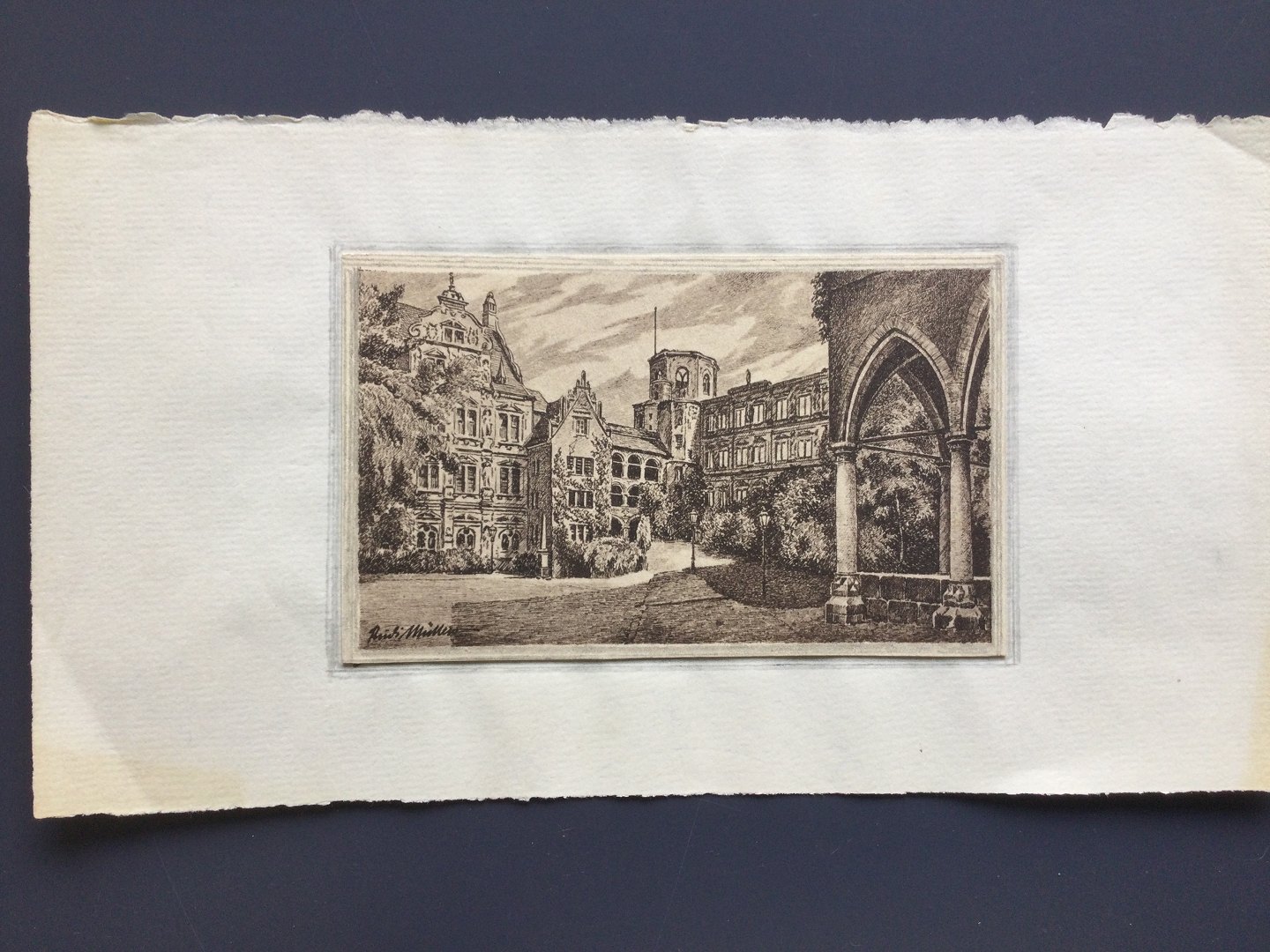 Text available in Danish: Radering af Richard Müller - Slotsgården i Heidelberg.