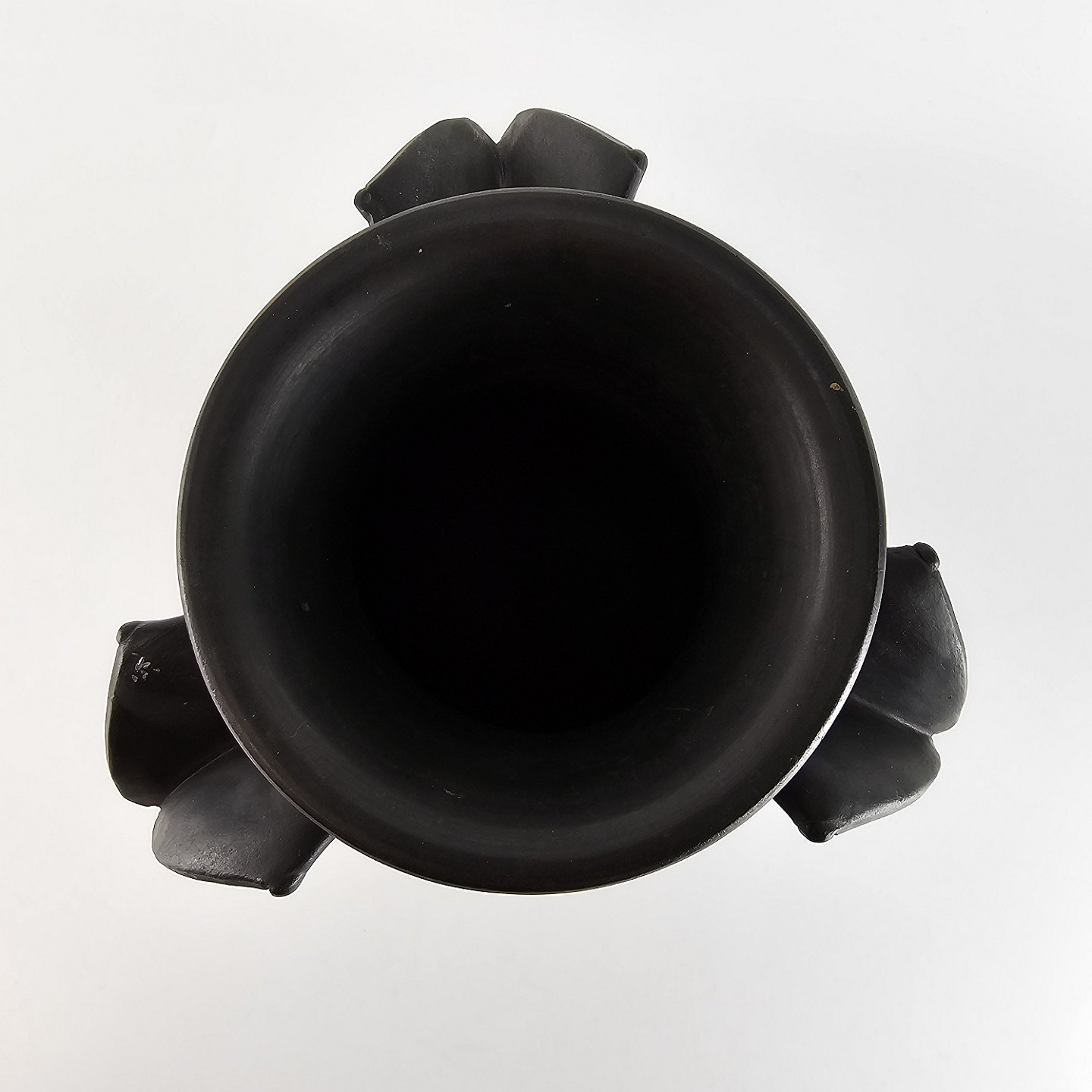 Høj sort vase, af terracotta, med dekoration af tre flagermus, vinge ved vinge. Nr 787