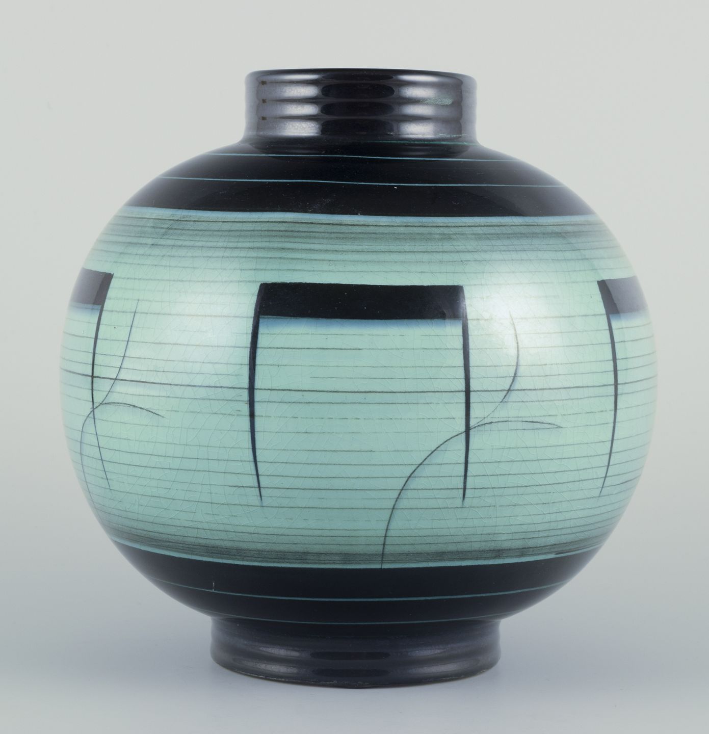 Stor og rund vase i glaseret fajance. Art Deco. Bauhaus inspireret dekoration.