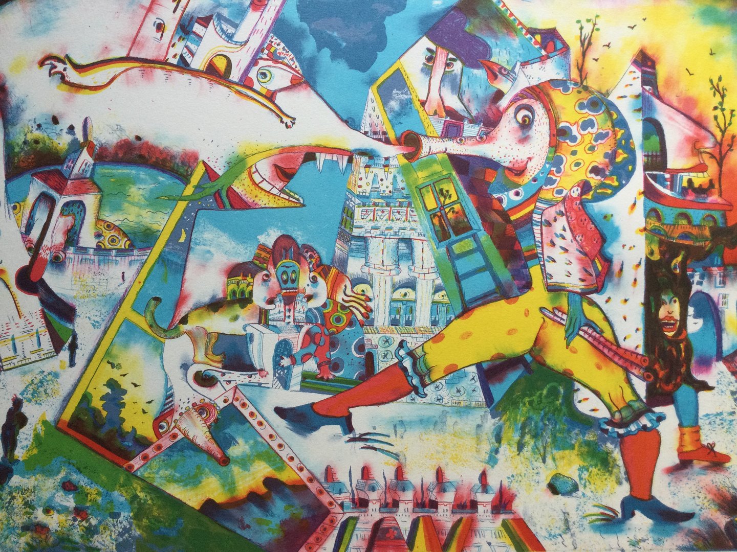 Litografi af Anne-Marie Brauge 1991 - Surrealistisk komposition.
