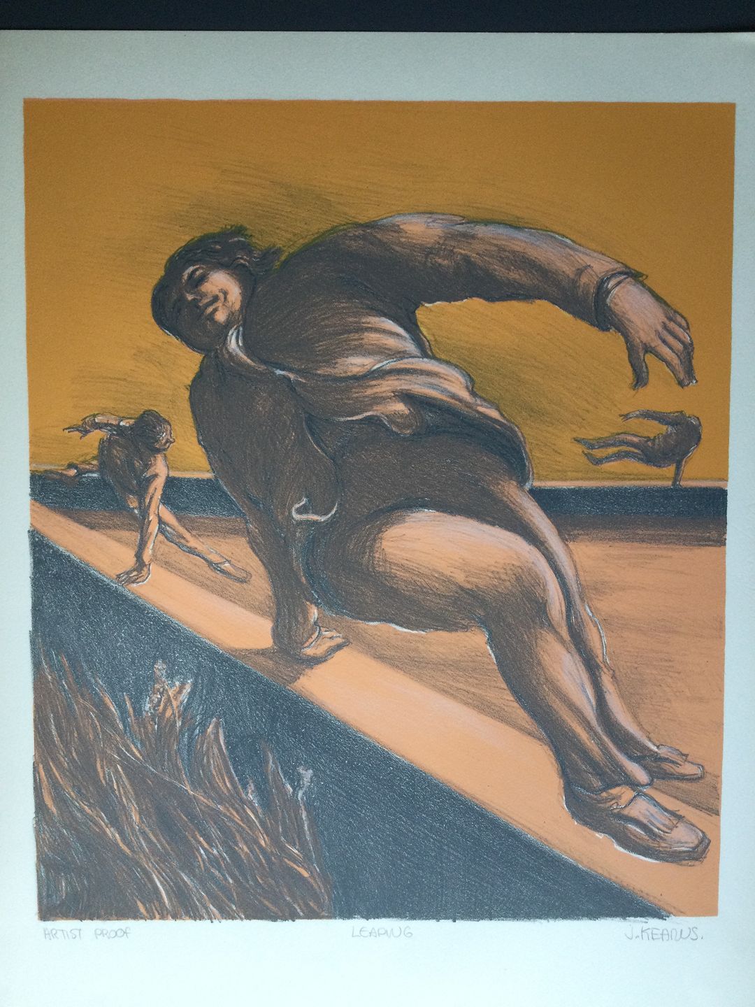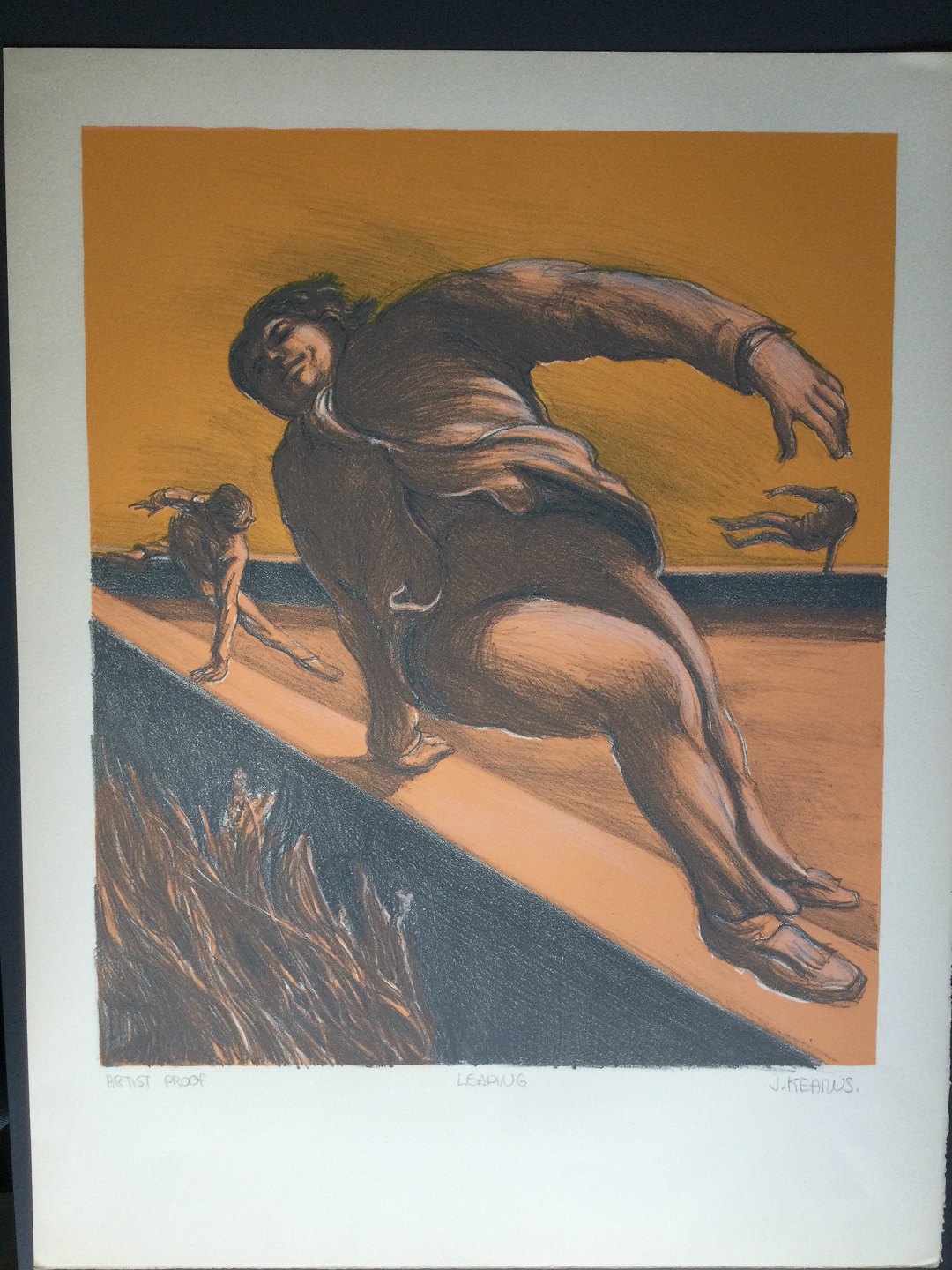 Litografi af James Kearns - Komposition med flyvende paerson.