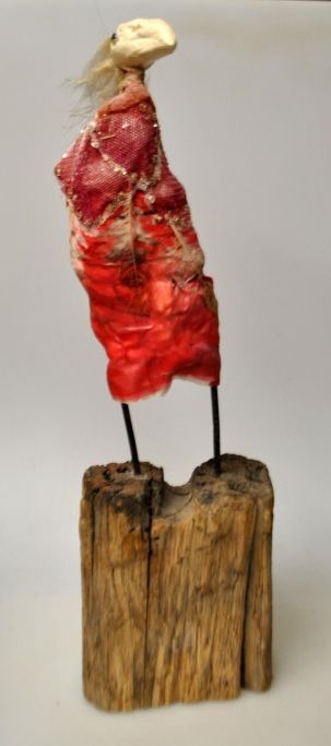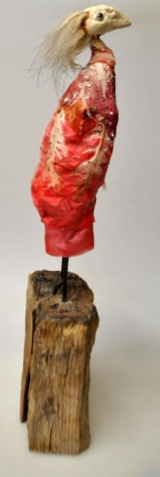 Vittanen, Paula (1956 - ) Finland, Danmark: Rødt fuglemenneske, 2005. Skulptur i mixed media på træ sokkel. Signeret: Paula VII 2005 Samsø. H: 34 cm.