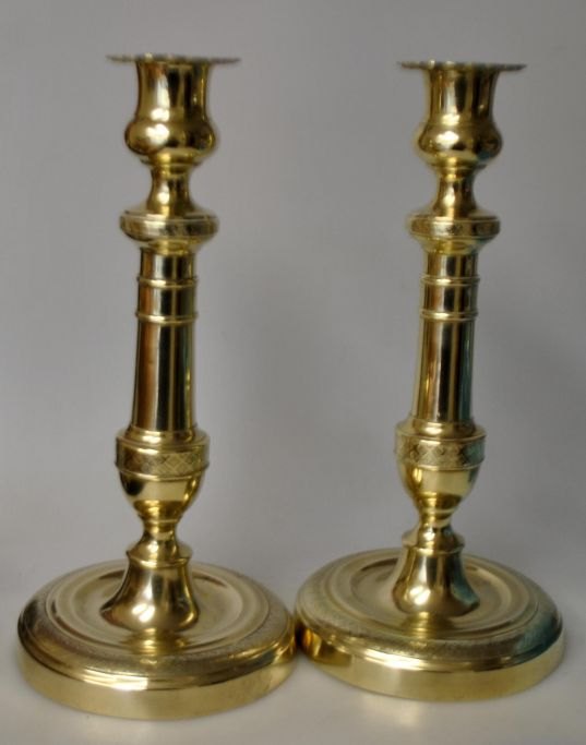 Par franske messing lysestager, 19. årh. Charles X. Med dekorationer på fod og stamme. H.: 26 cm.