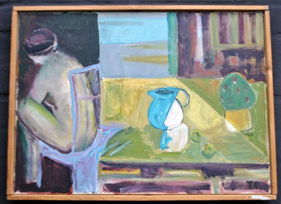Christensen, Tove Elisabeth (1923 - 1991) Danmark: En kvinde ved et bord. Signeret. Olie på lærred. 38 x 52 cm.