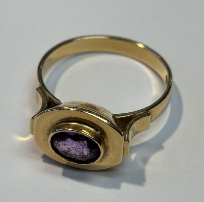 Rødguldring med ametyst, 20. årh. Danmark. Stemplet. Størrelse: 54/55. Vægt: 3.3 gram.