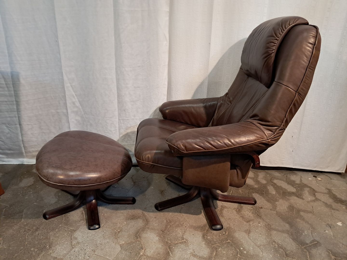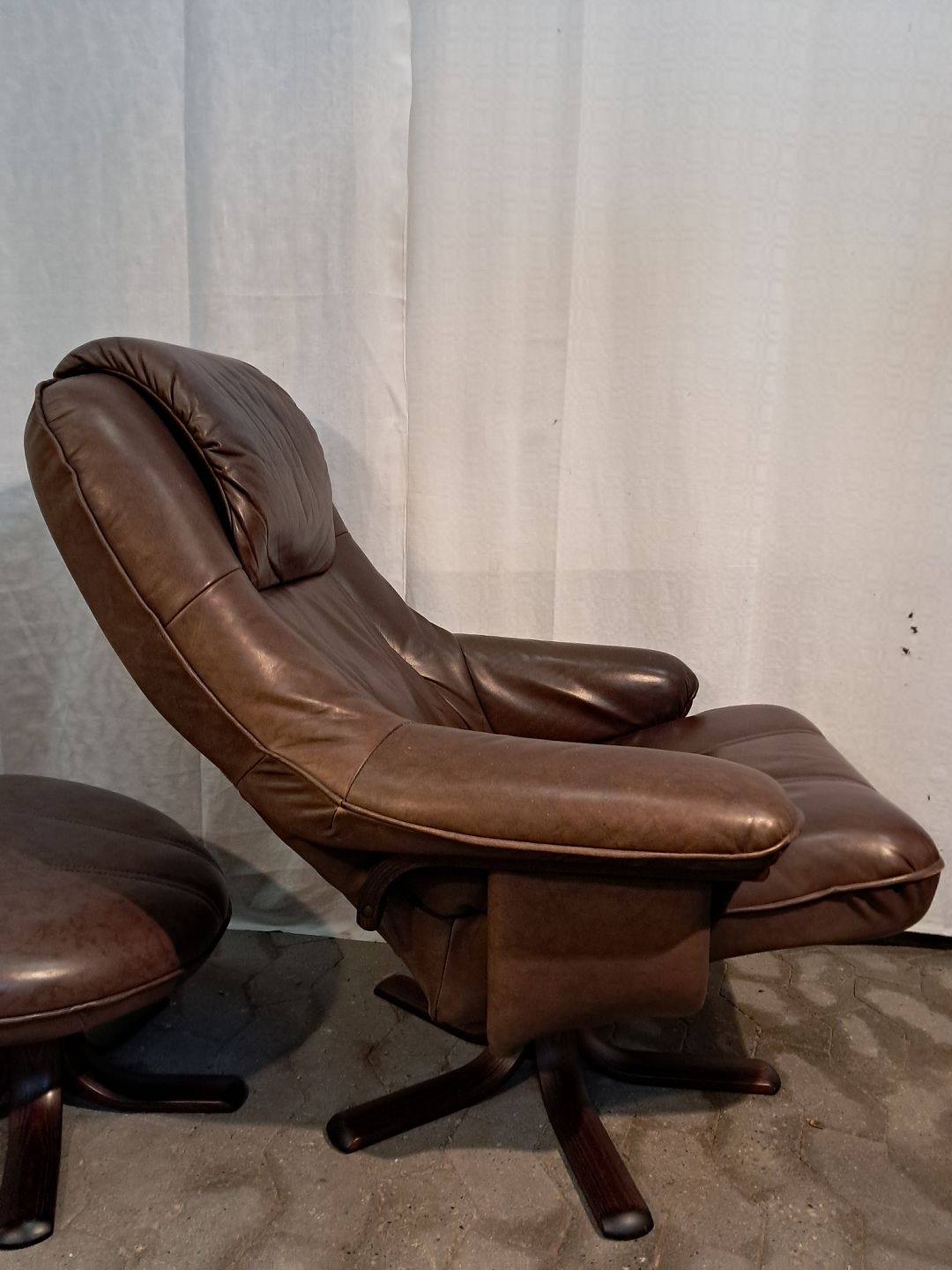 Brun læder lænestol med fodskammel, fra 2010erne.