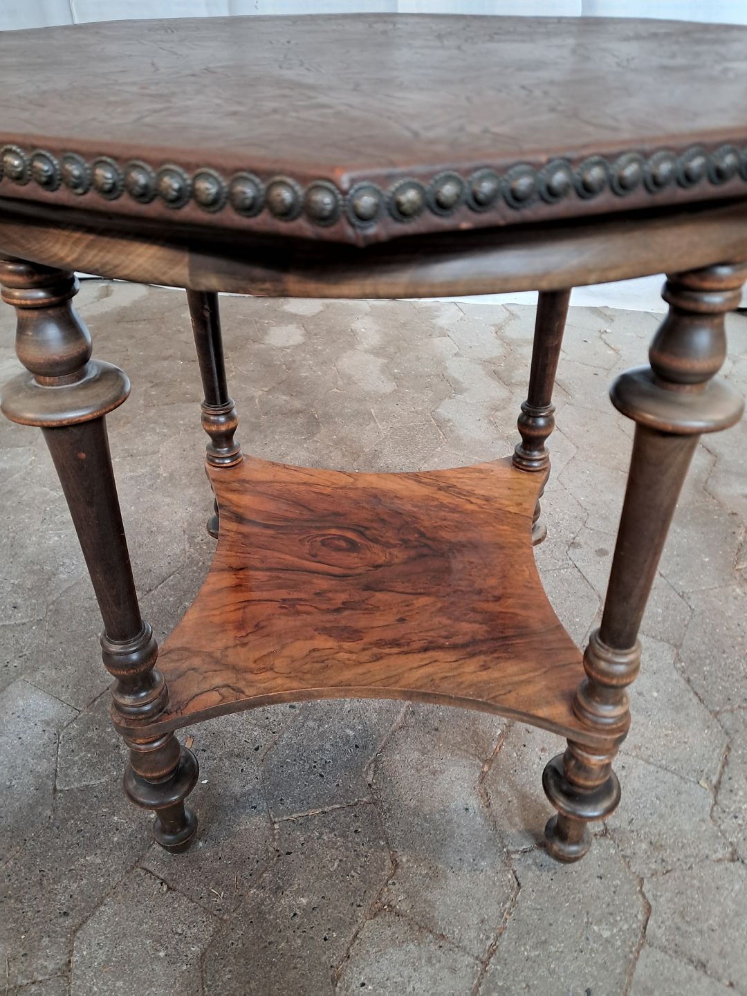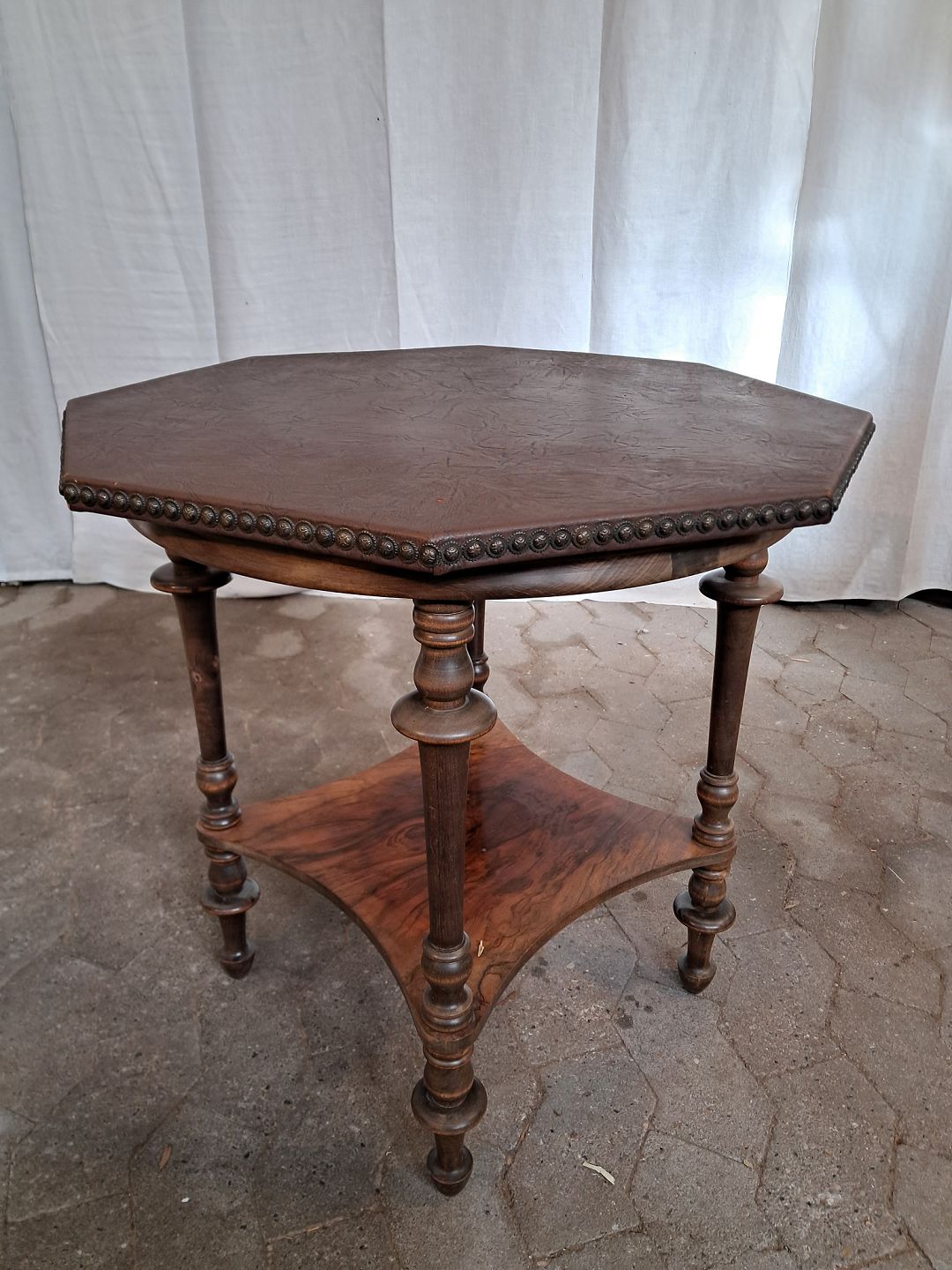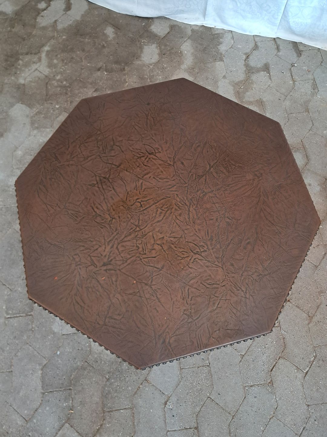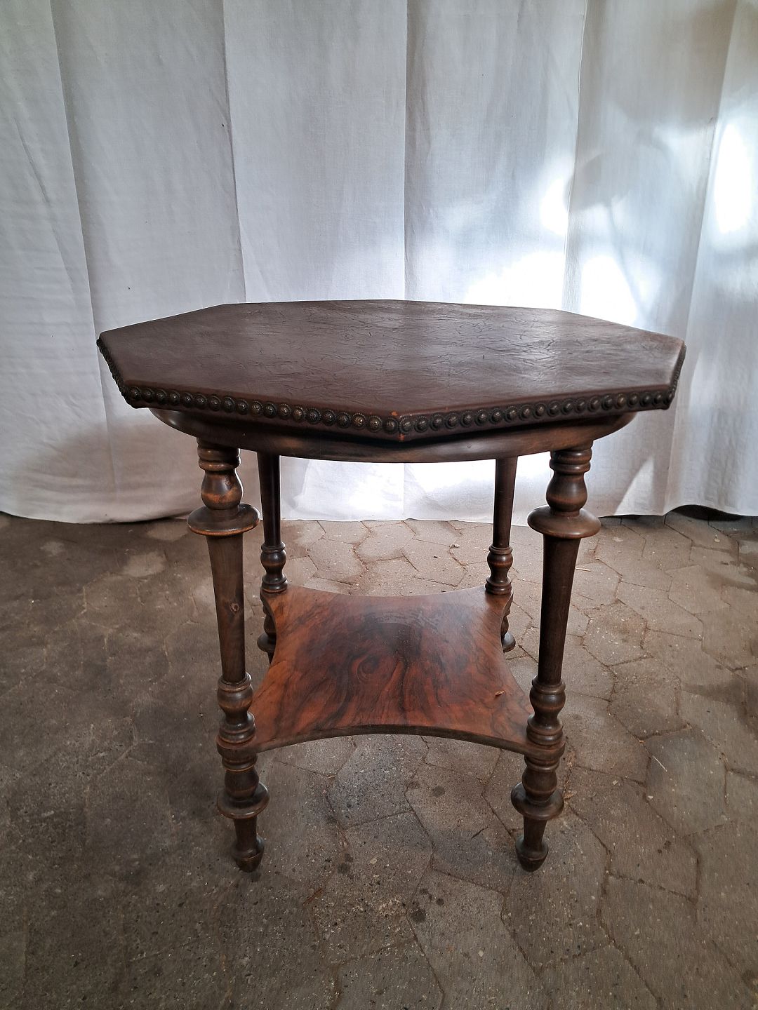Lampebord i mahogni og bøgetræ med kunstlæder, fra 1950erne.