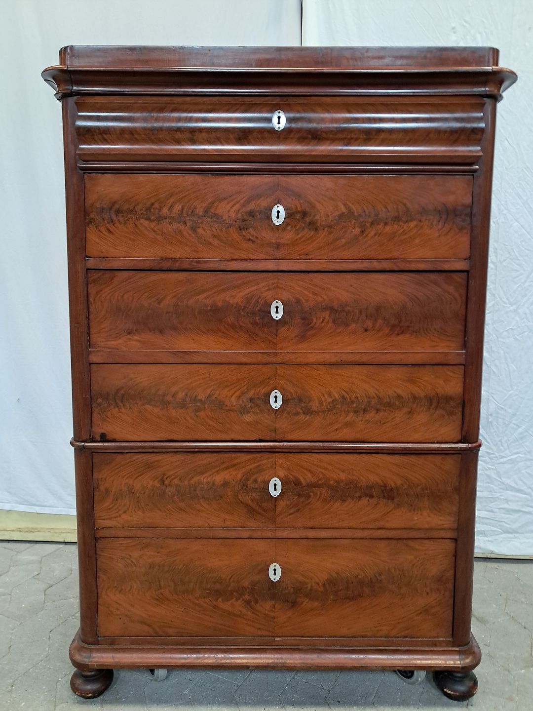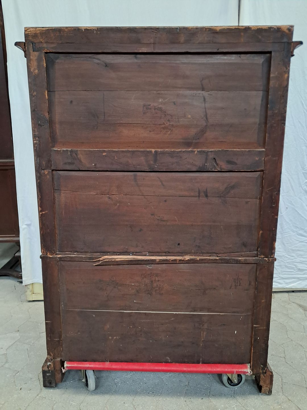Stor kommode i fineret mahogni med skriveplads, fra 1890erne.