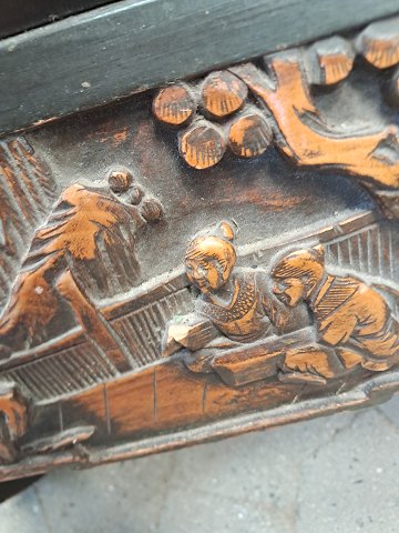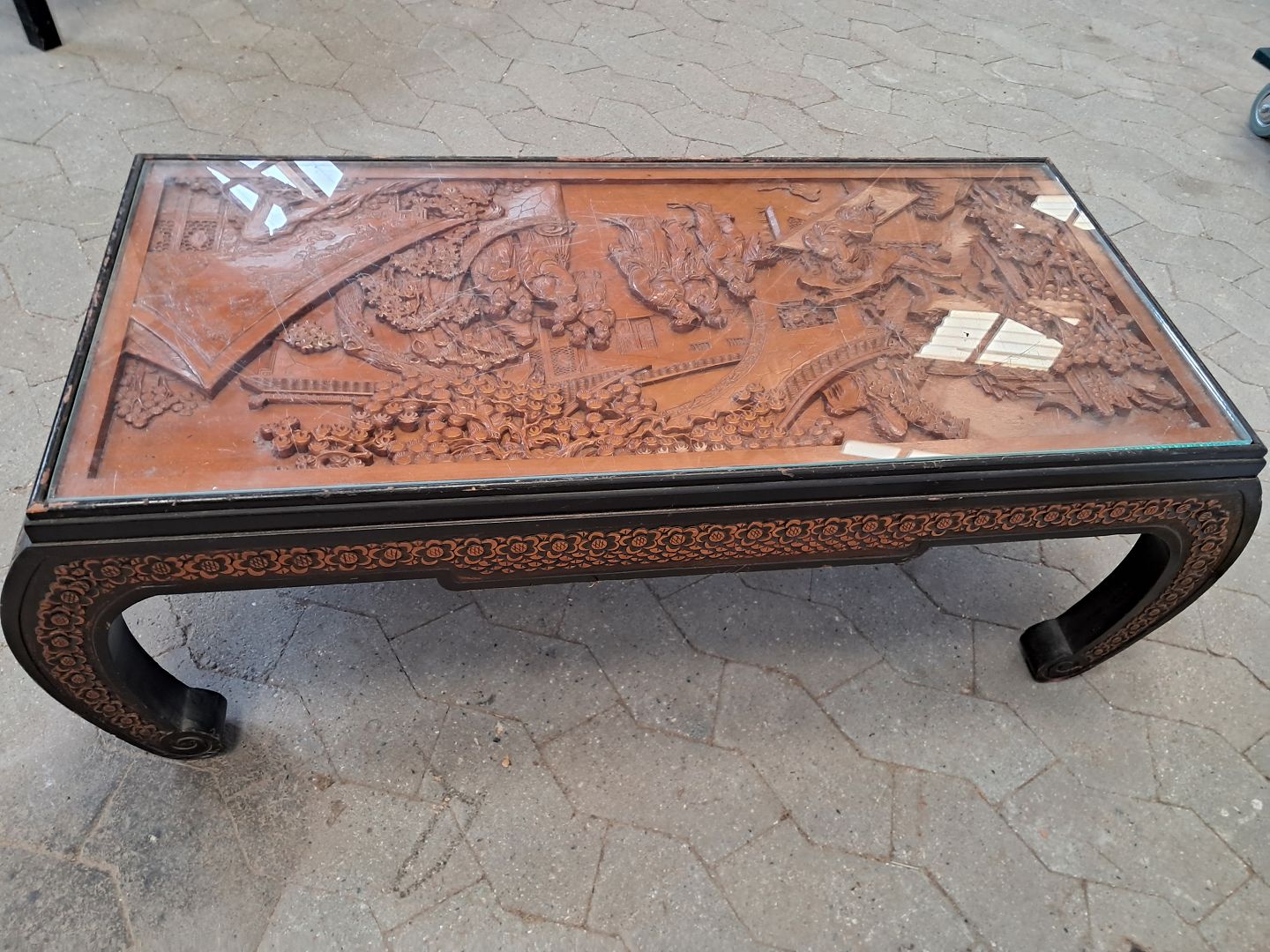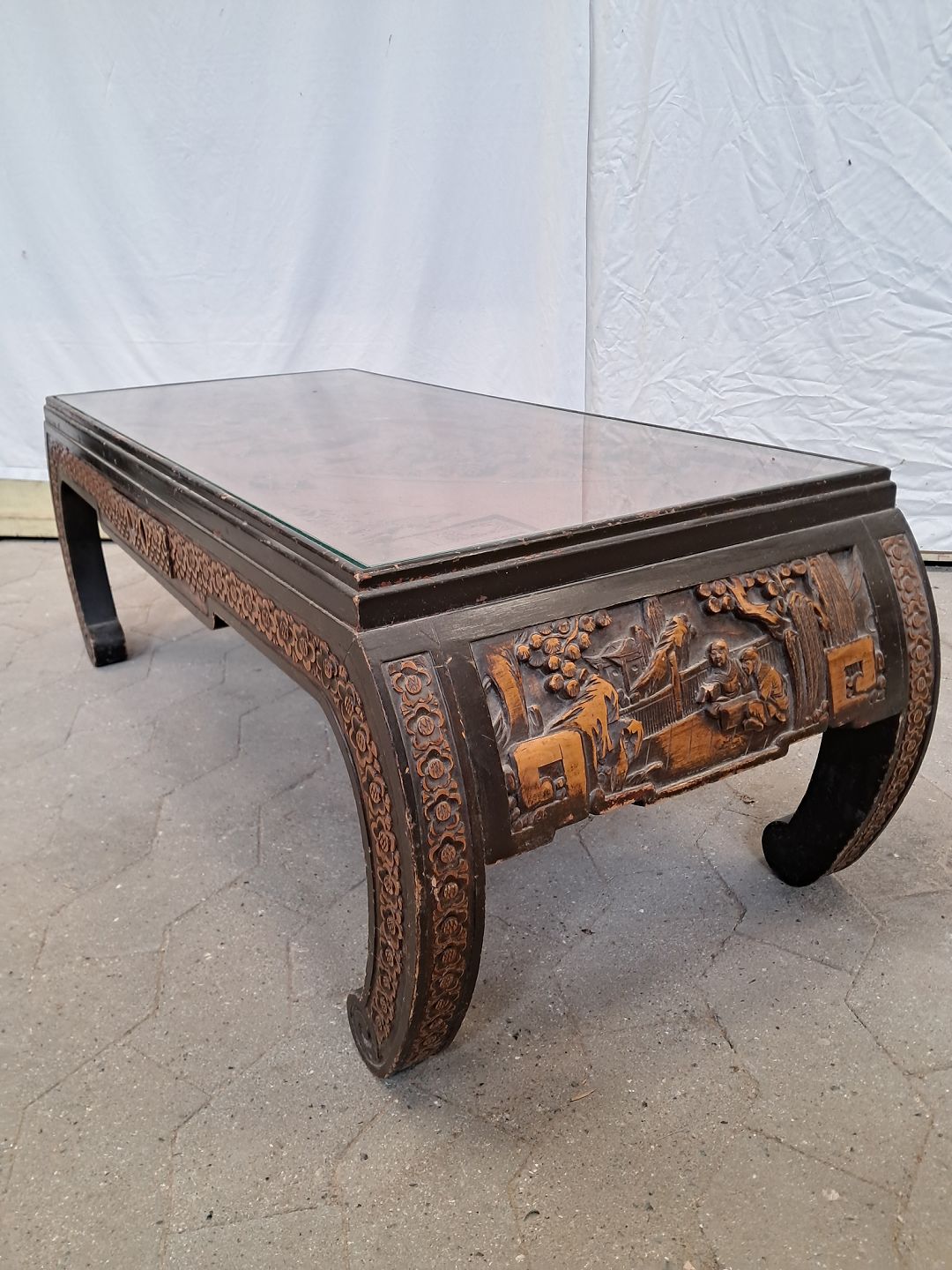 Pyntebord i massivt træ med glasplade, fra 1980erne.