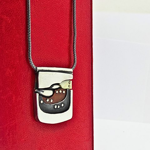 Anette Kræn; Halskæde i sterling sølv, prydet med oxyd og ben. Vedhæng h. 2,5 cm. B. 2 cm.