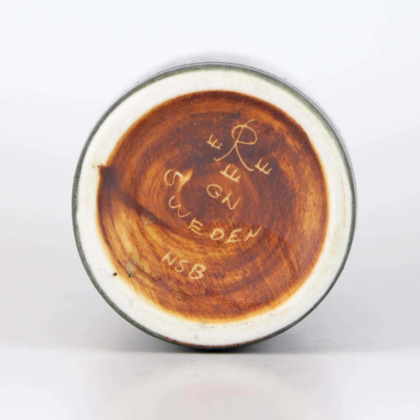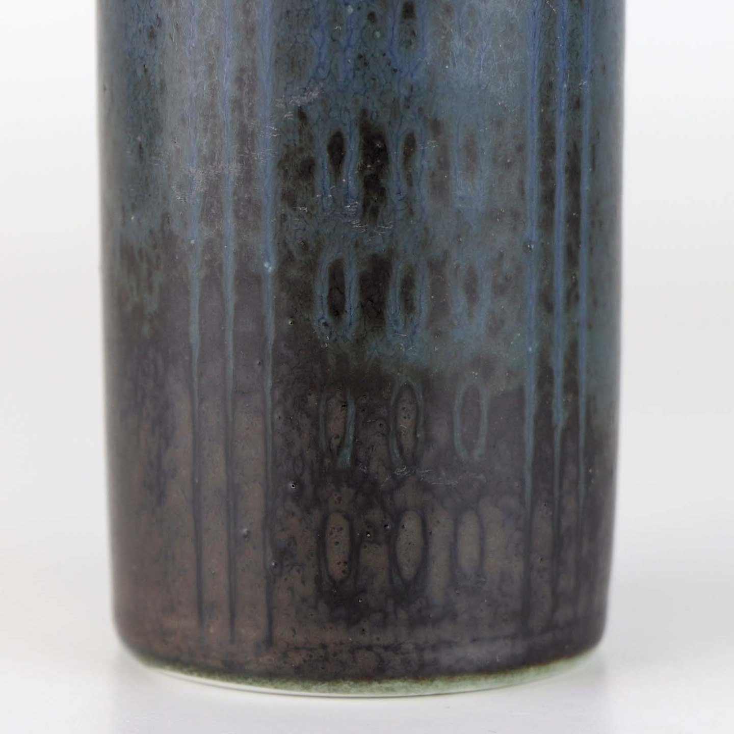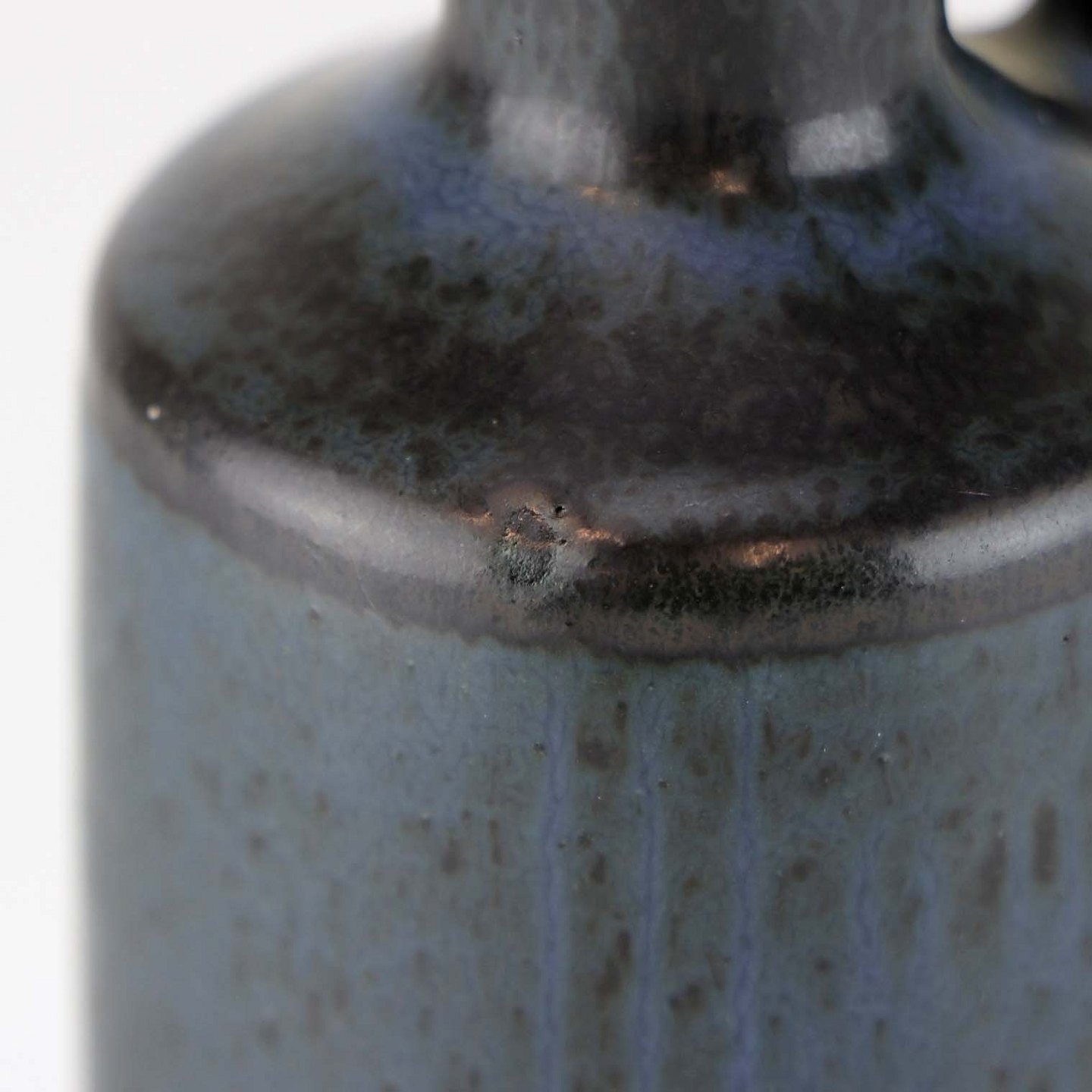 Vase i stentøj med hank med blåsort glasur samt abstrakt mønster af linjer og ovale cirkler.