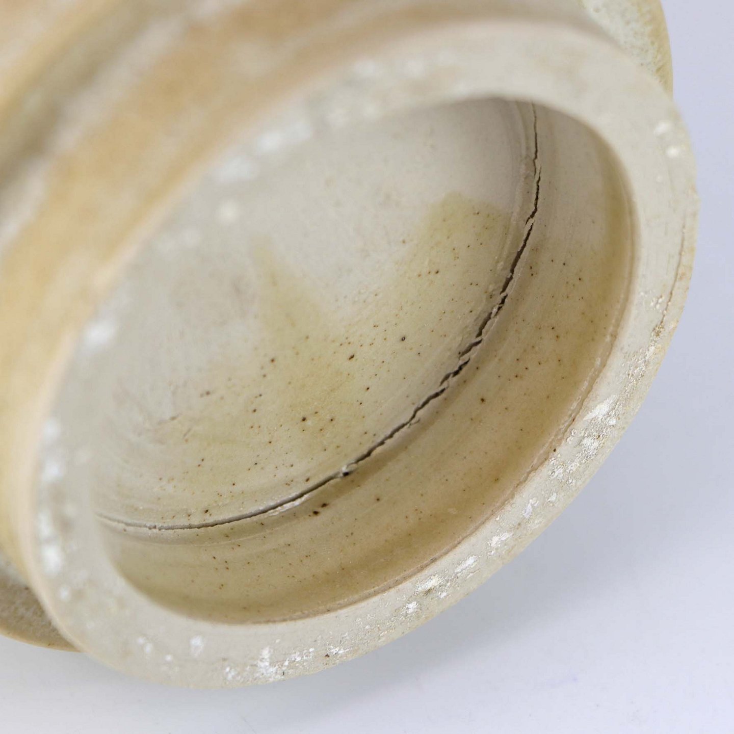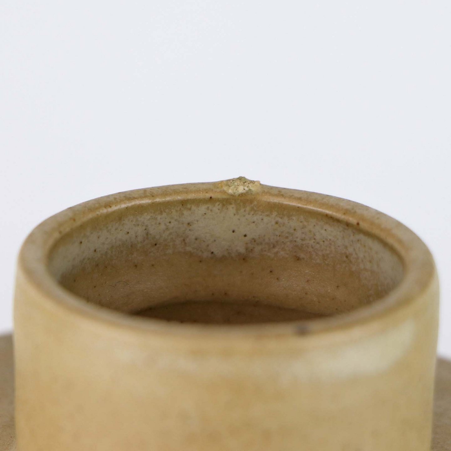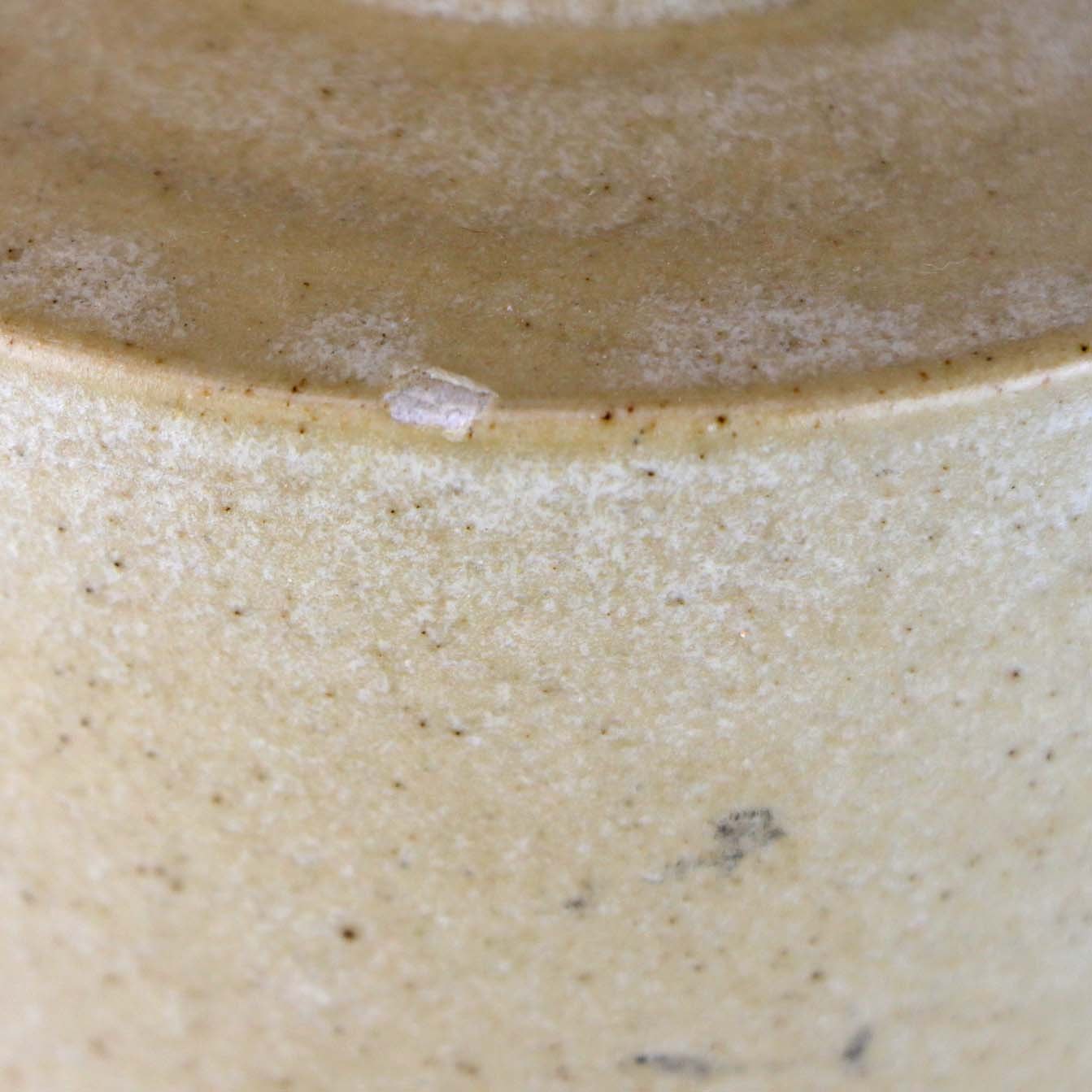 Fremstår med mindre ujævnhed ved topkanten samt nøk i glasuren og brænderevne ved den påsatte bund.