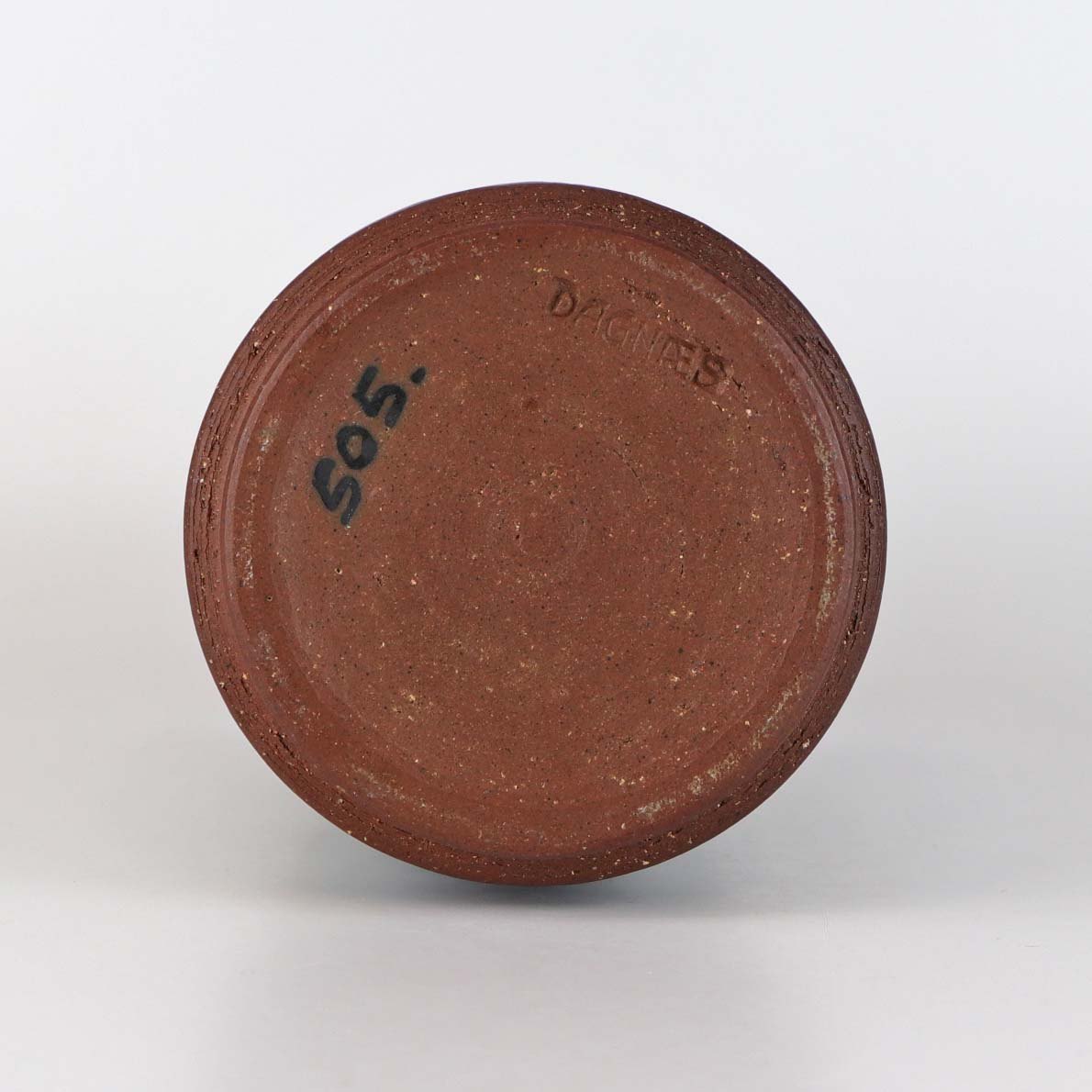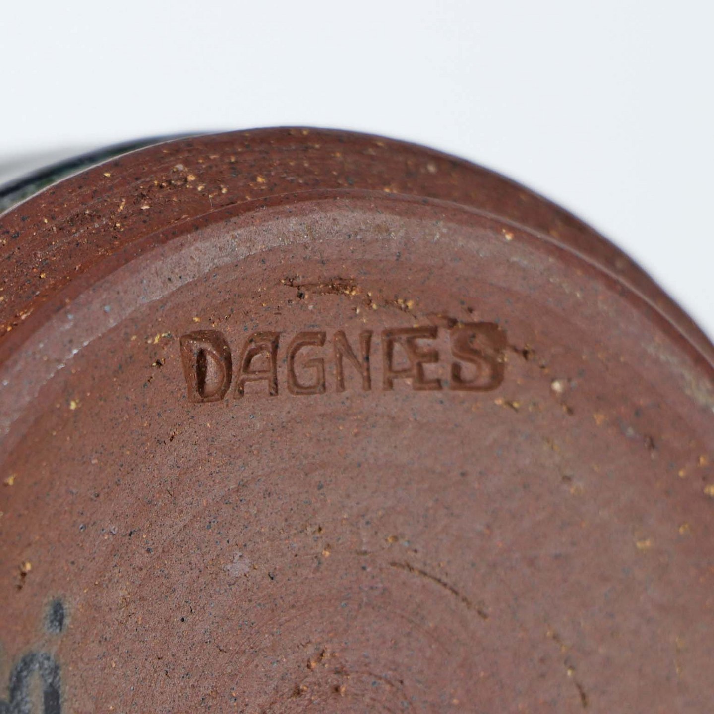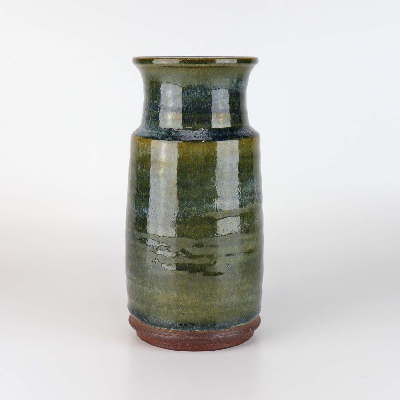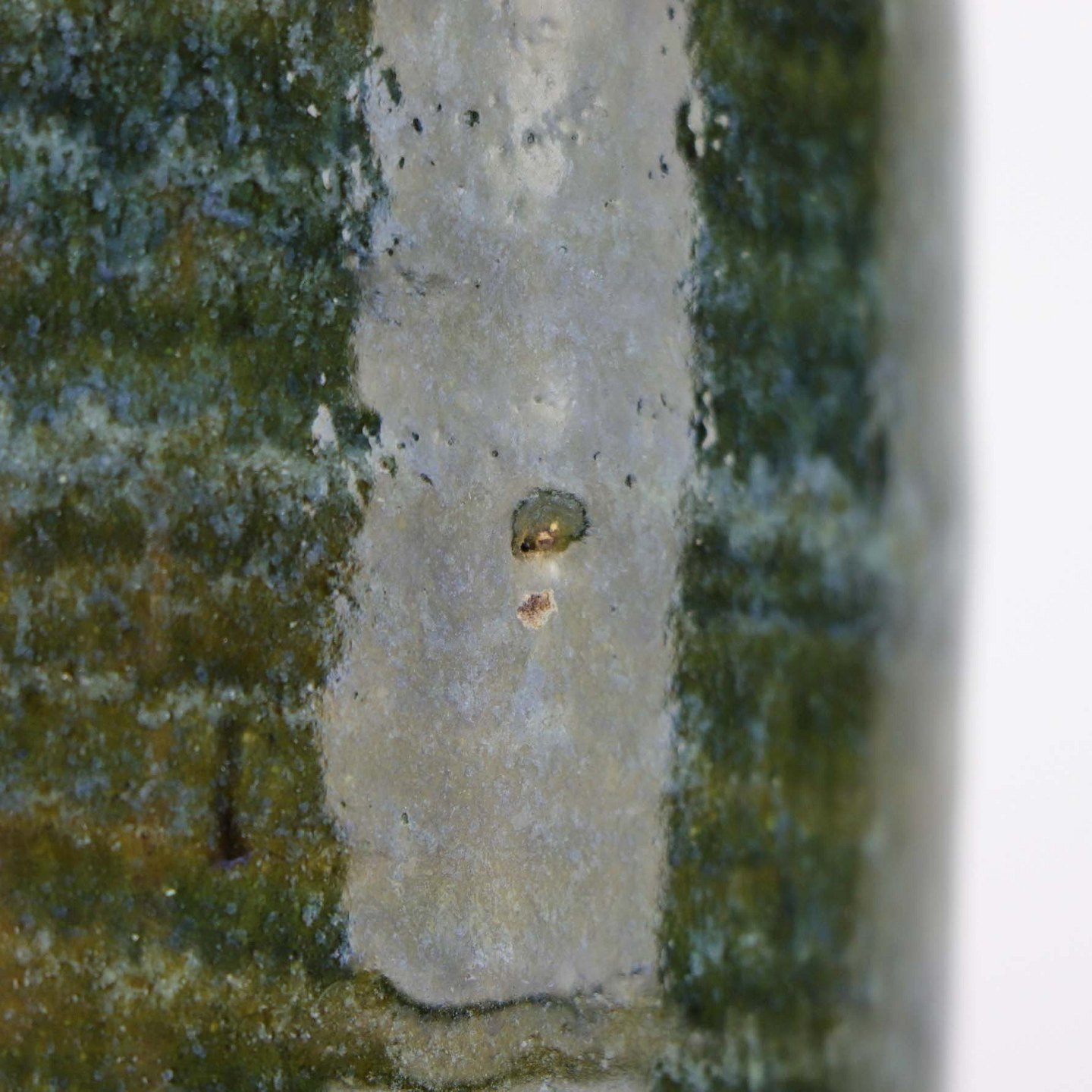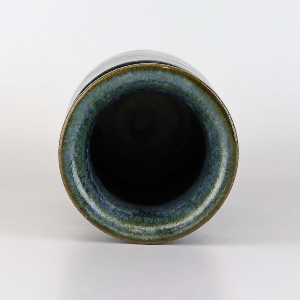 Vase i keramik med glasfuld glasering i blå og grønne nuancer.
