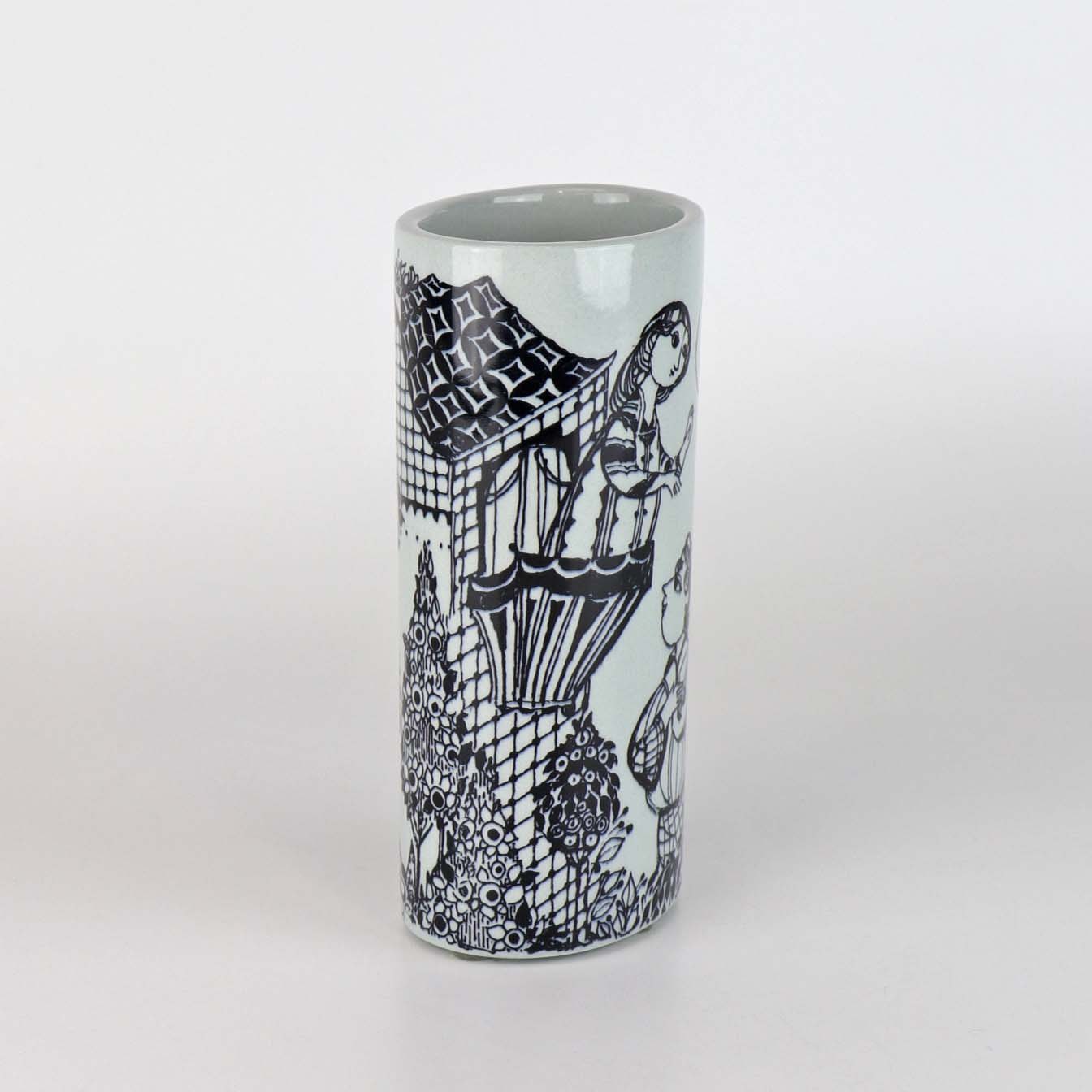 Oval vase i porcelæn med motiv i sort streg af kvinde på balkon med syngende mand og titlen Julia. Nr. 3189