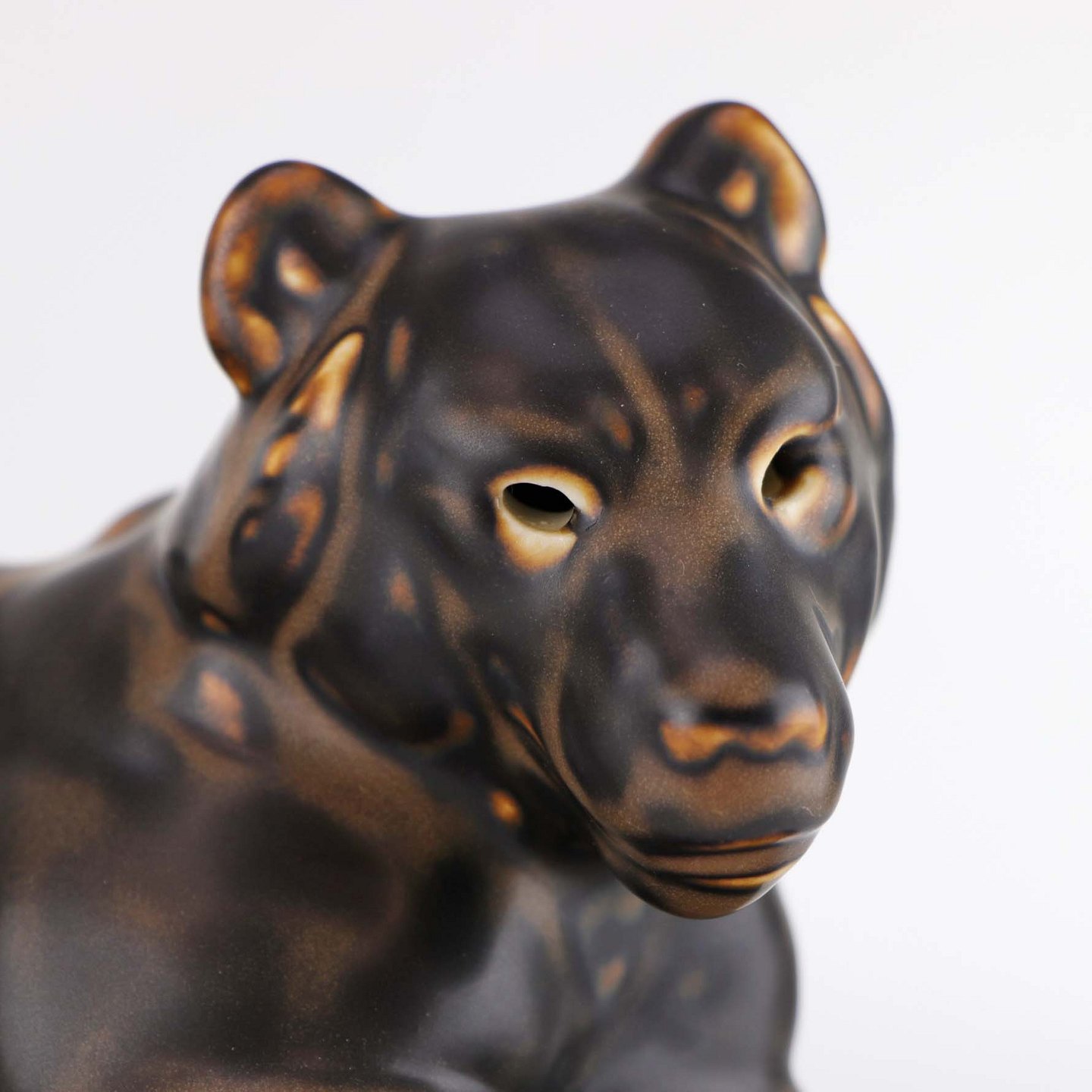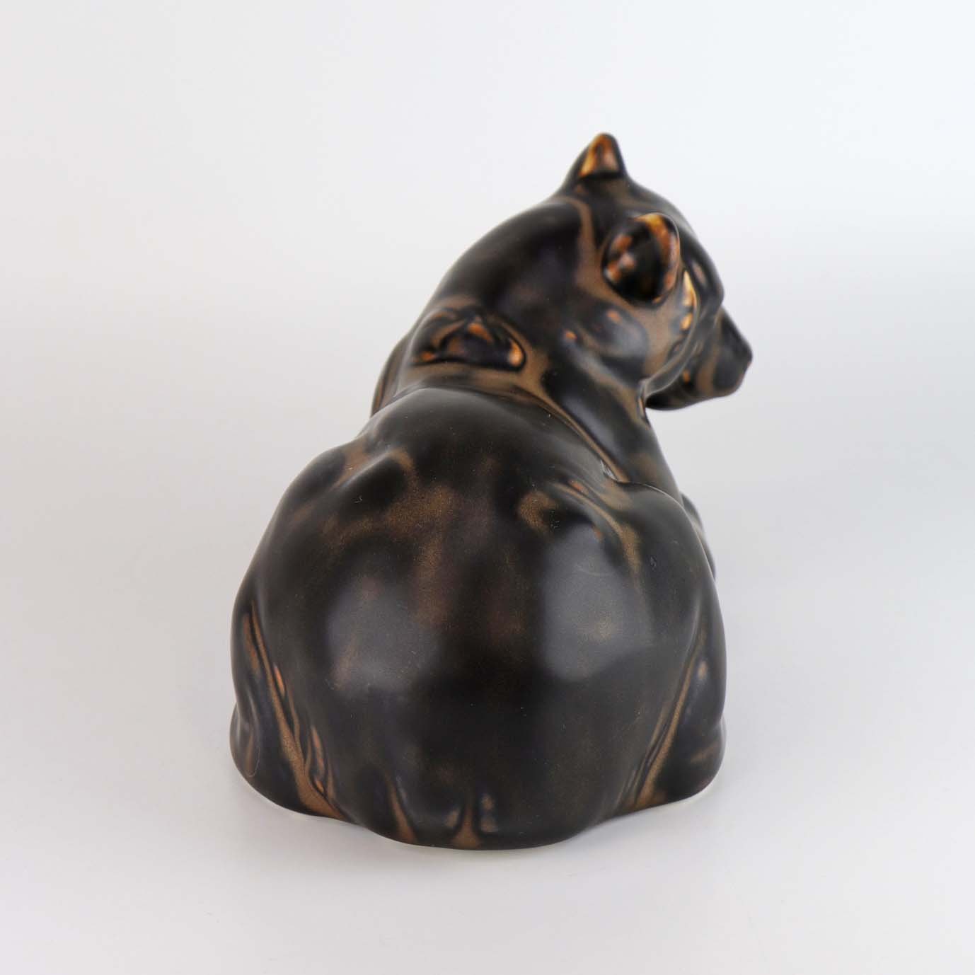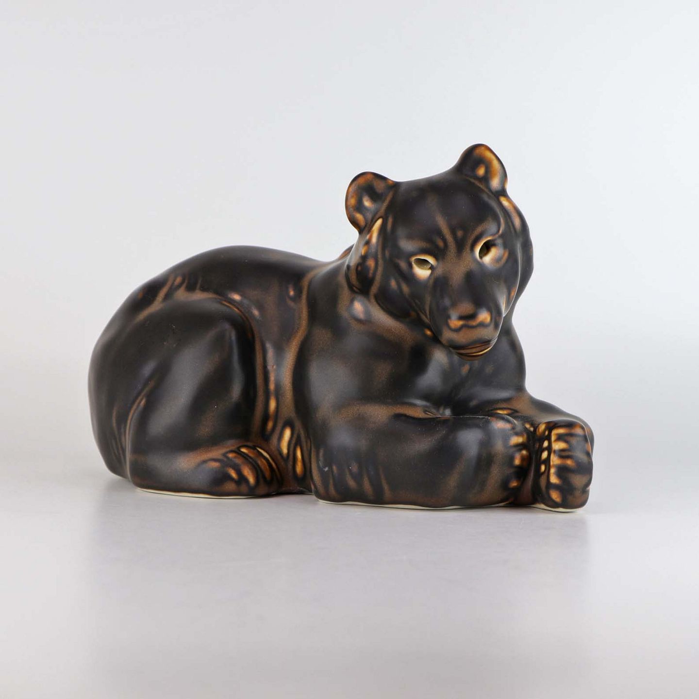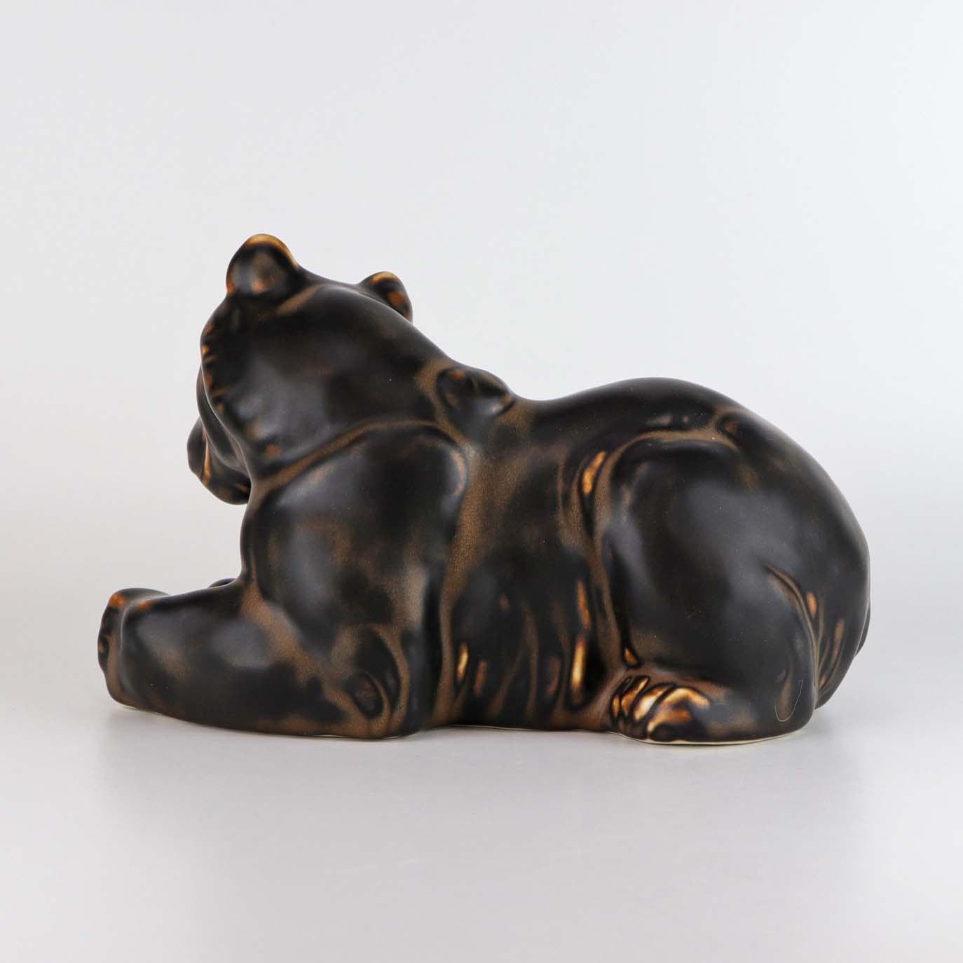 Figur i porcelæn med motiv af en liggende brun bjørn. Nr. 2/520