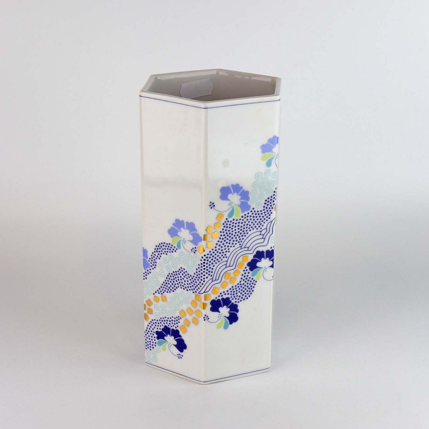 Sekskantet vase hvidt porcelæn med blå og grøn streg dekoreret med blomster og guld motiv. Nr. 1 016 473