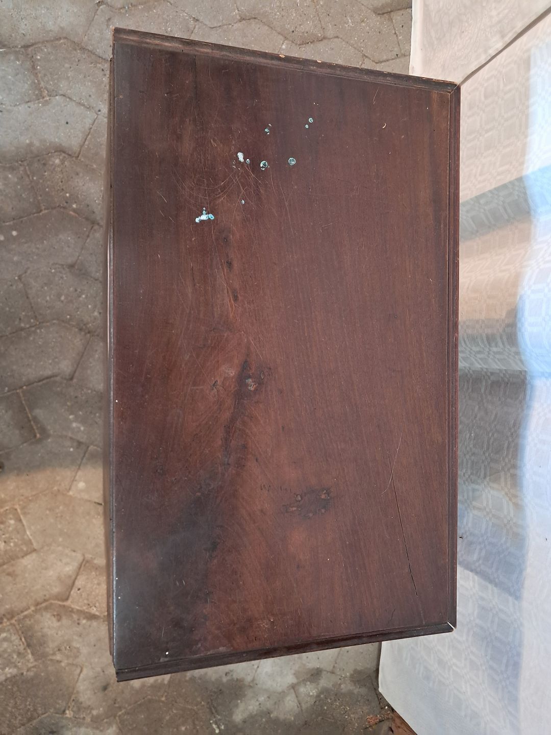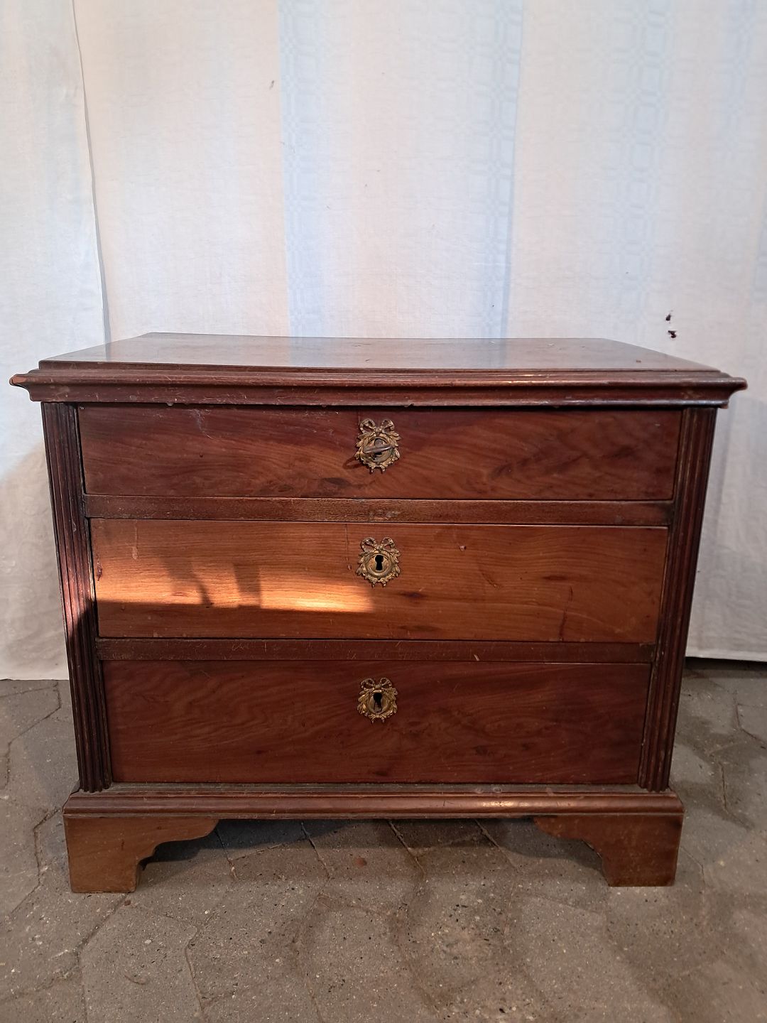 Den har brugsspor og der sidder en nøgle fast i øverste skuffe.