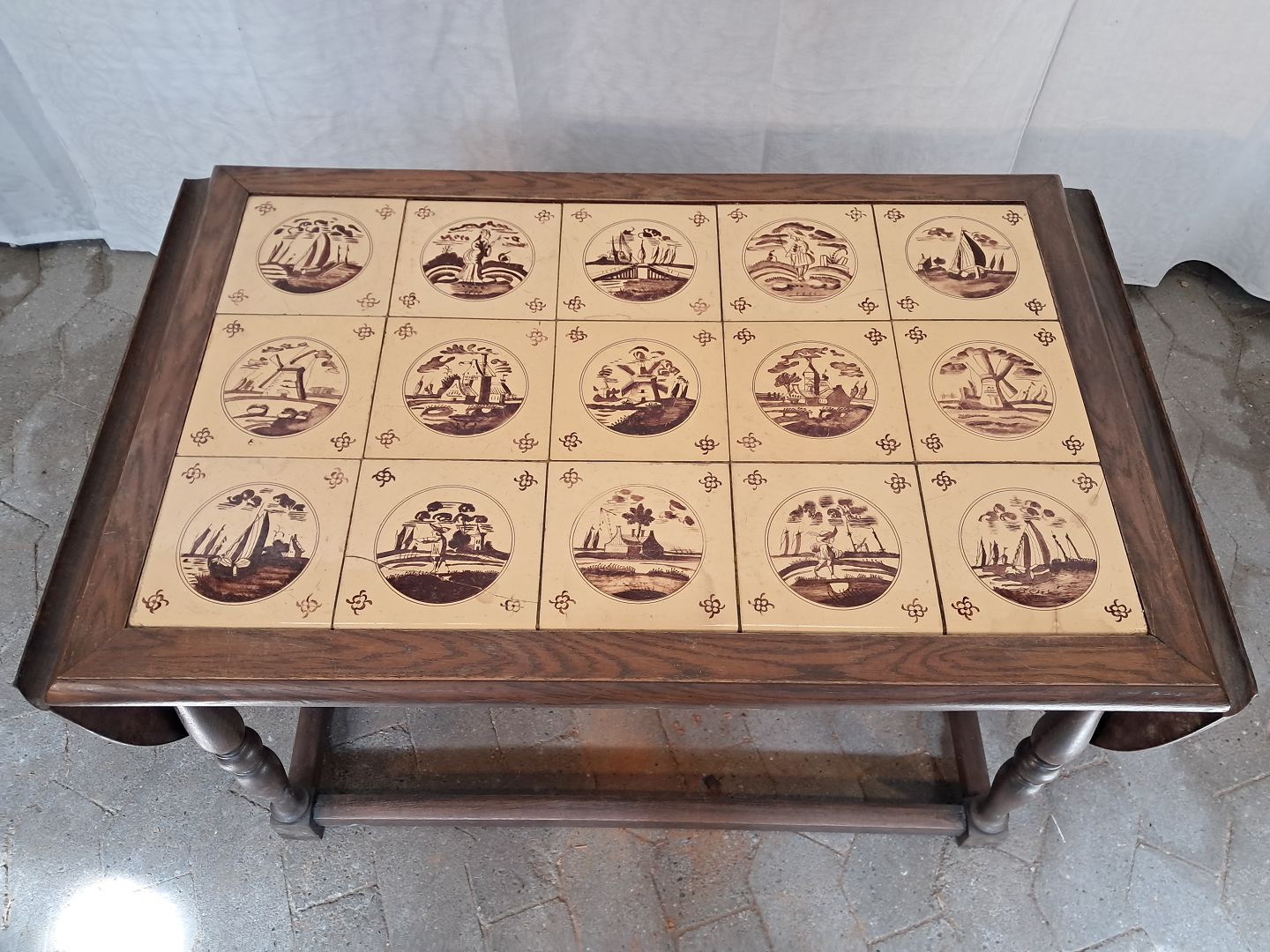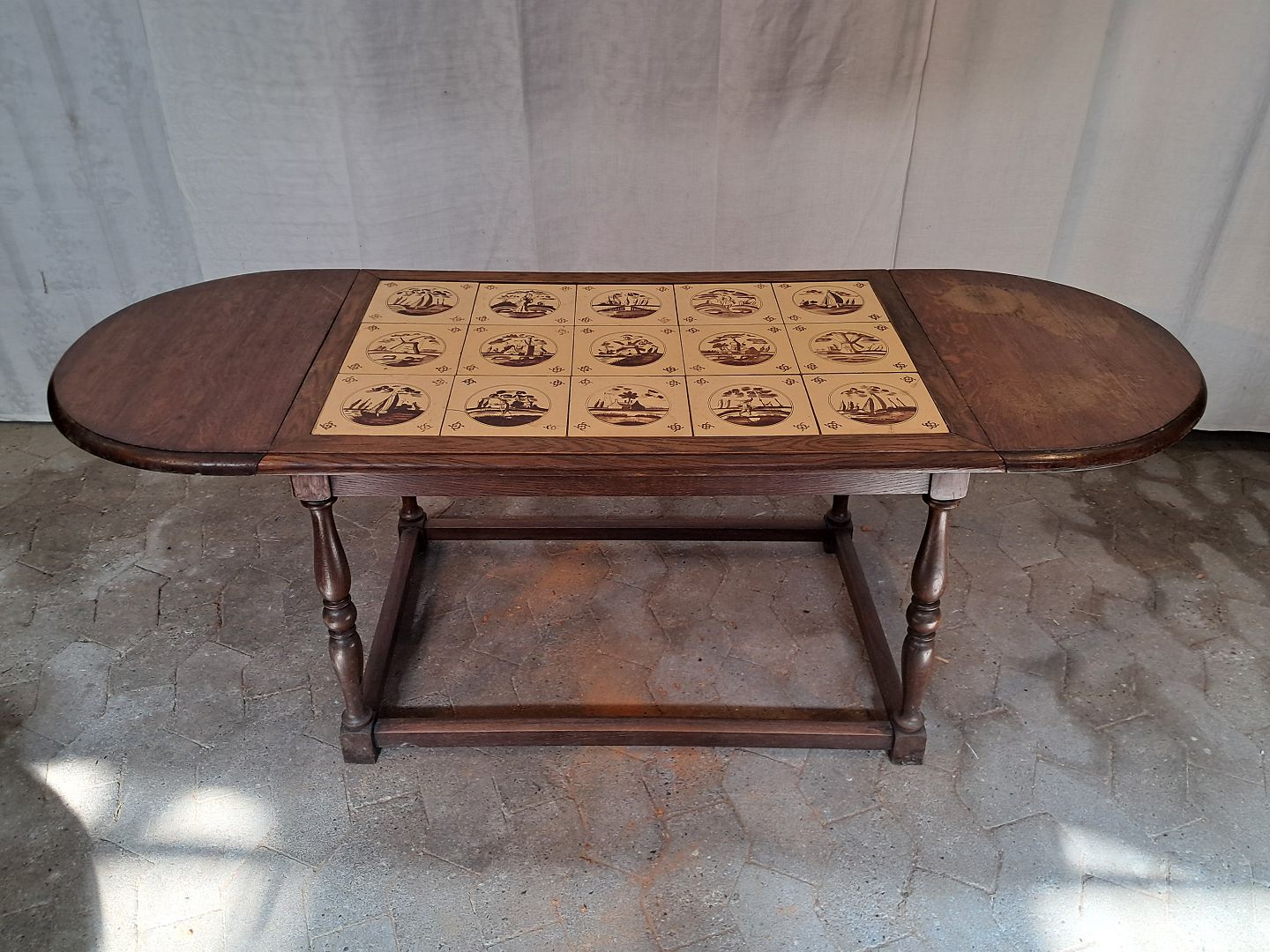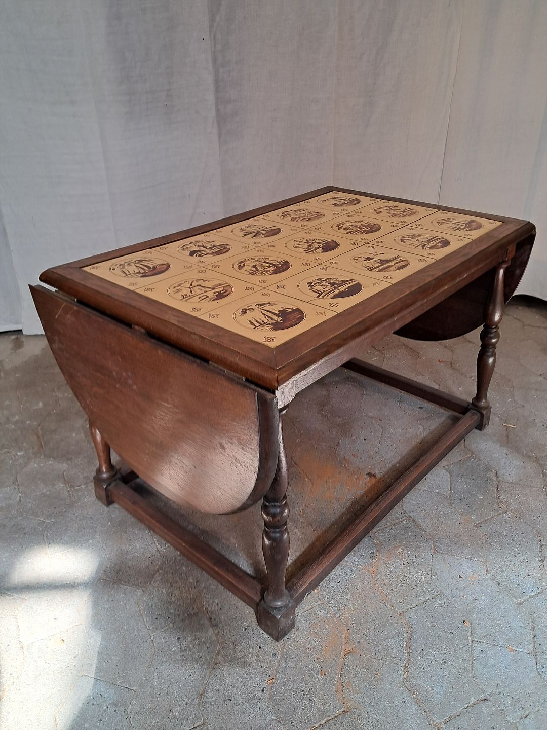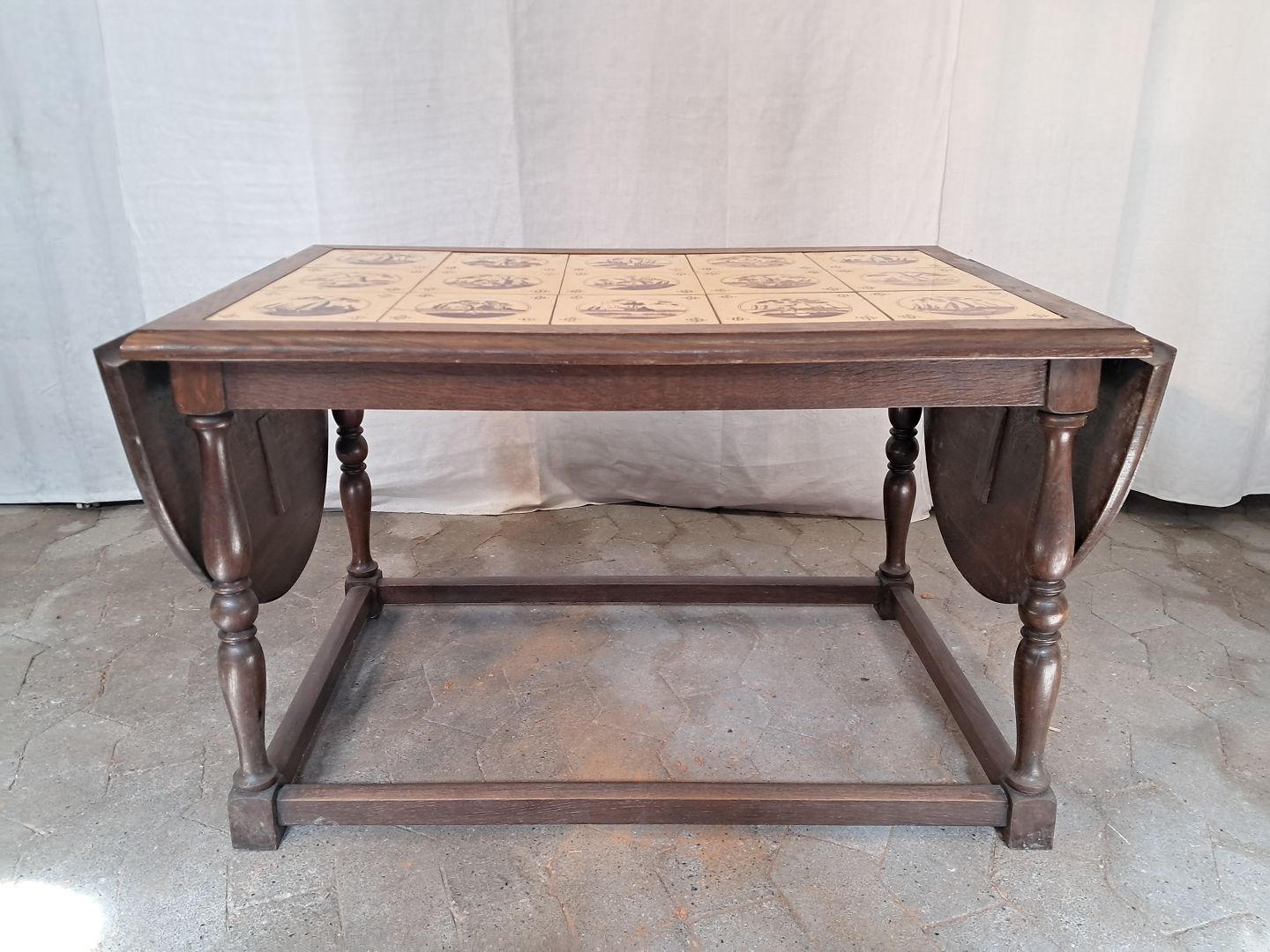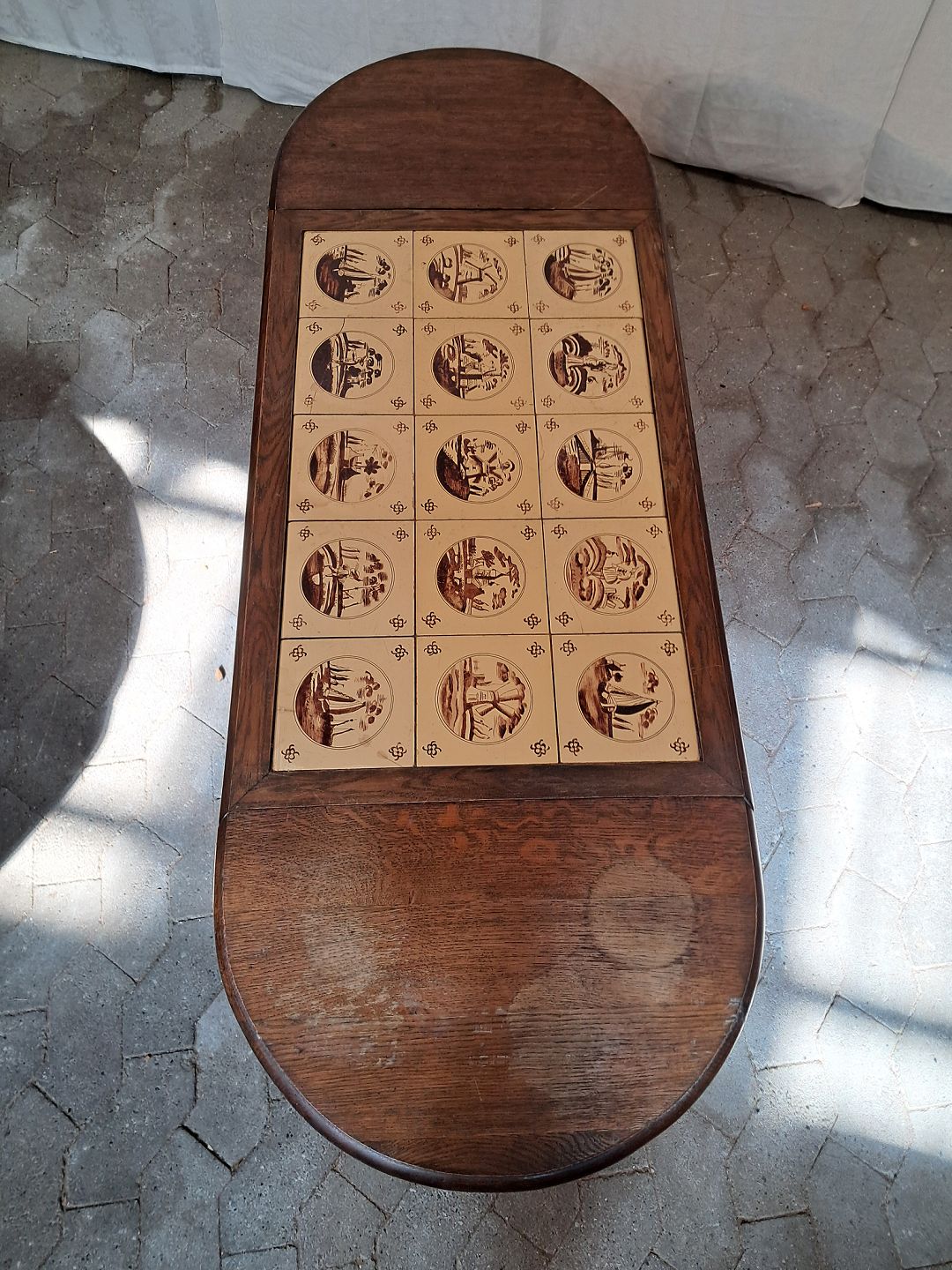Sofabord i massivt egetræ med kakler, fra 1930erne.