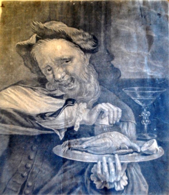Ubekendt kunstner (17. årh.): Mand med citron og kylling. Efter Danïel Boone, 1650. Mezzotinte på papir. Uden signatur. H: 17,5 cm. B: 15 cm.