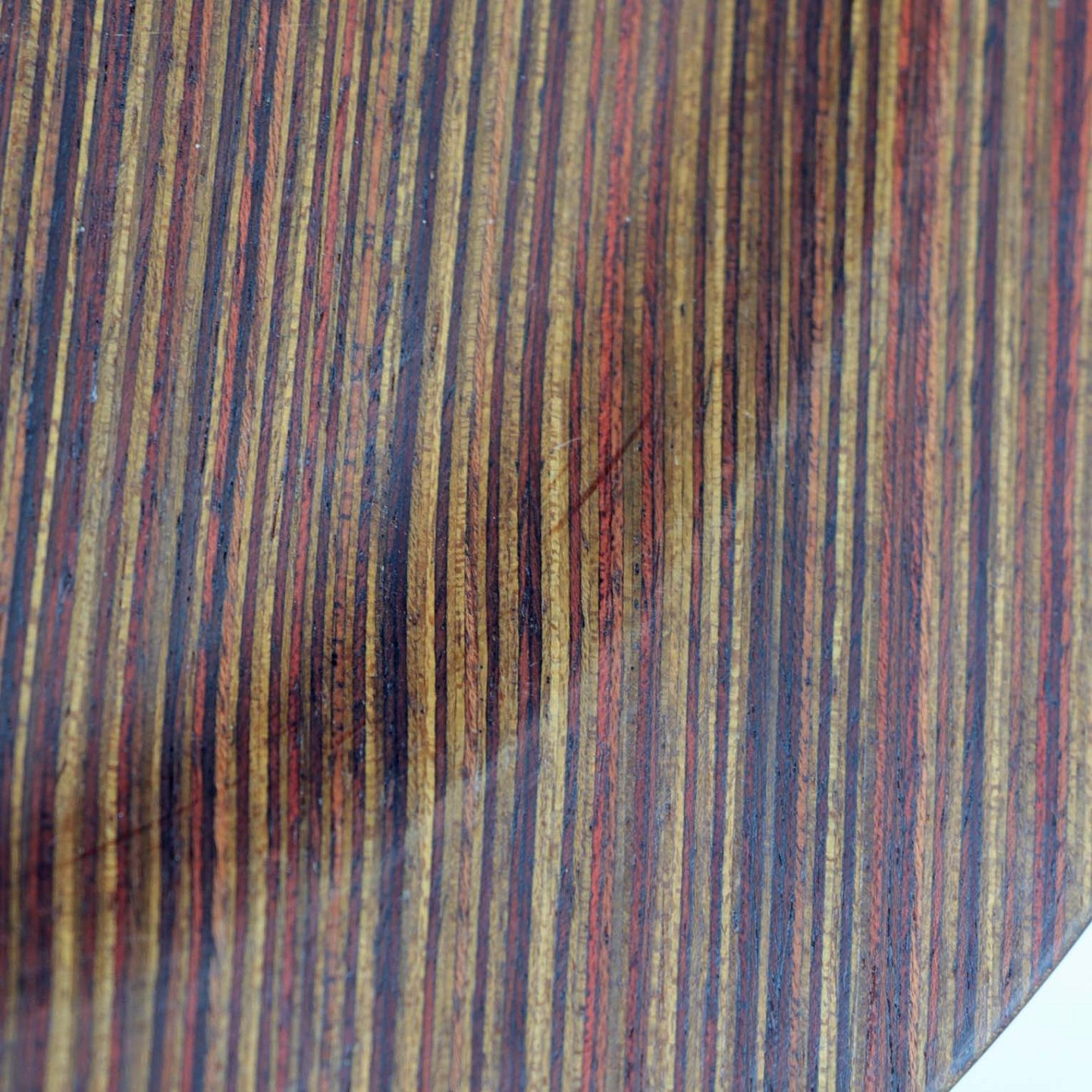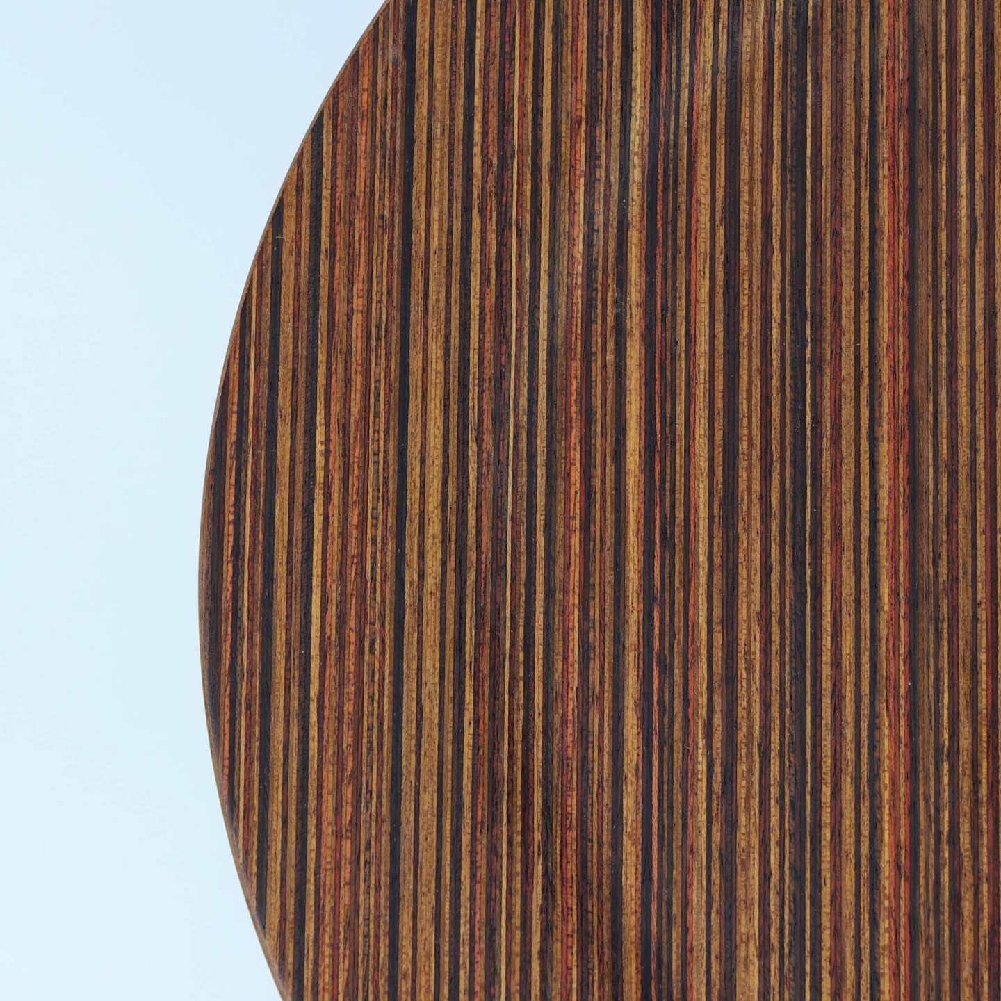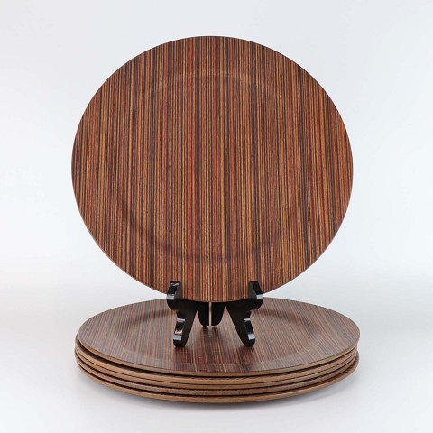 Et sæt med seks styk dækketallerkner i træ med stribet mønster i forskellige nuancer