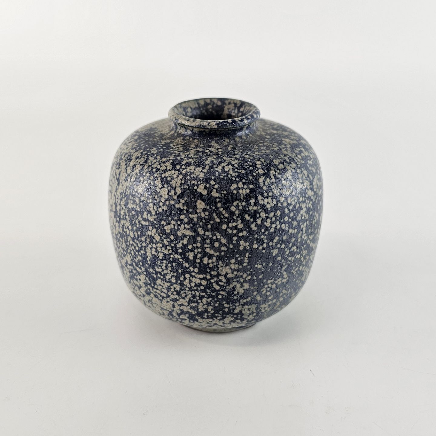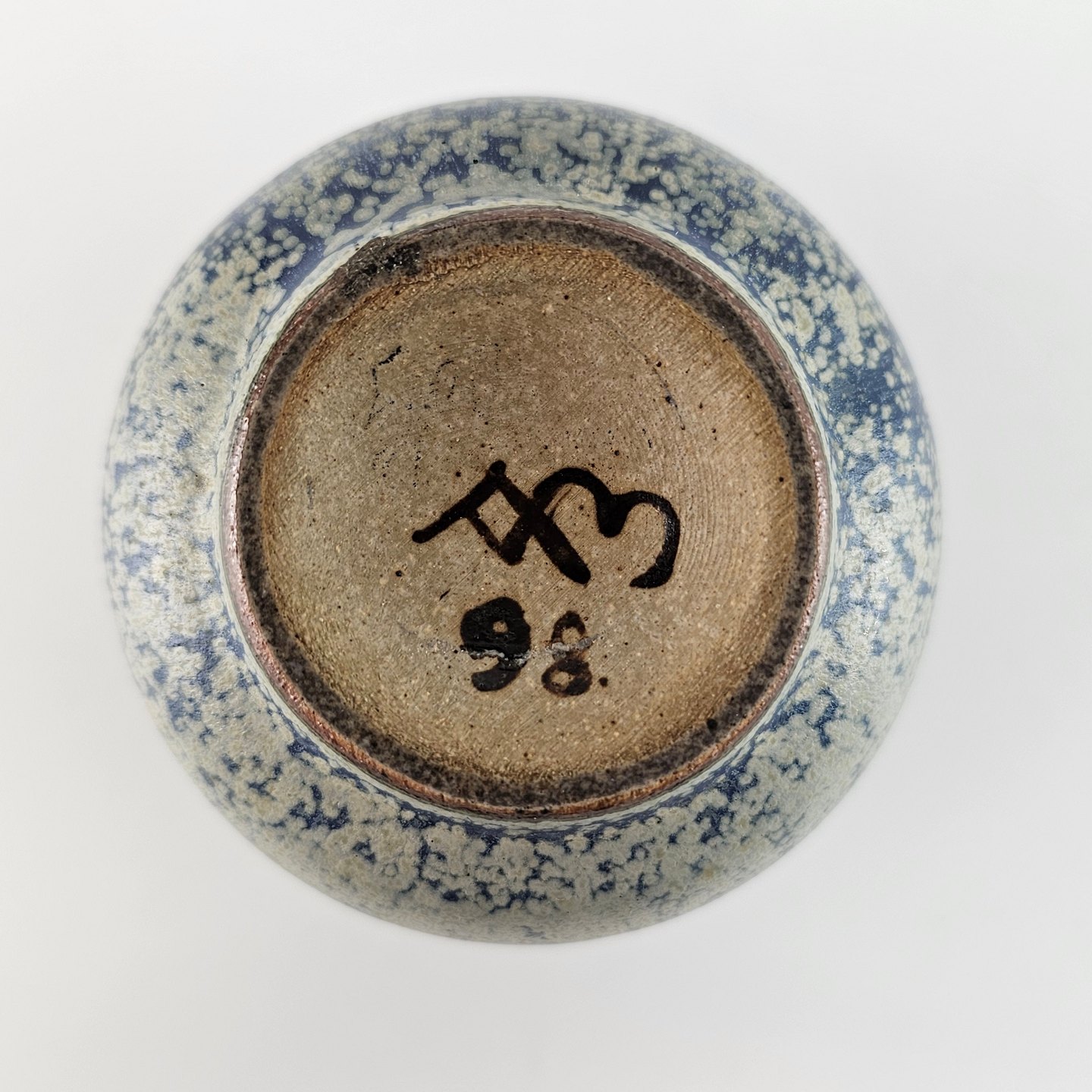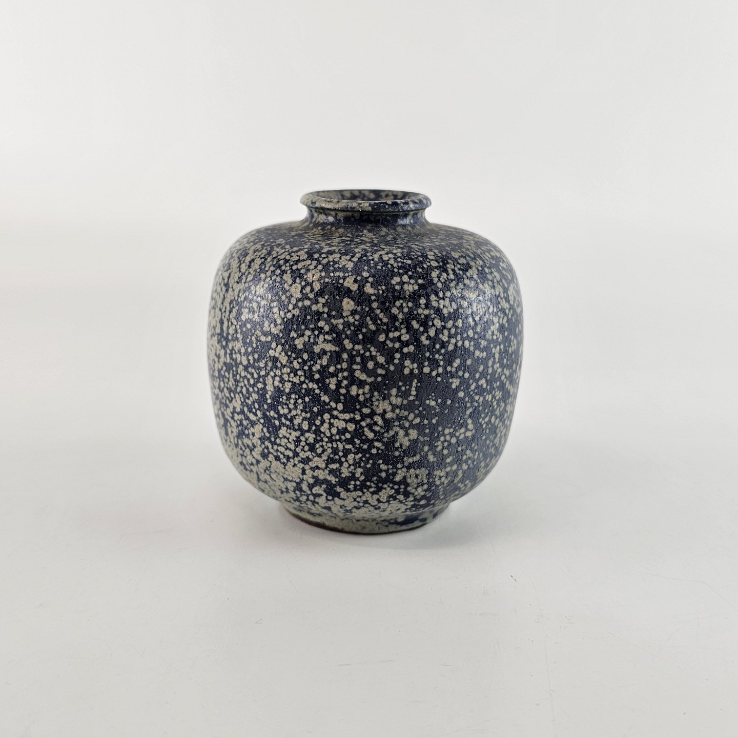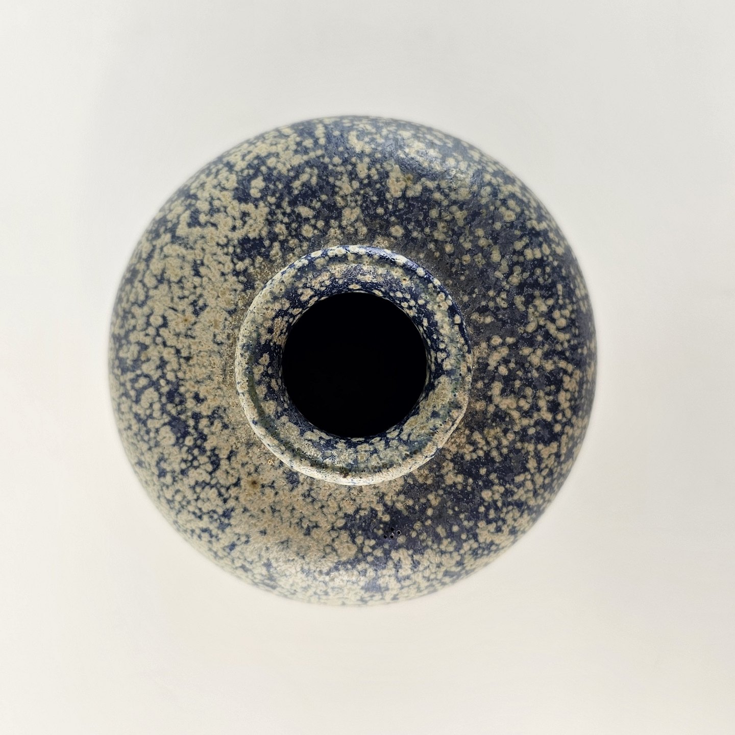Lav rund vase af stentøj. Blå og hvidmeleret udseende.