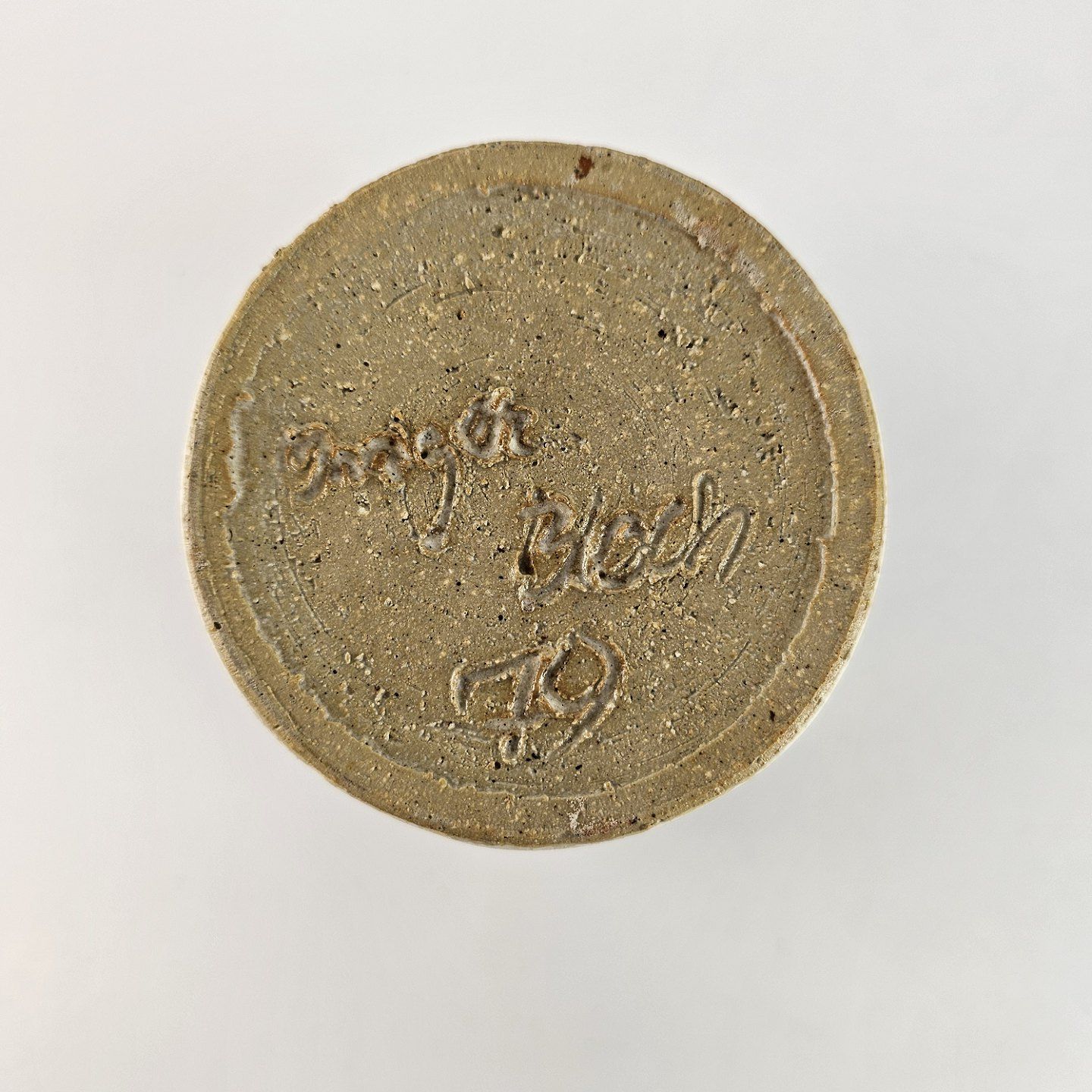 Krukke af stentøj, med to etager, i hvide og blå nuancer.