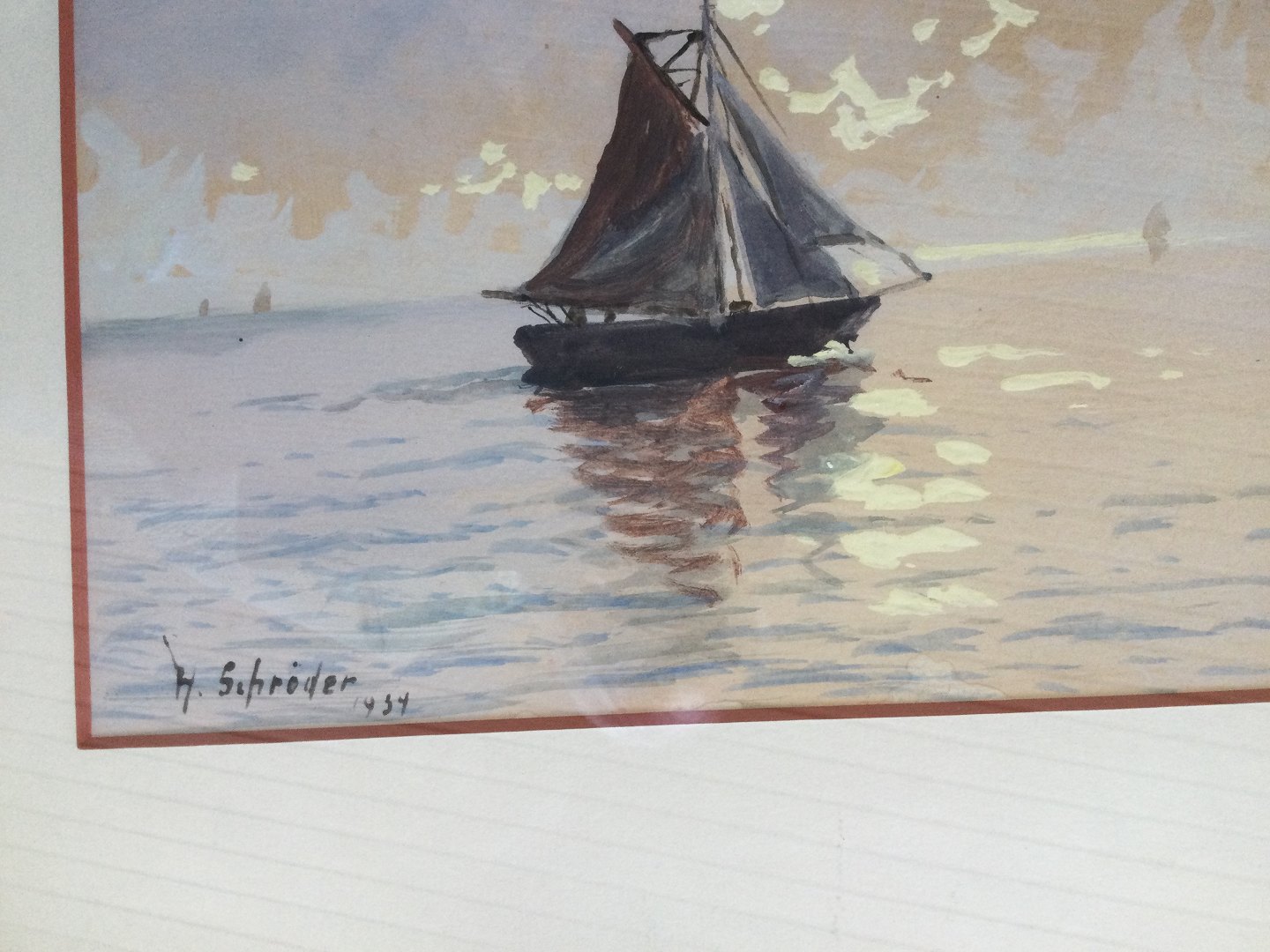 Gouache af Heinrich Schröder 1934 - Marine med sejlskibe ved solnedgang.