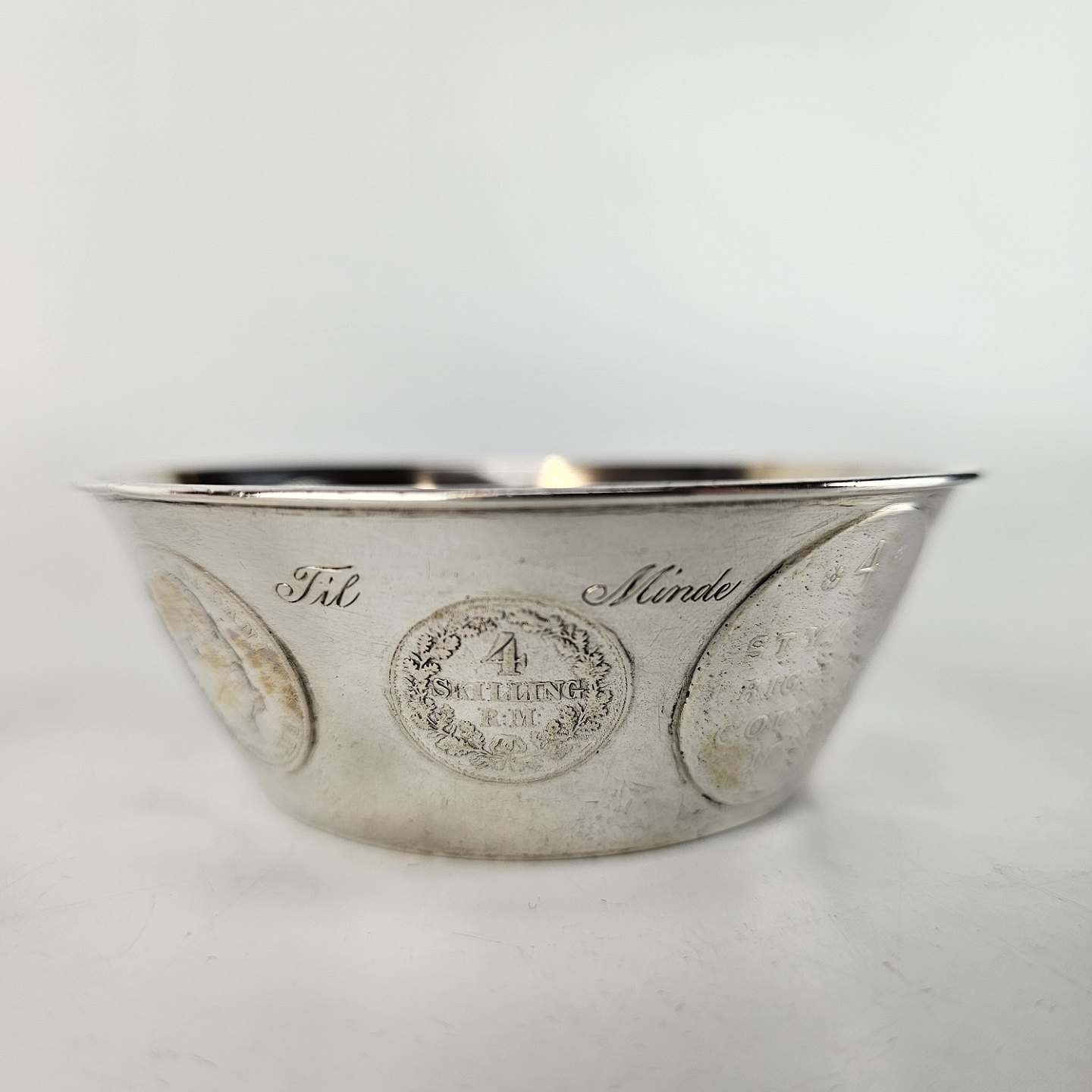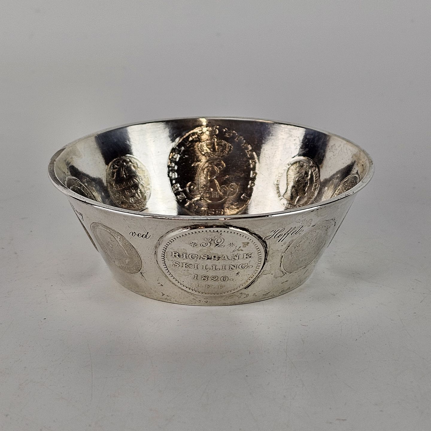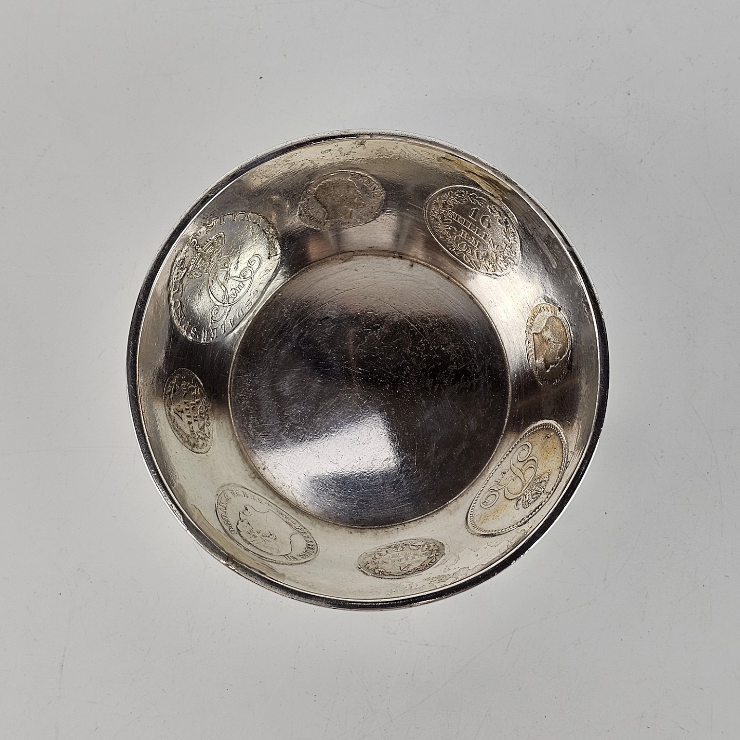 Bæger af sølv med otte gamle indsatte mønter.